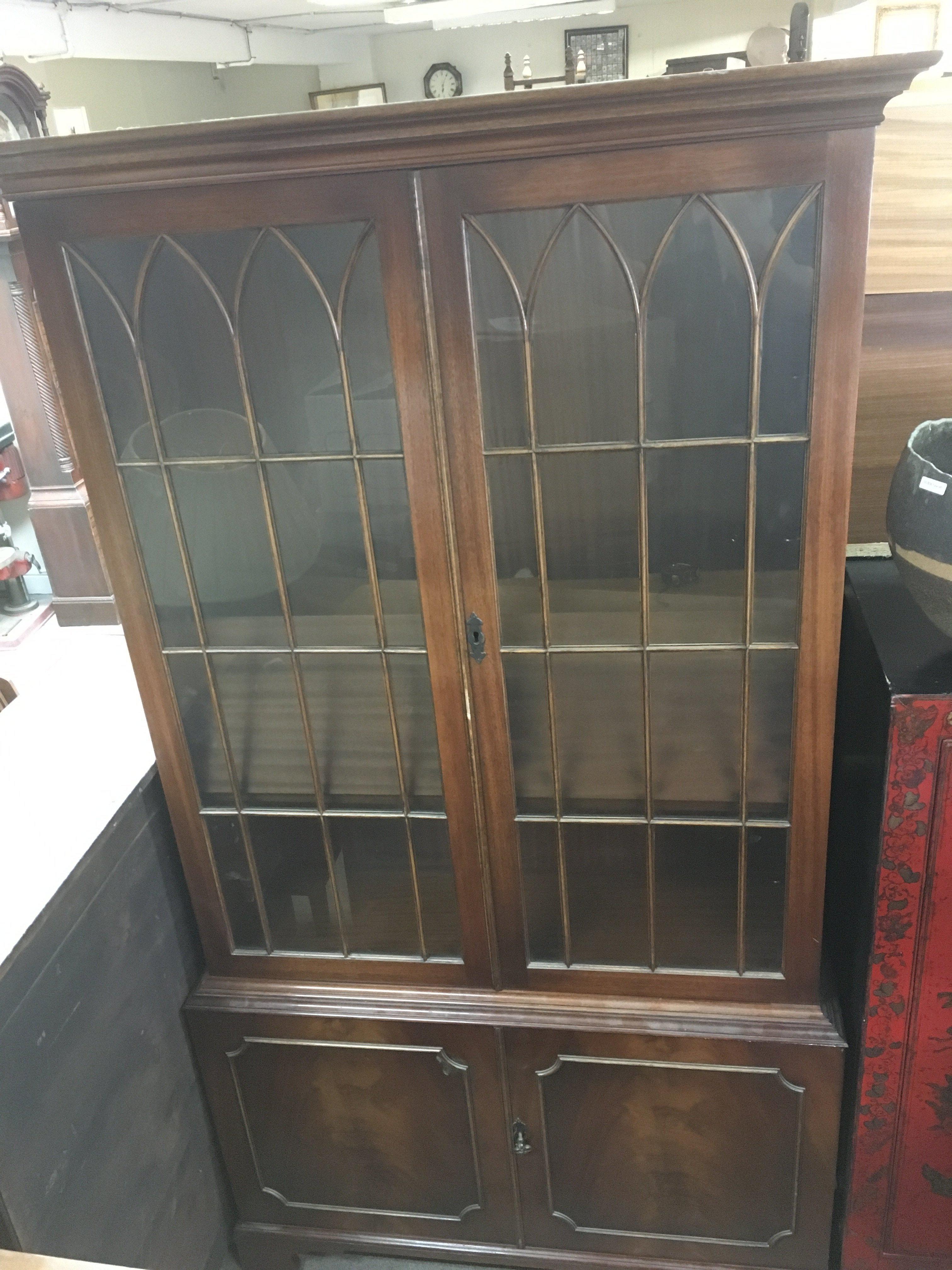 A mahogany bookcase with glazed doors above cupboards, dimensions 185x90x34cm