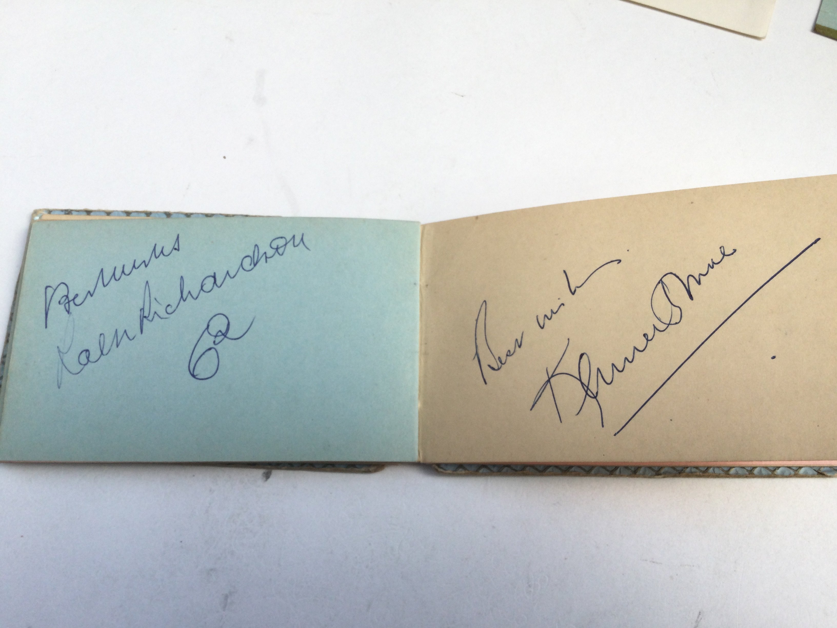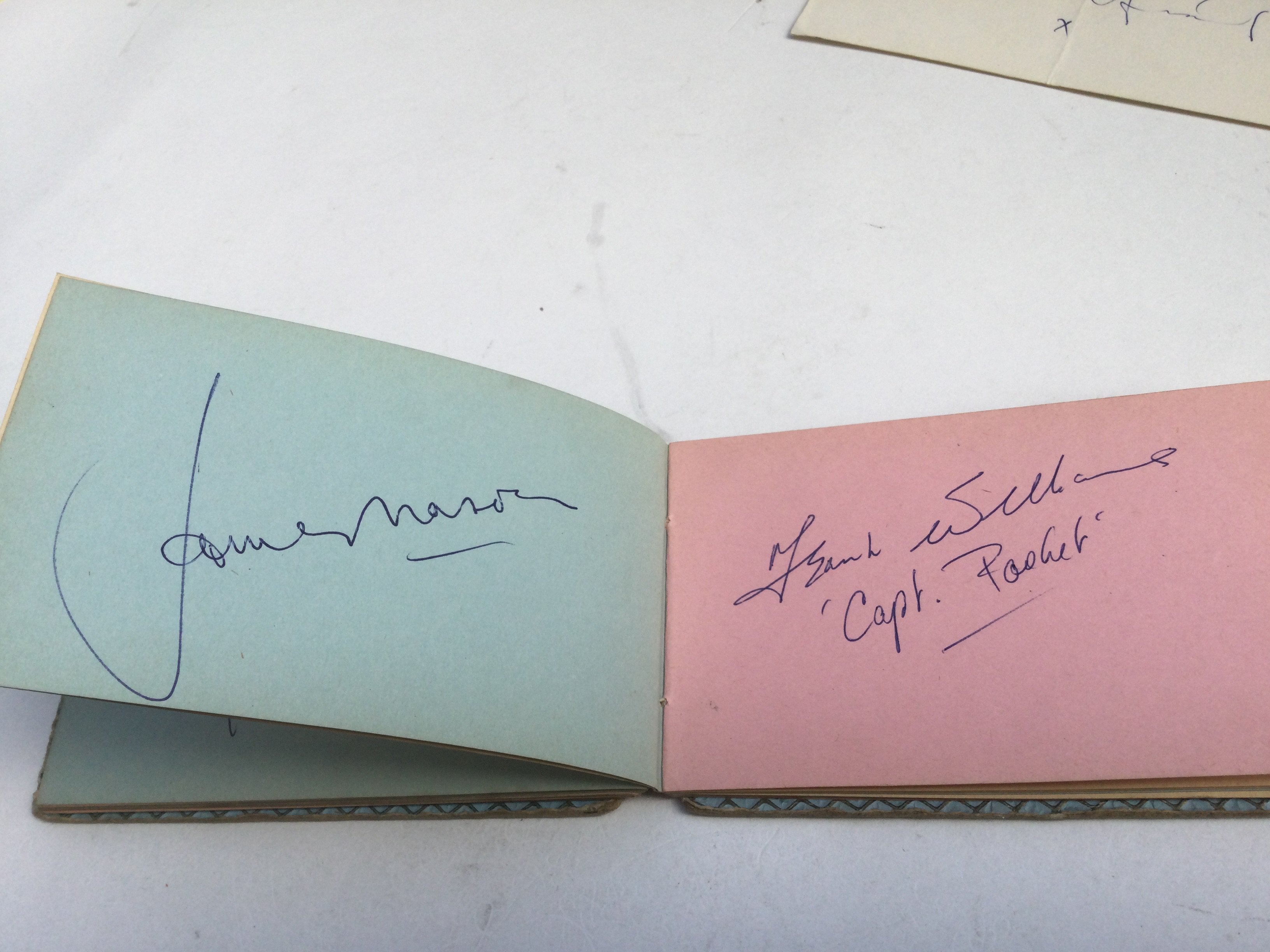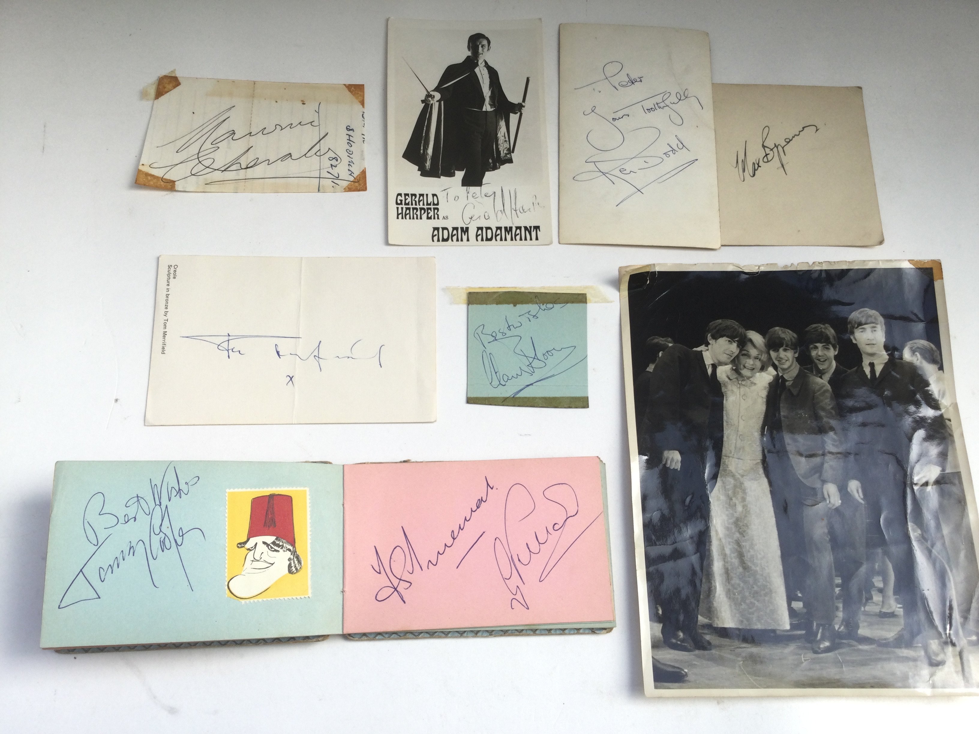 A collection of autographs both loose and in a booklet comprising James Mason, Ralph Richardson, Tommy Cooper, Kenneth Horne and others plus a press photo of The Beatles with Marlene Dietrich.