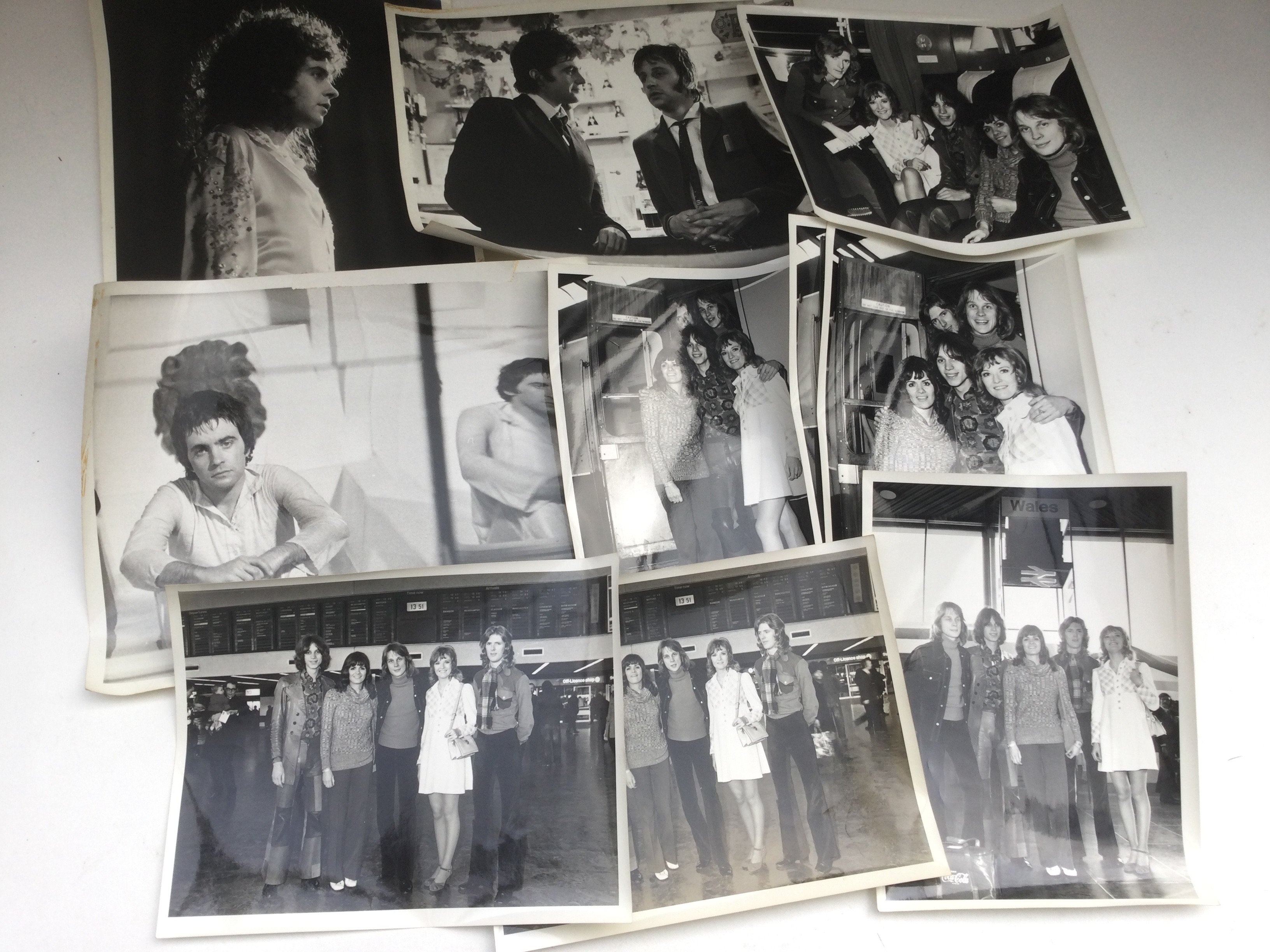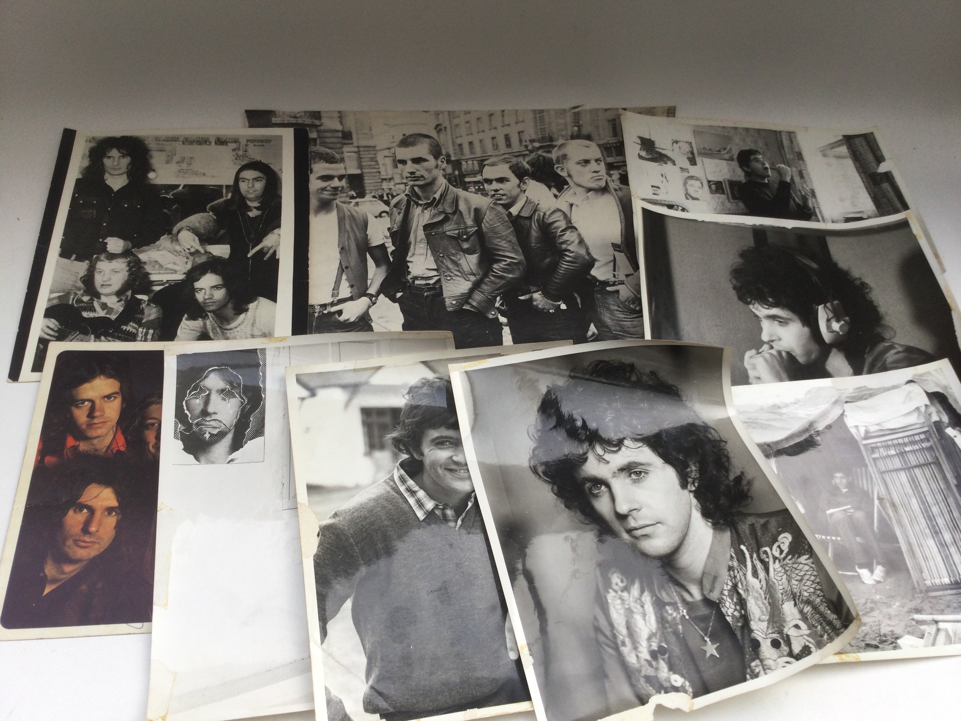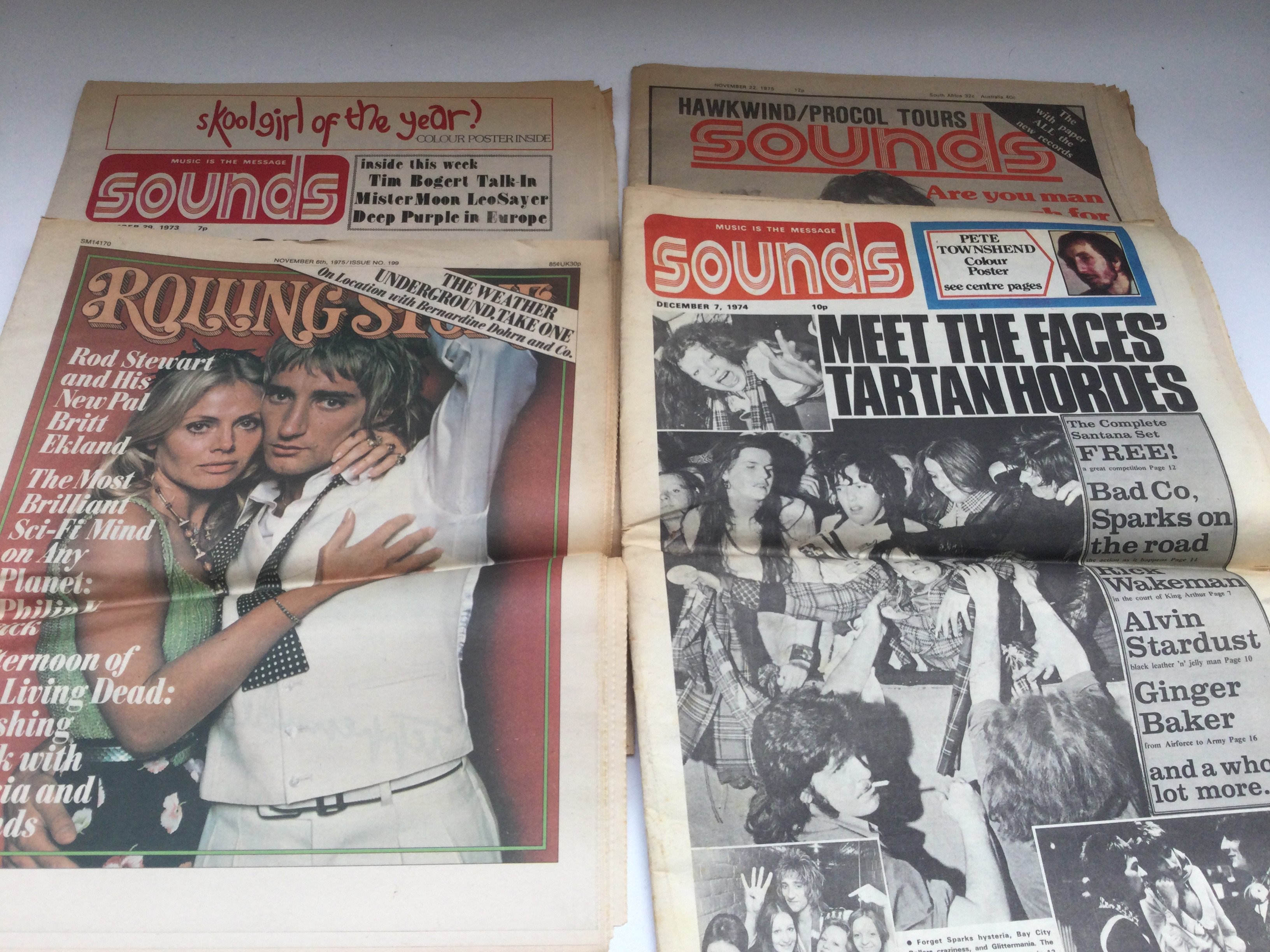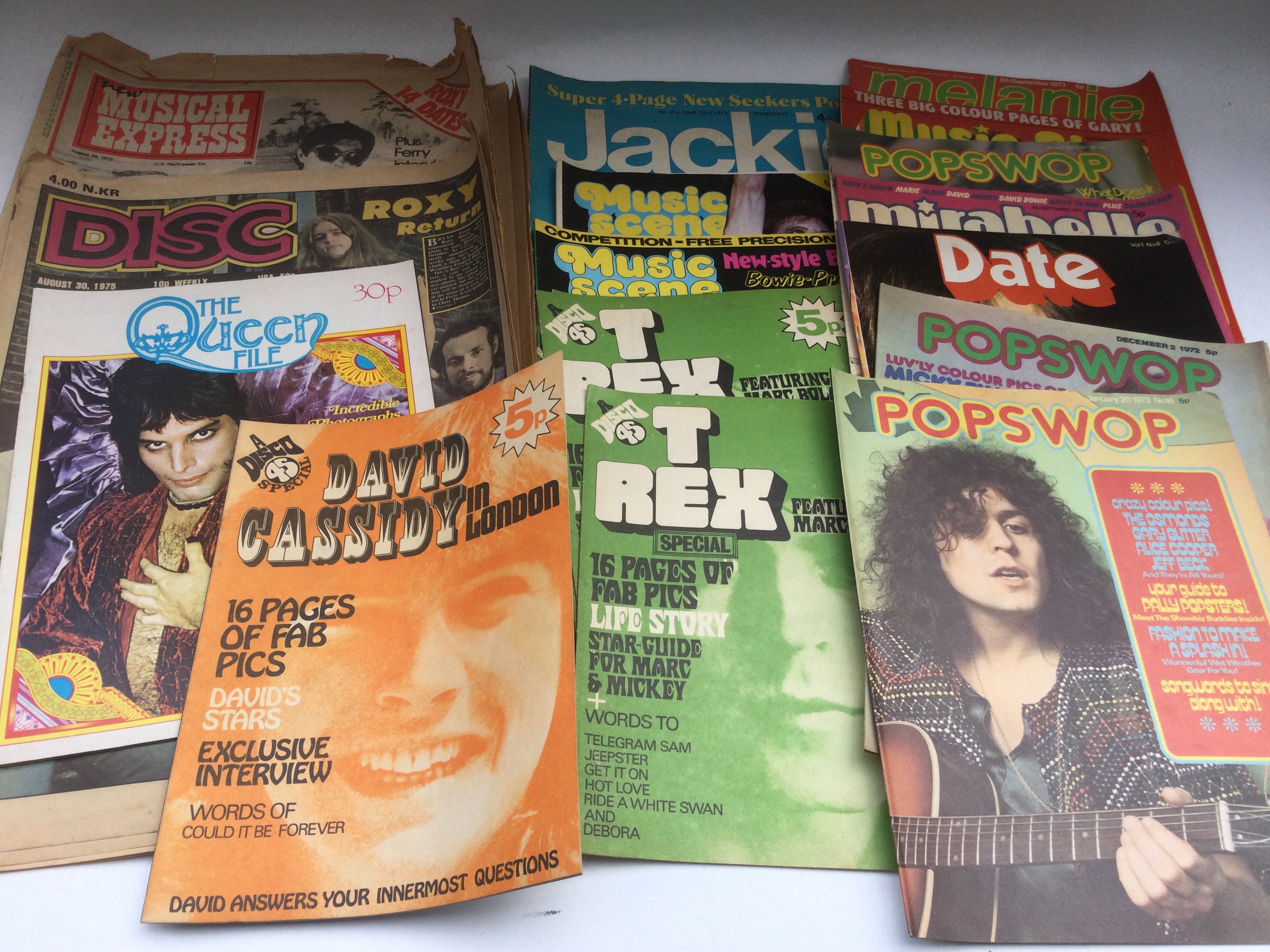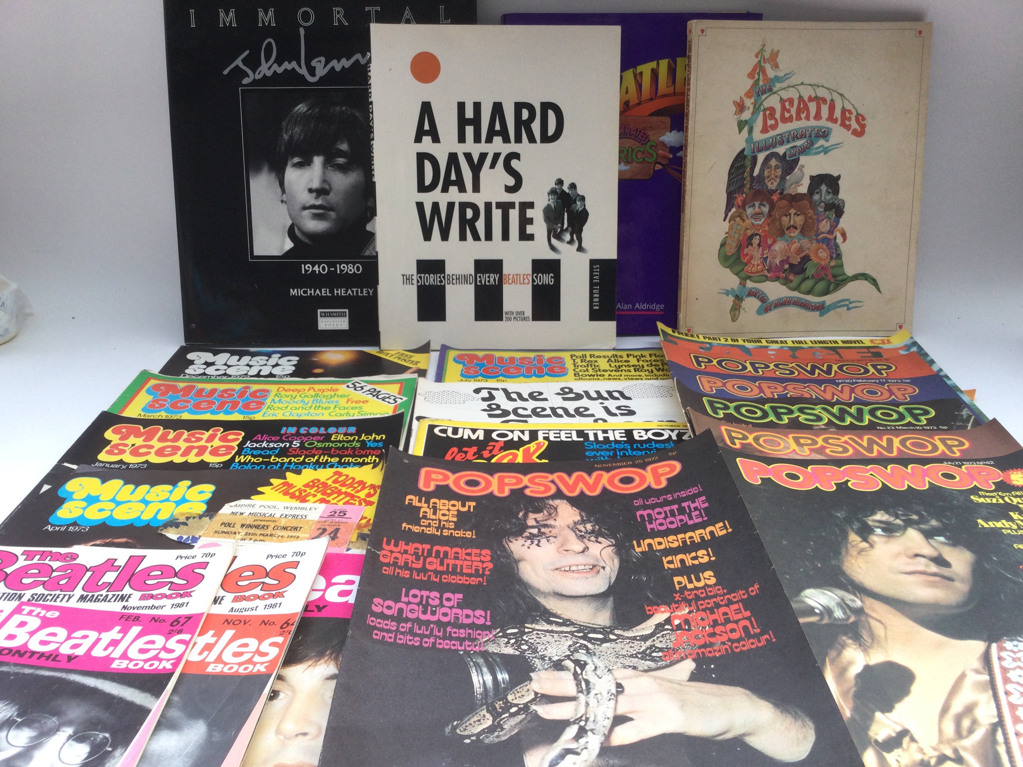 A case of music ephemera including a signed Slade publicity card, press photos, vintage music publications including NME, Sounds, Popswop, Beatles books including a 1969 'Beatles Illustrated Lyrics' by Alan Aldridge and other items.