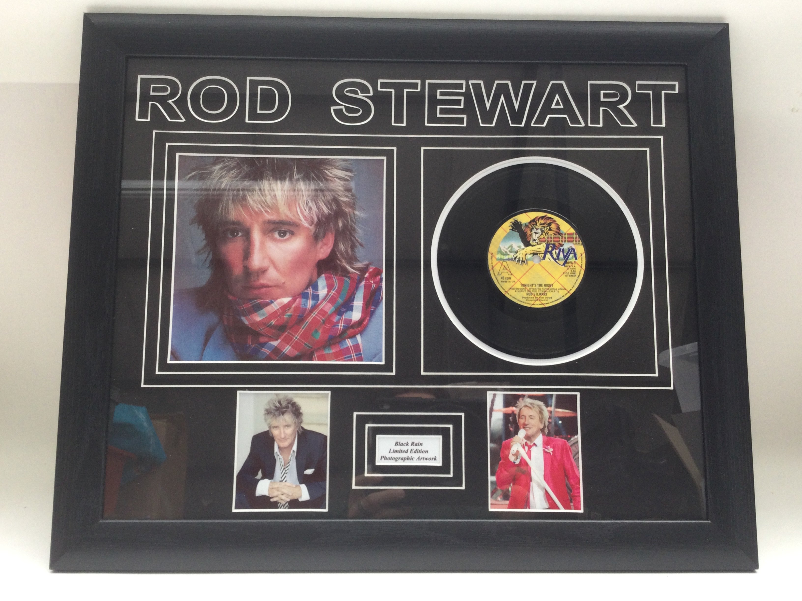 A framed and glazed Rod Stewart display, approx 57.5cm x 47.5cm.