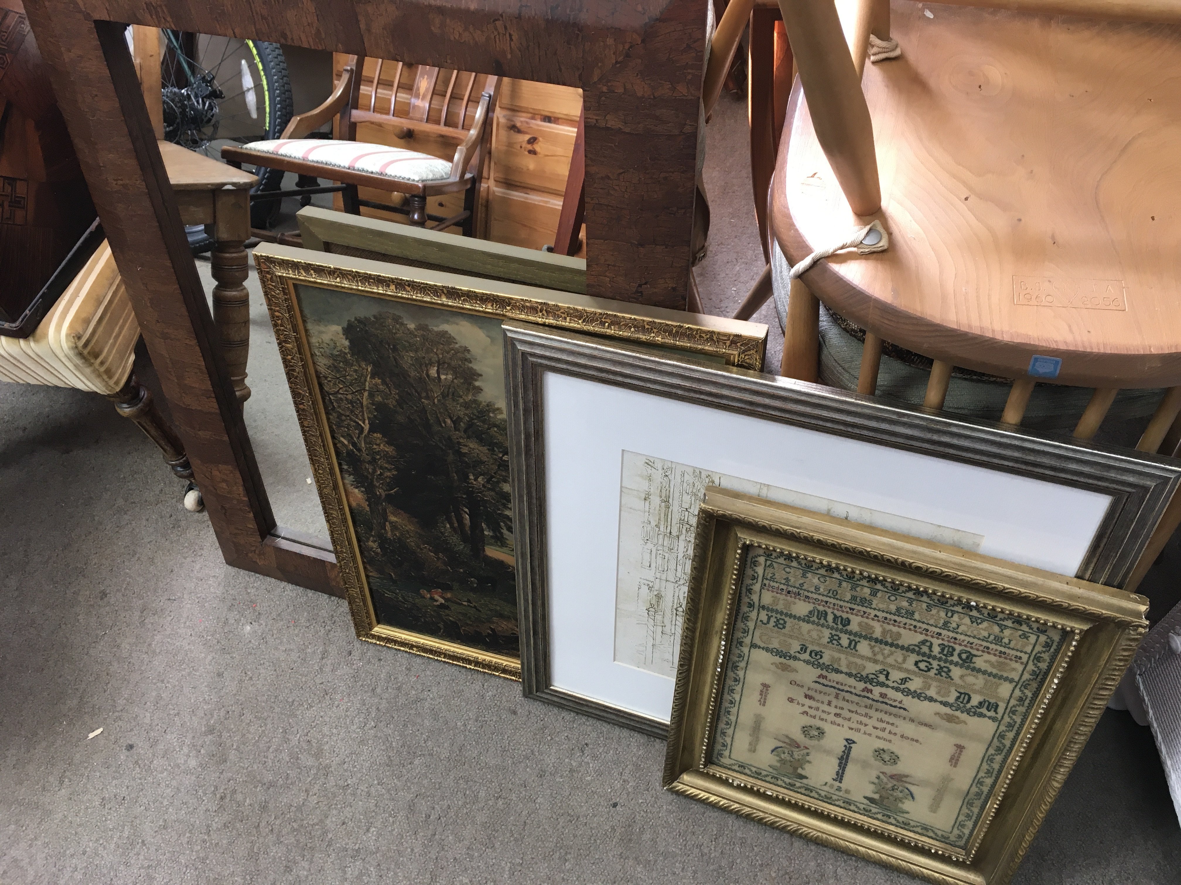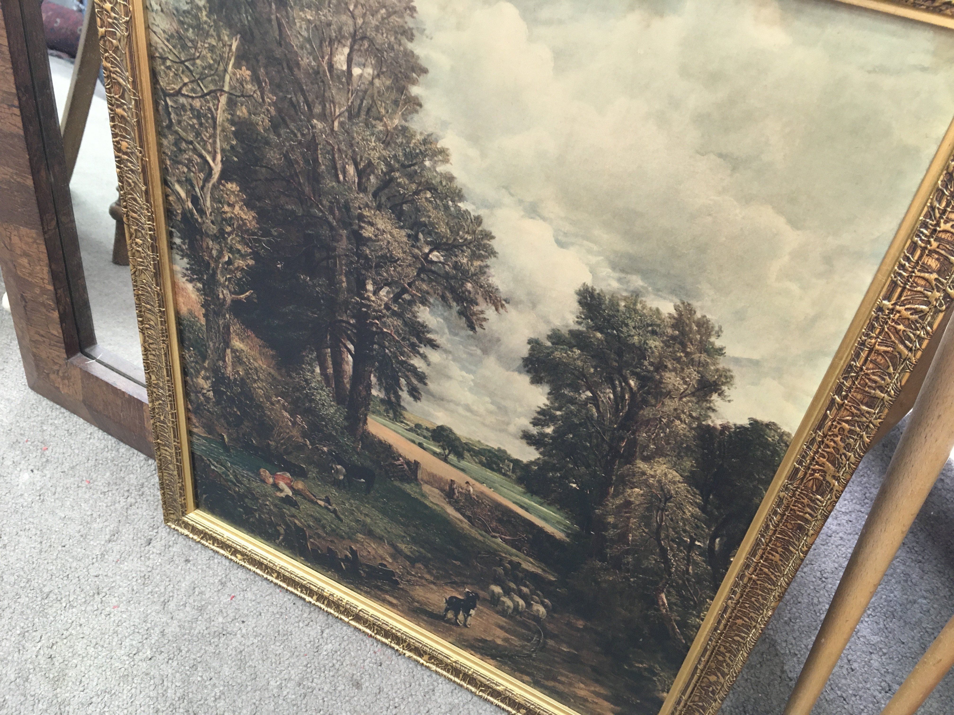 A collection of prints and a large mirror, dimensions 60x82cm. This lot cannot be posted