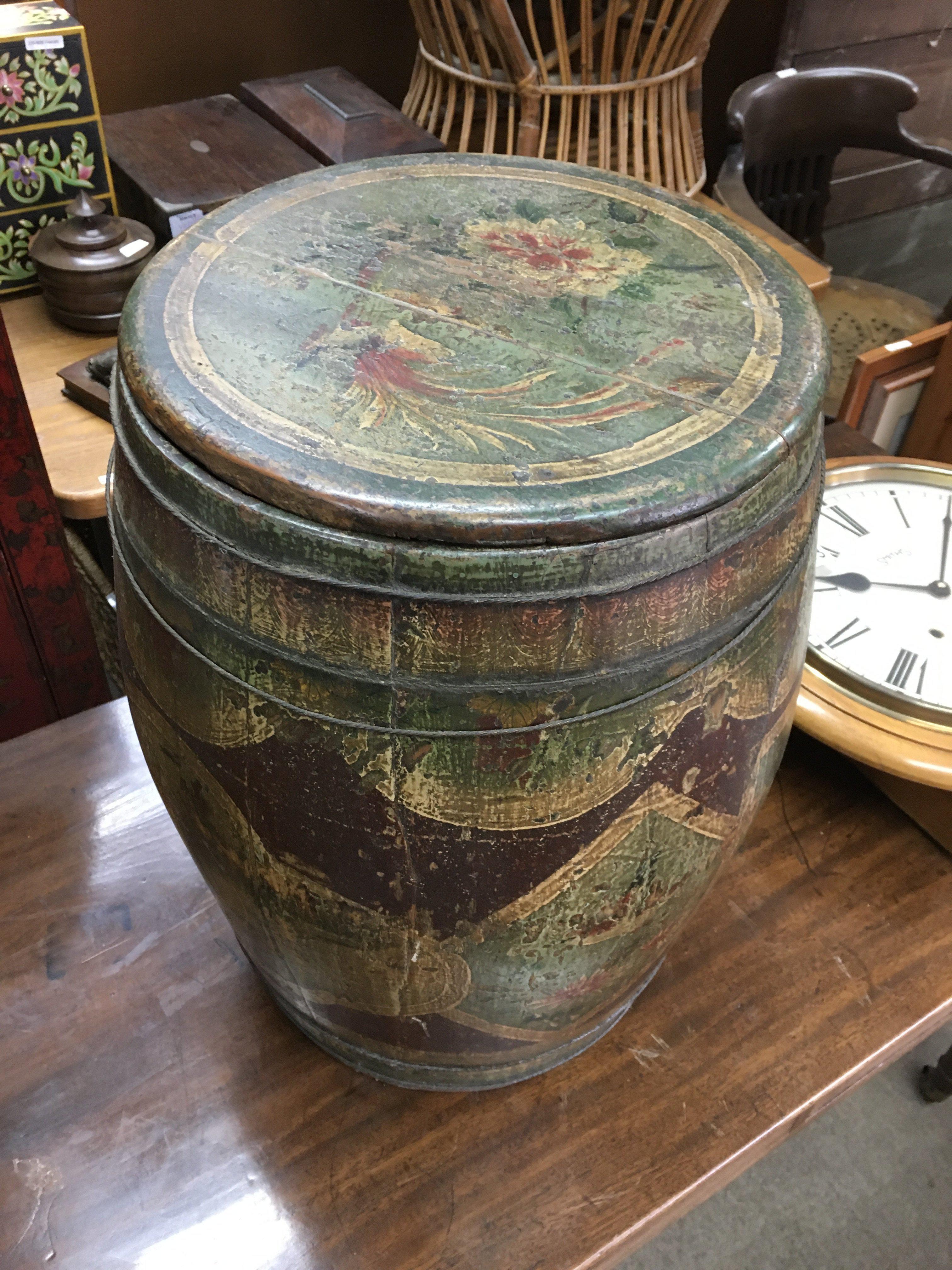 A vintage wooden painted barrel, 45cm tall.Condition Report