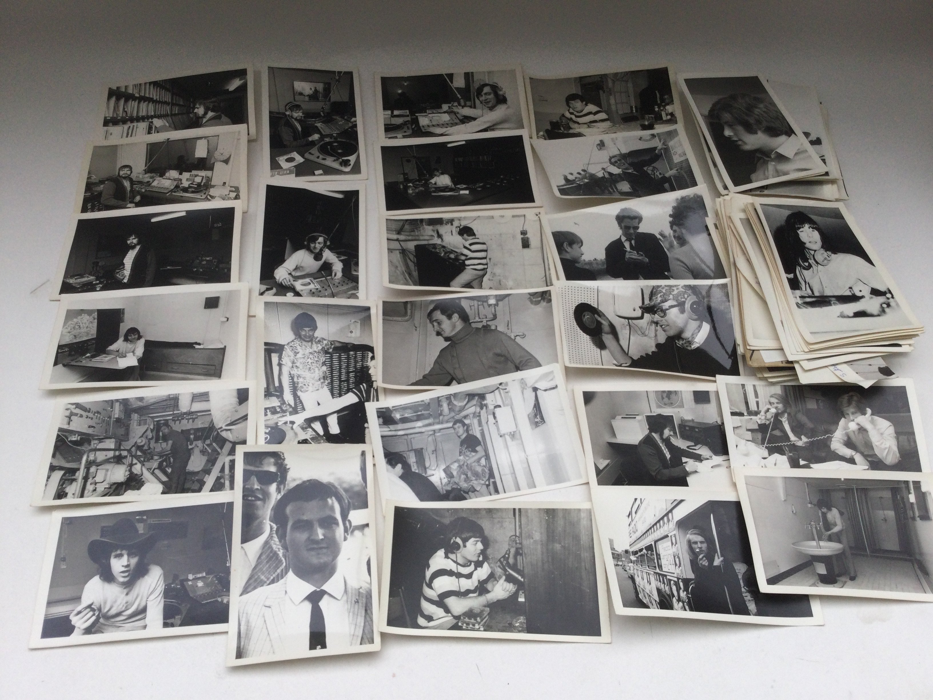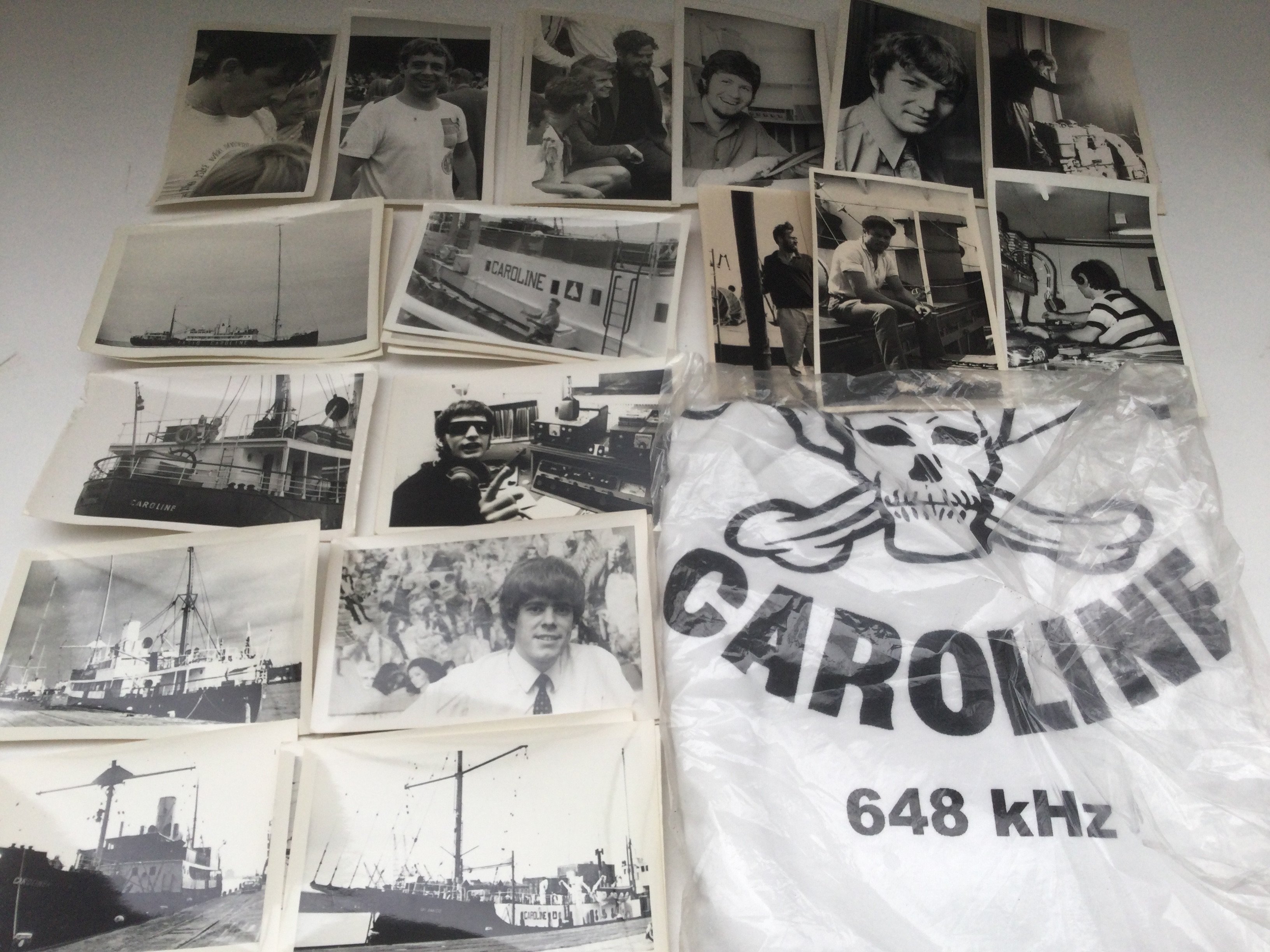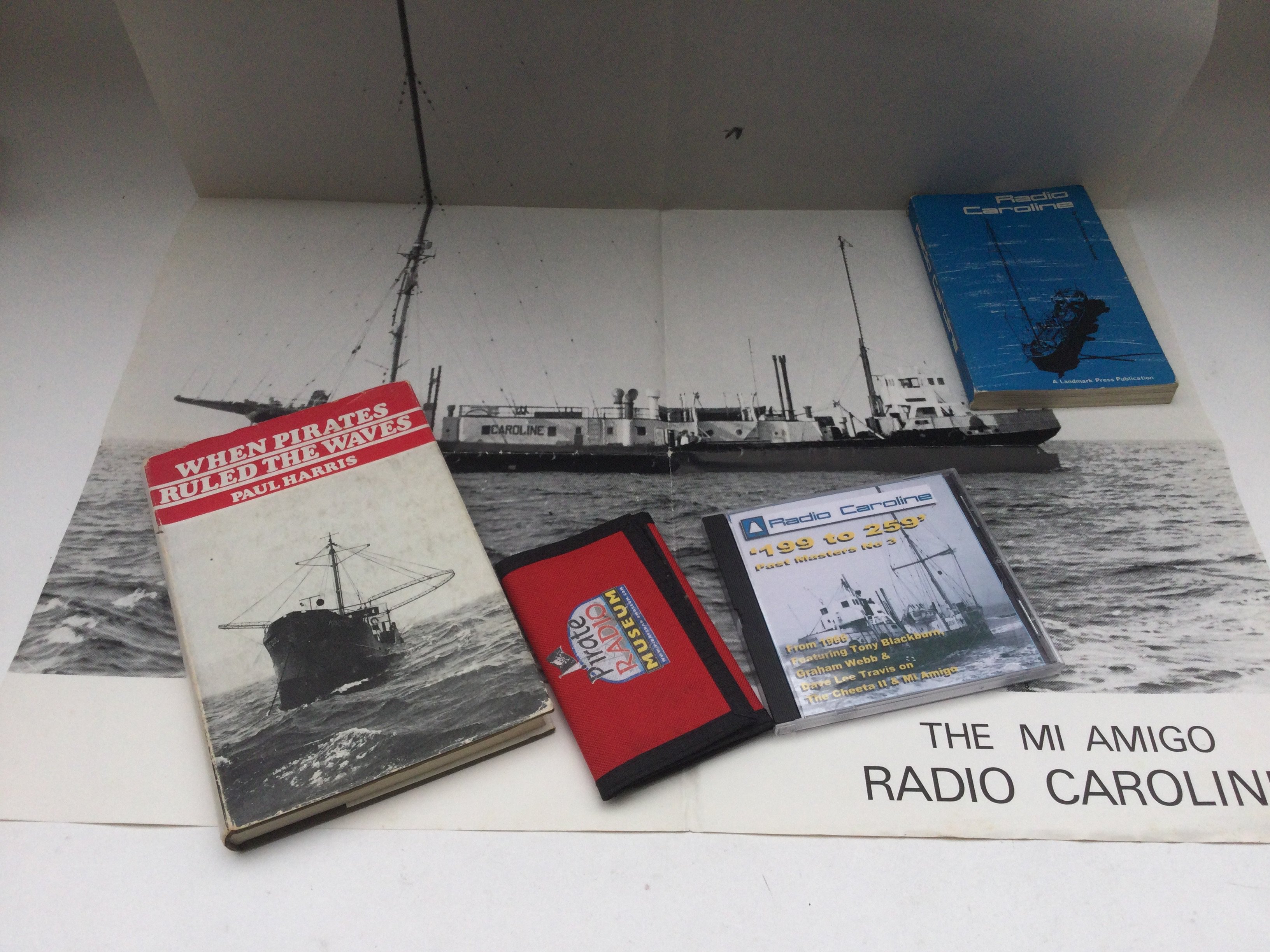 A collection of Radio Caroline memorabilia including signed books, photos, RNI promotion and jingle tape reel and other items.
