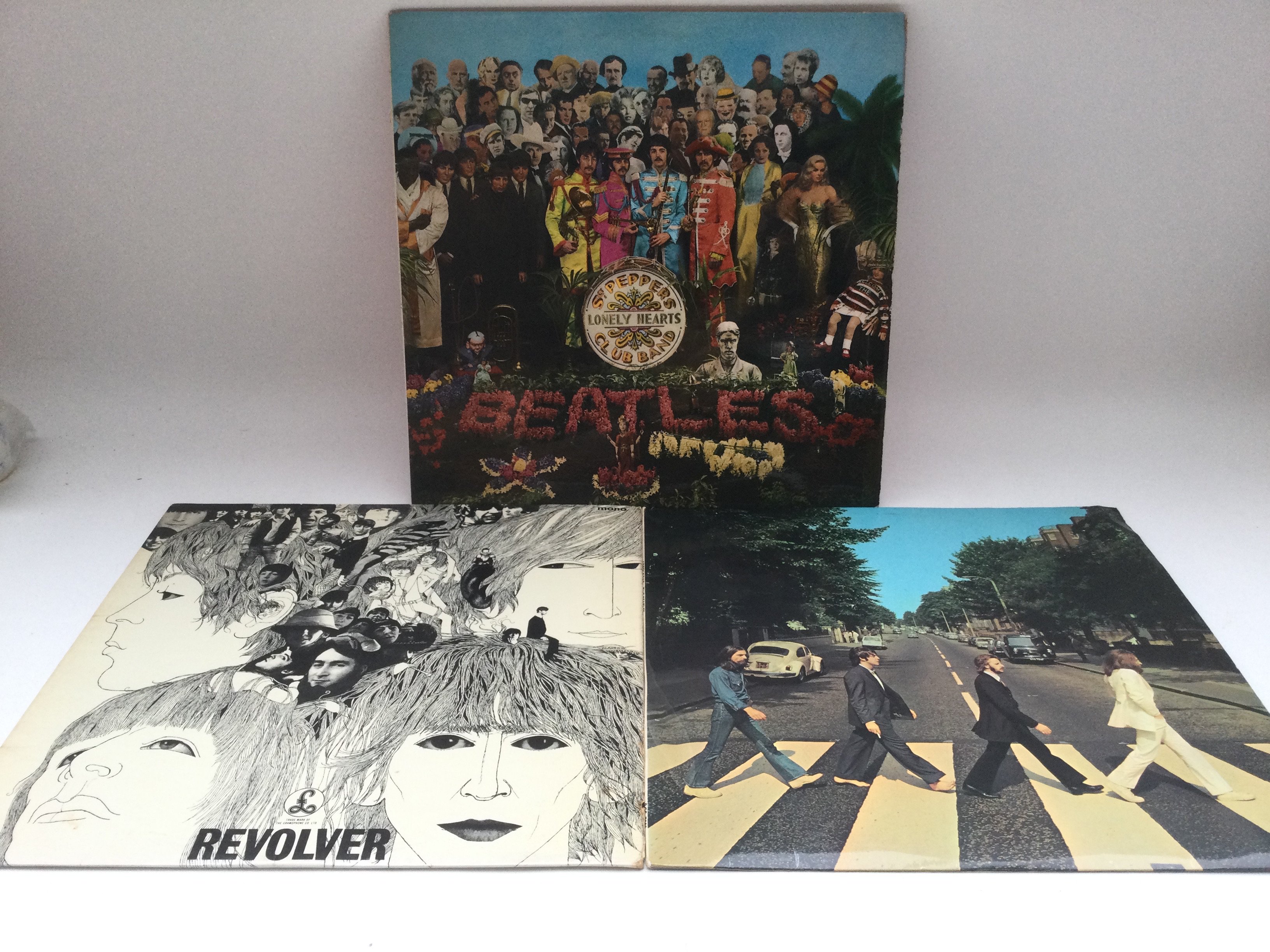 Three early UK pressings of Beatles LPs comprising 'Sgt Pepper', 'Revolver' and 'Abbey Road'. All have at least one feelable scratch.