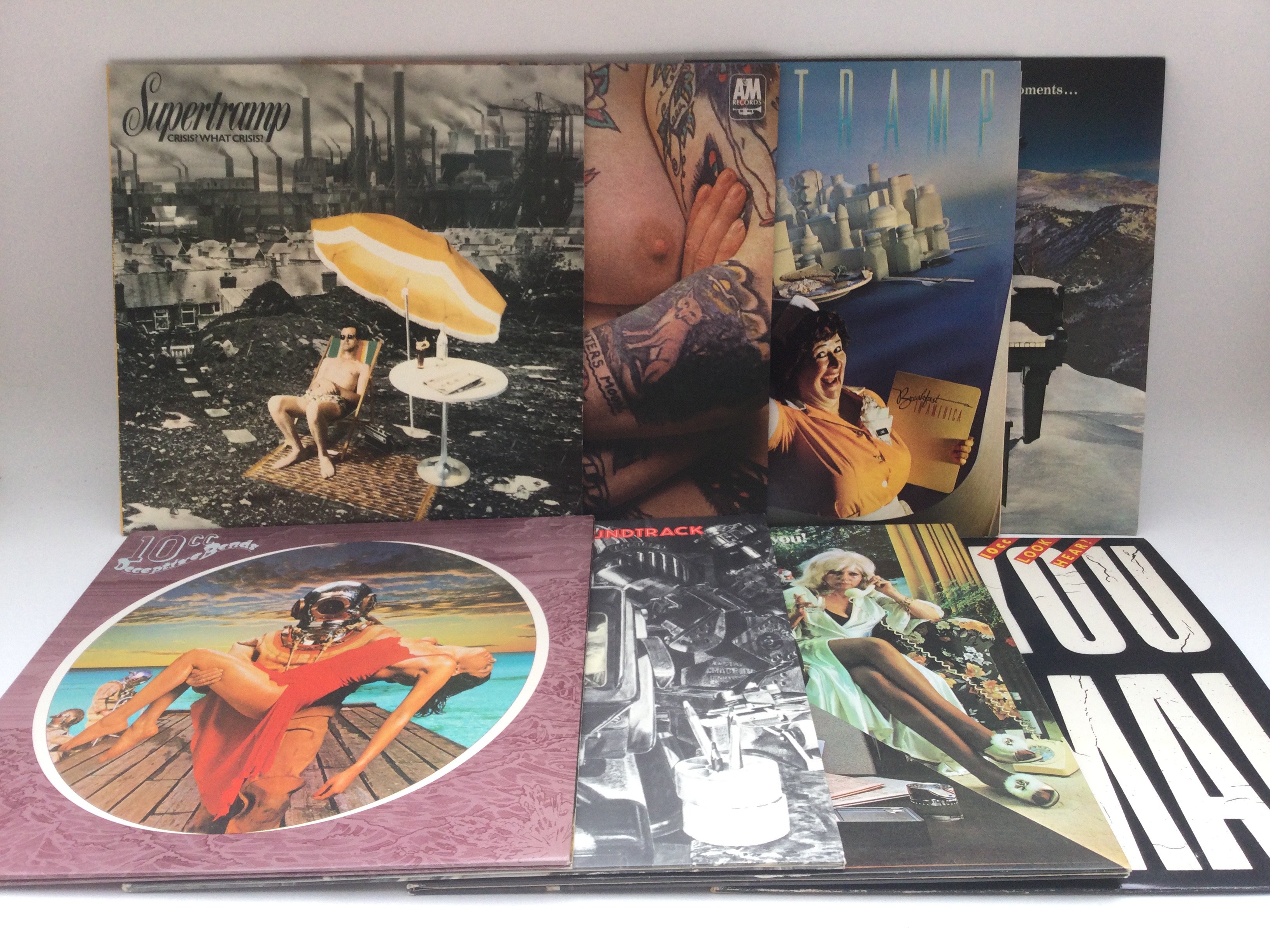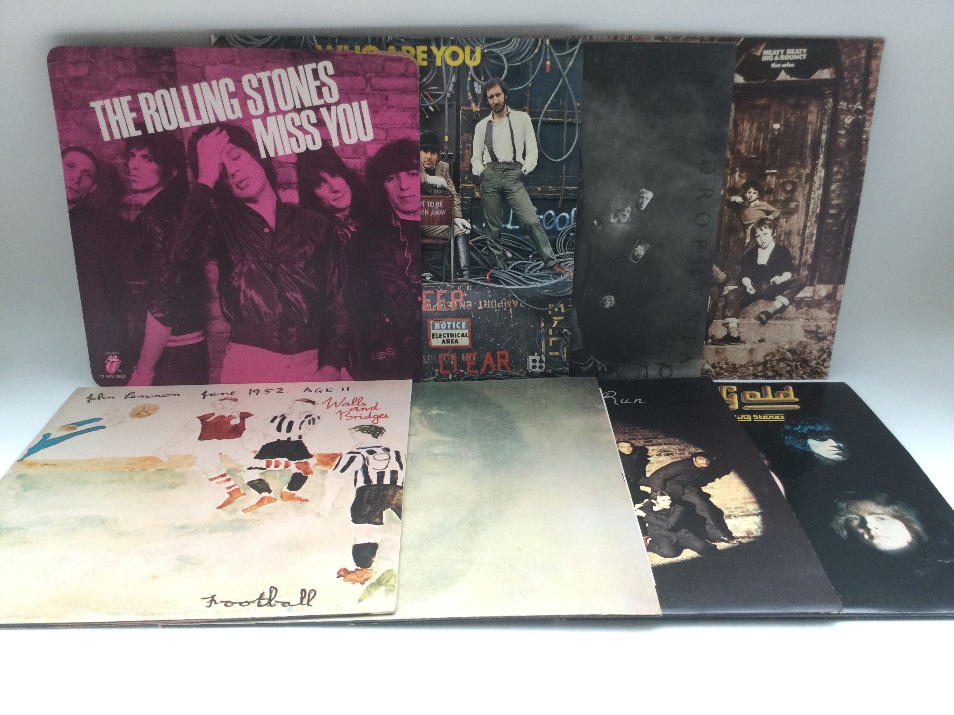 Two bags containing 15 rock LPs by various artists including The Rolling Stones, The Who, John Lennon and others plus a pink vinyl 12" Stones single.