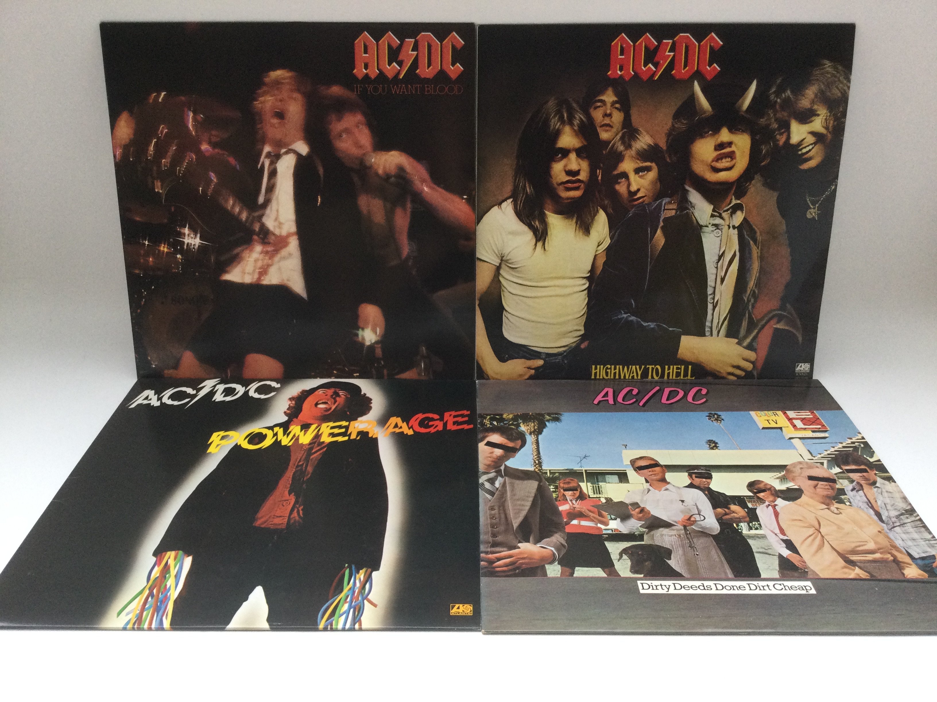 Four AC/DC LPs comprising 'Highway To Hell', 'Powerage', 'If You Want Blood' and 'Dirty Deeds Done Dirt Cheap'.
