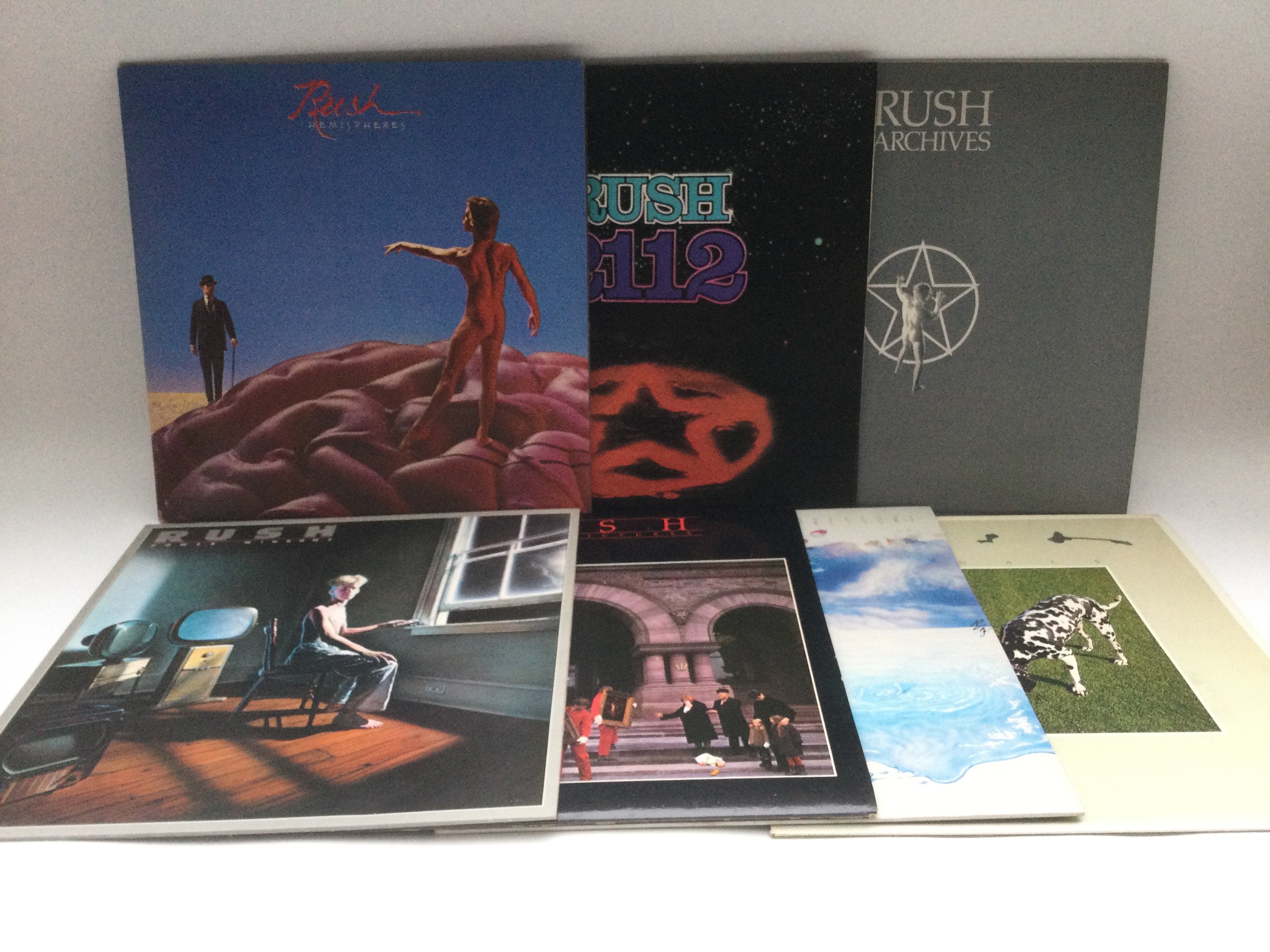 Seven Rush LPs comprising 'Moving Pictures', '2112', 'Signals' and others.