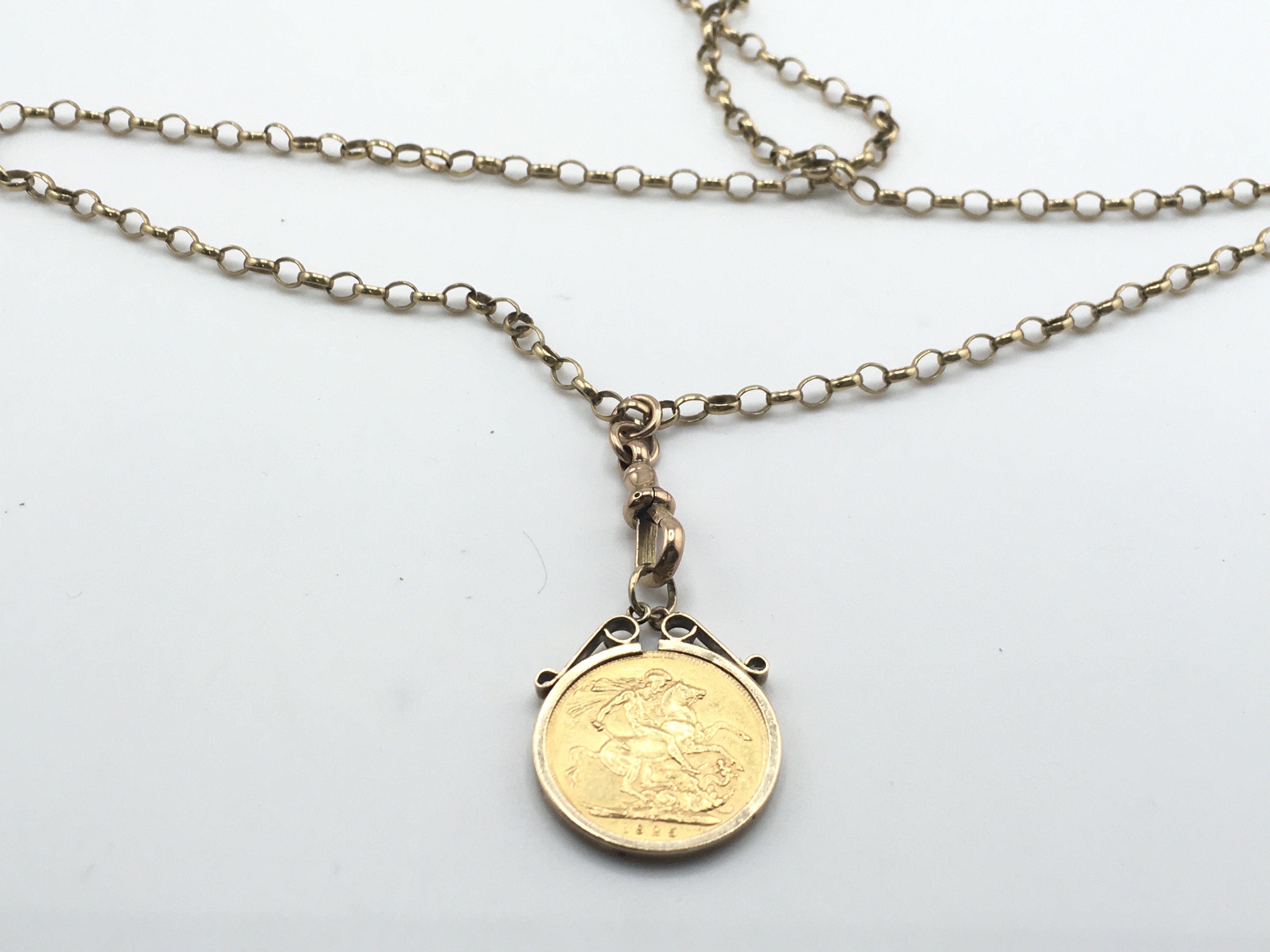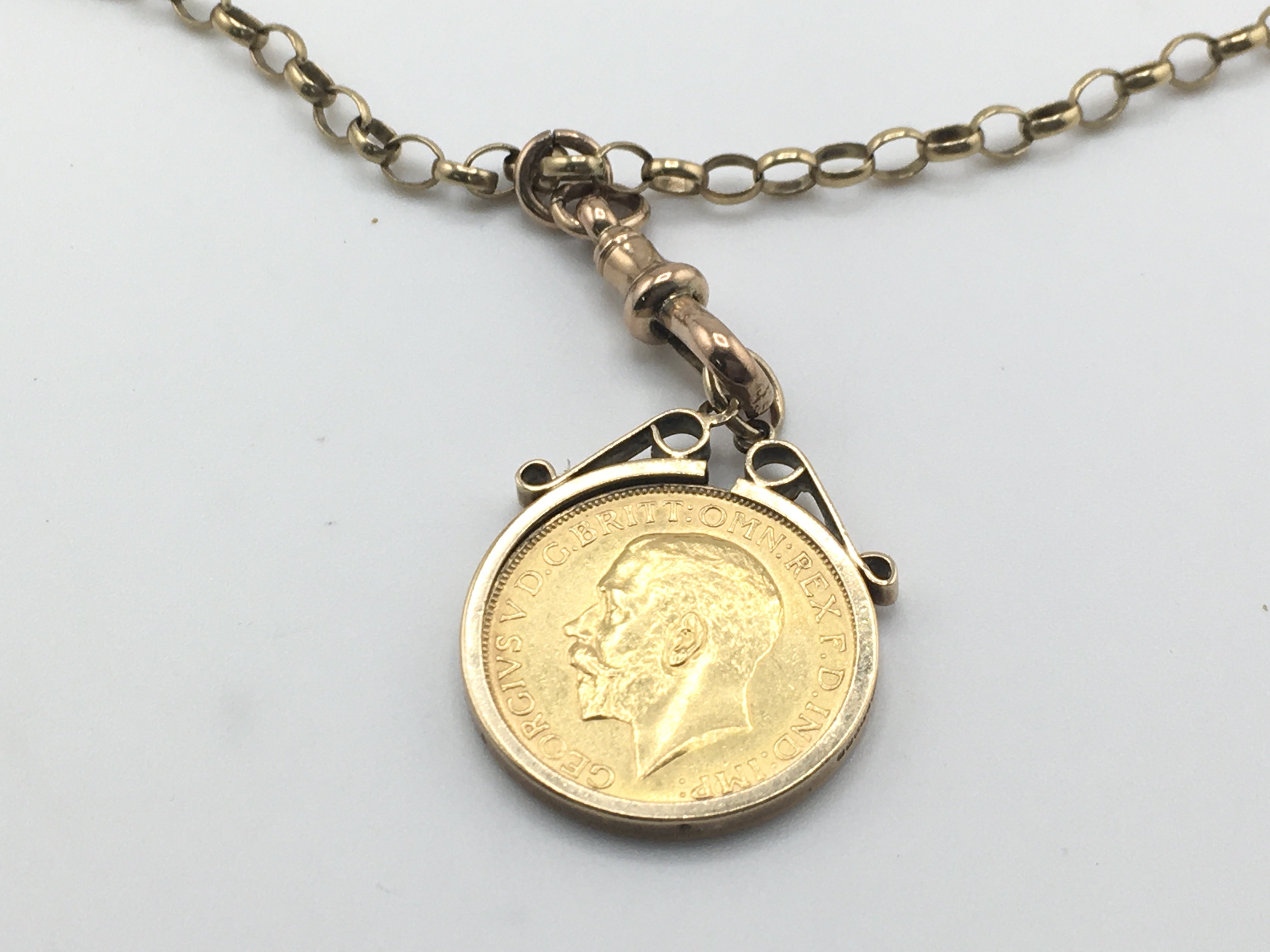A 1925 full sovereign on a 9ct gold belcher chain. 21.9g Postage A