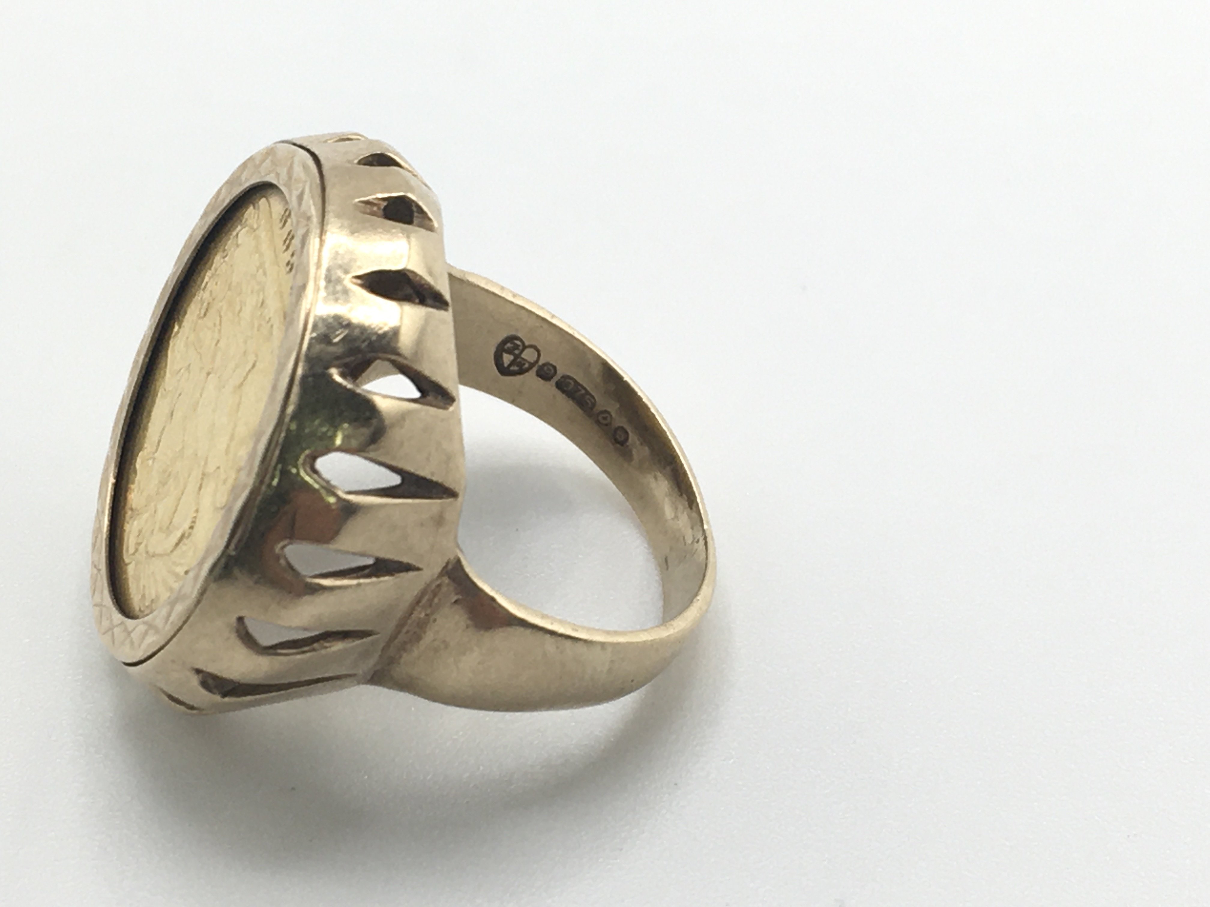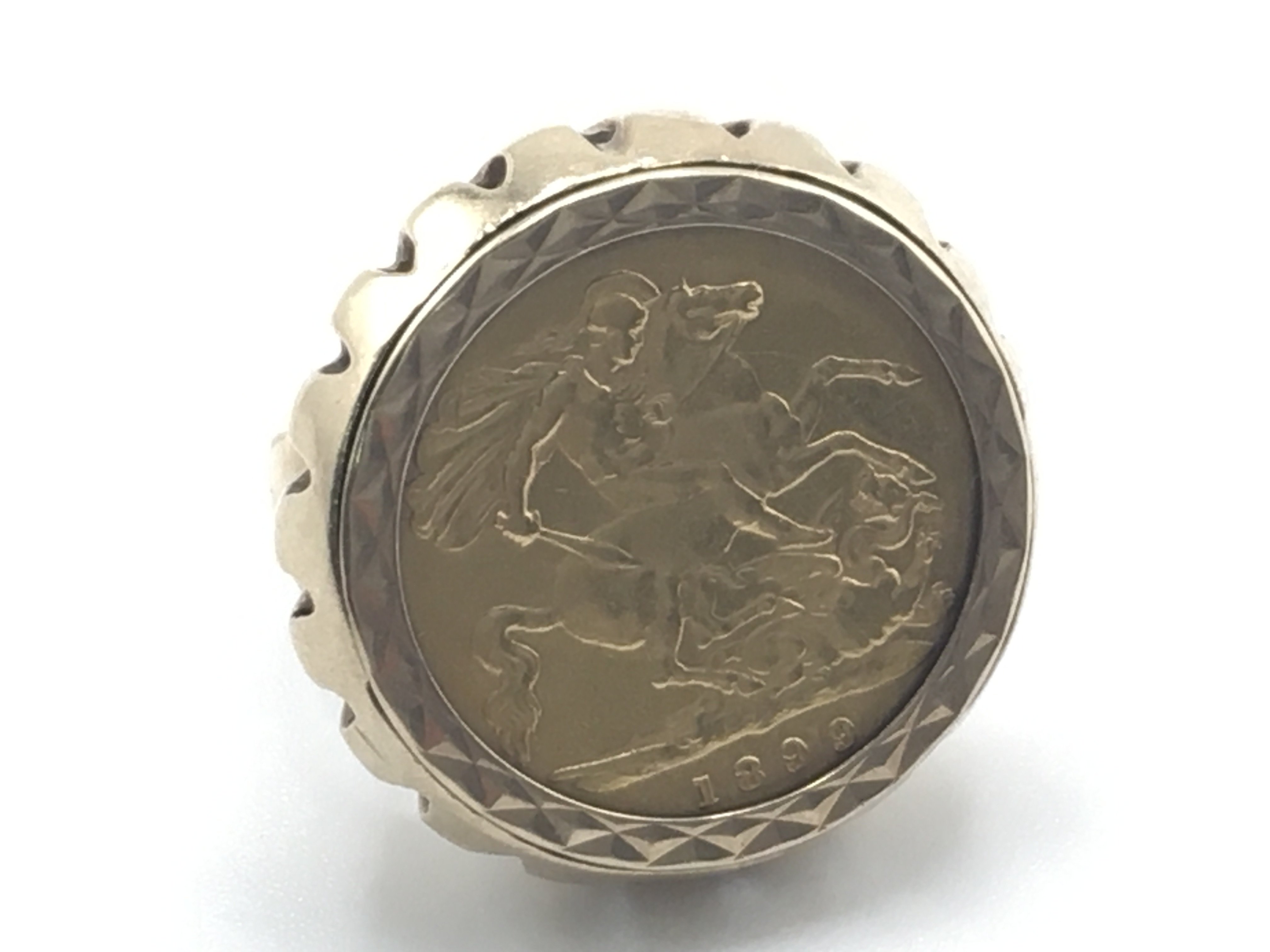 A 1899 half Sovereign ring set in 9ct. 9.5g and size L Postage B