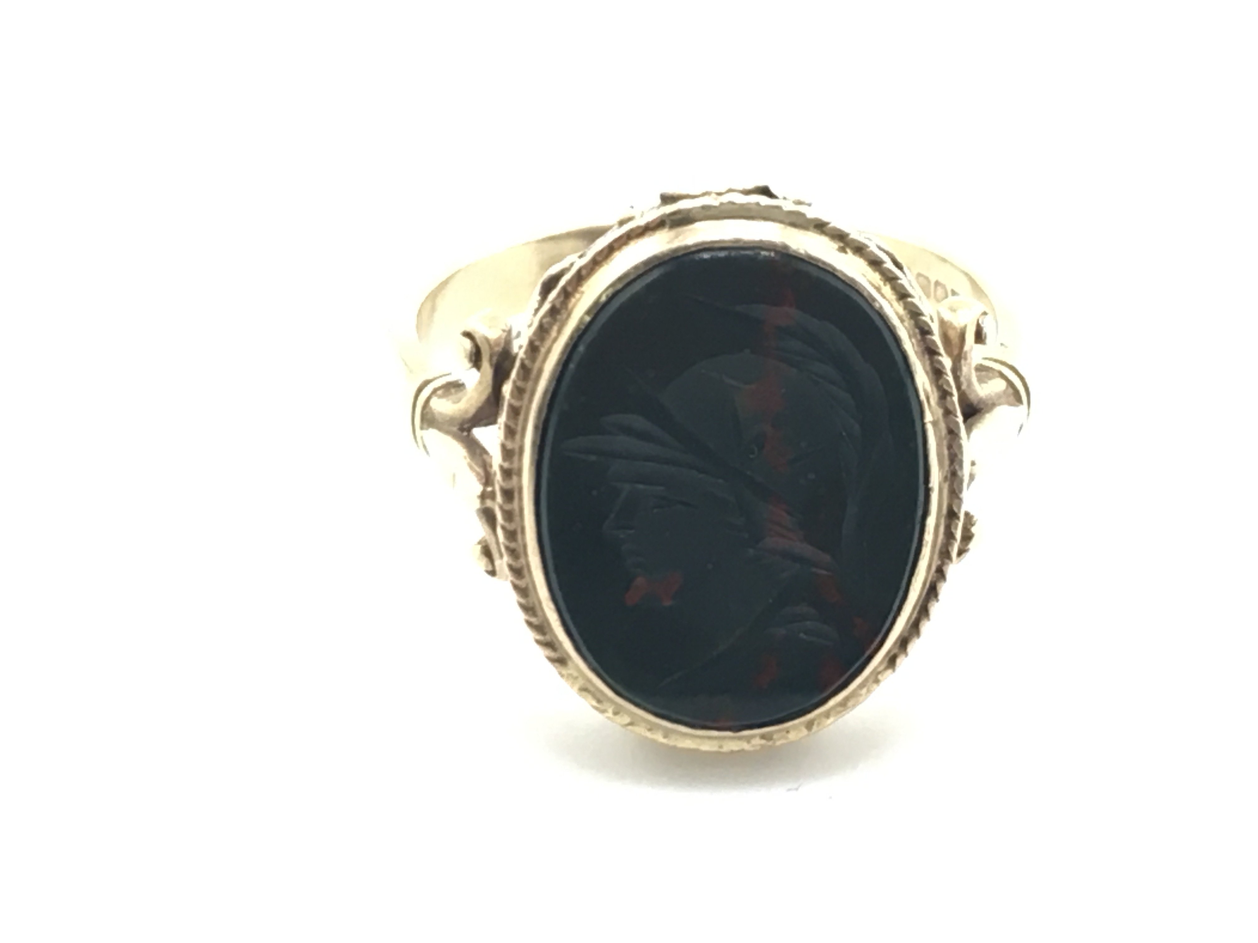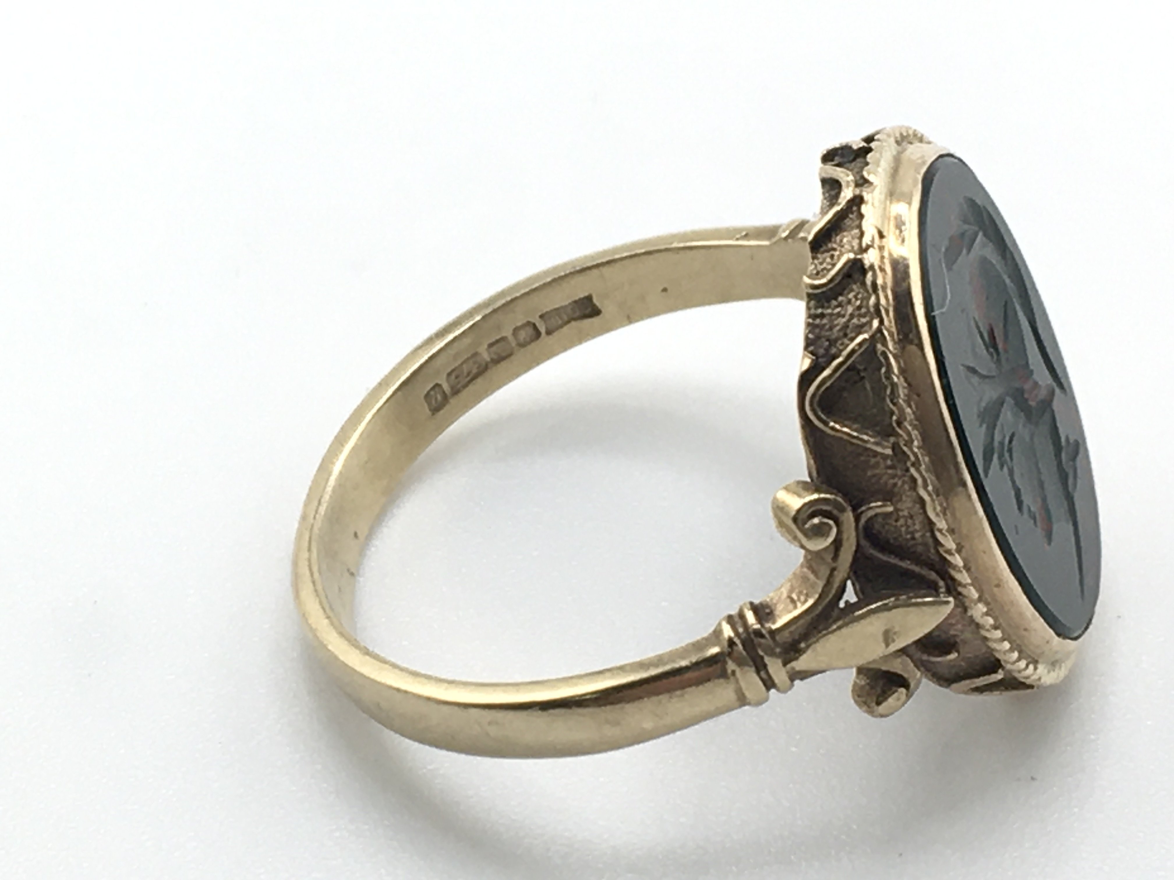 A 9ct gold ring set with Intaglio blood stone. 4.3g and size S Postage A