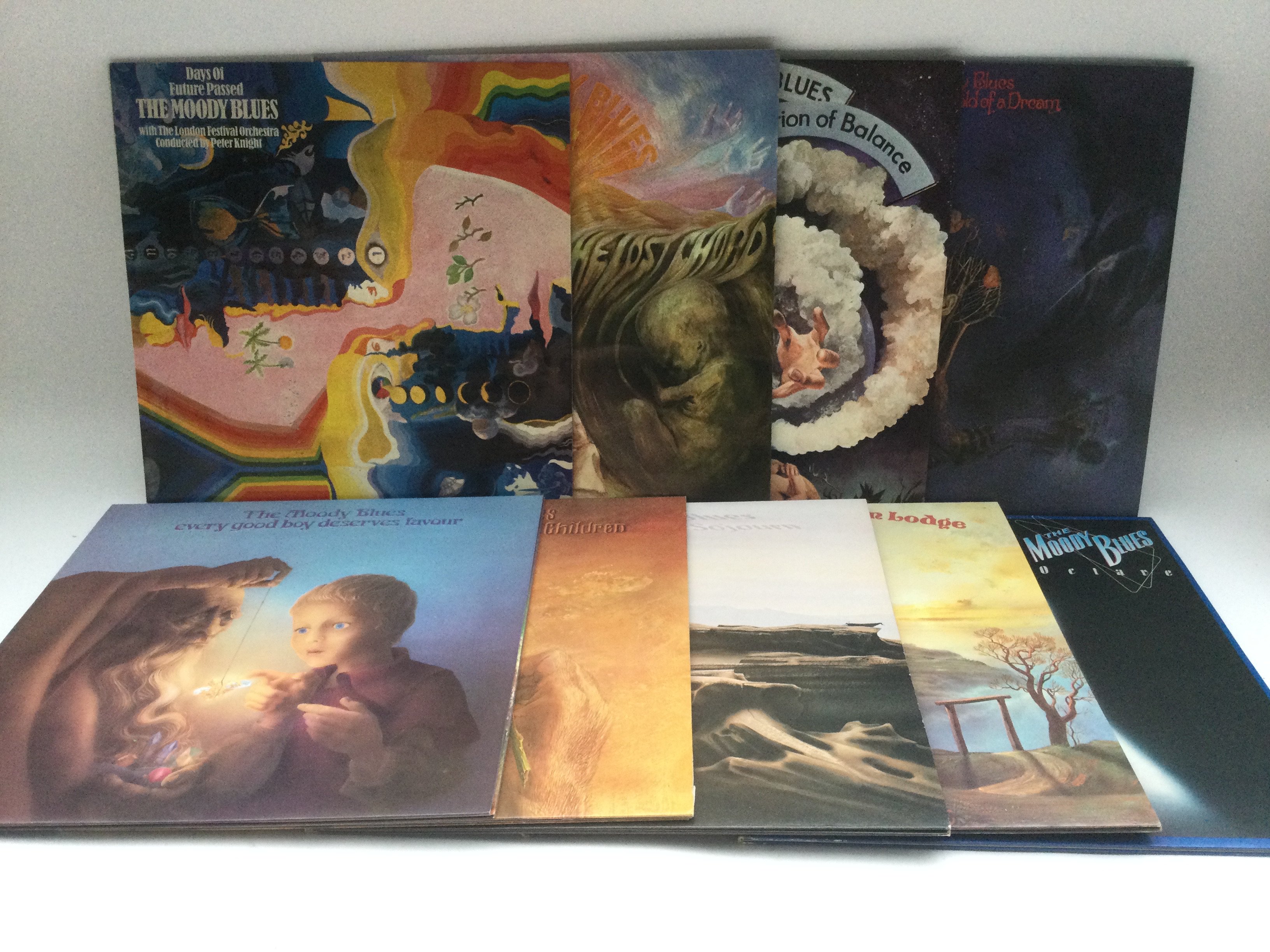 Nine Moody Blues and related LPs comprising 'In Search Of The Lost Chord', 'Days Of Future Passed', 'On The Threshold Of A Dream' and others.