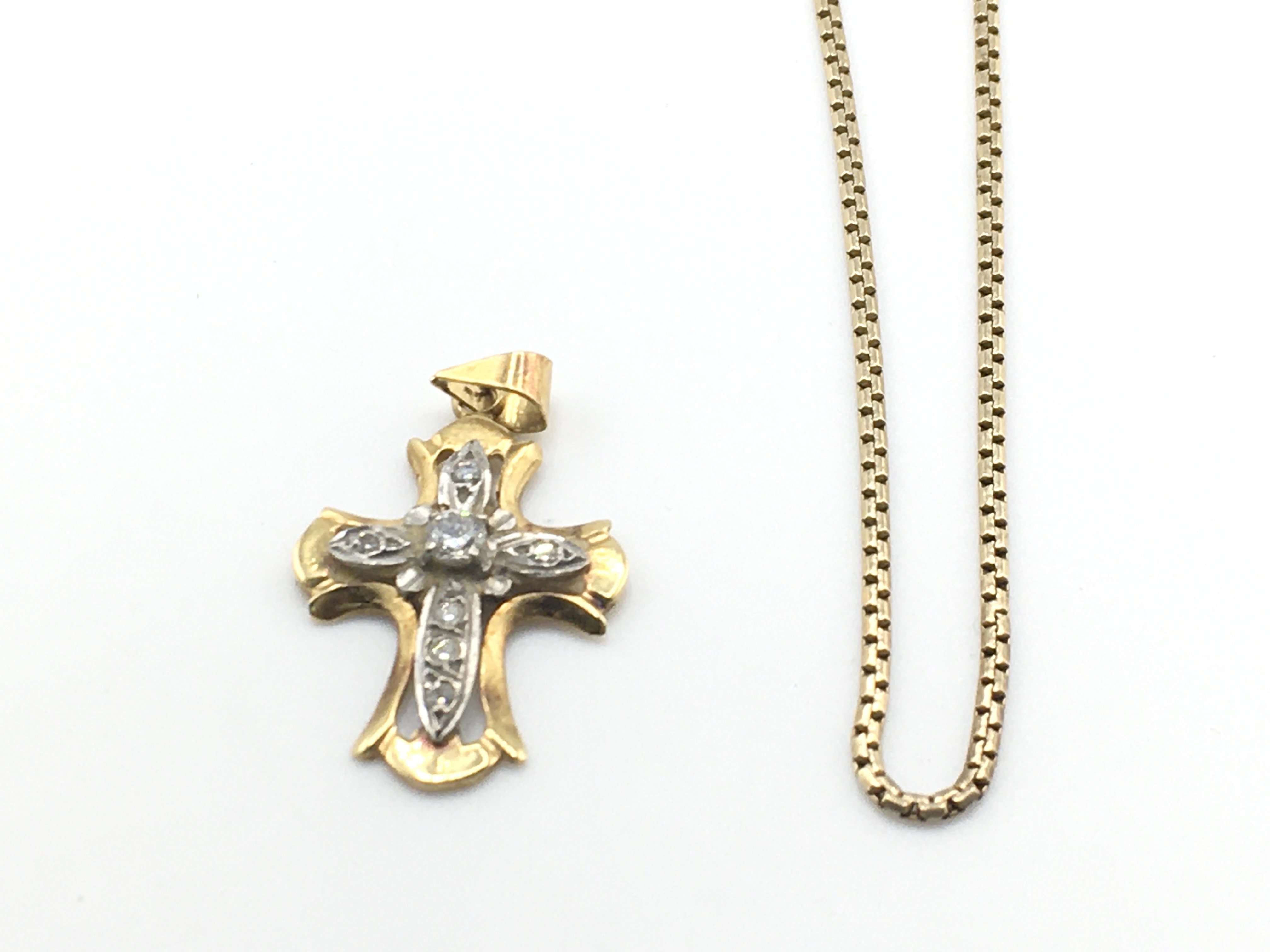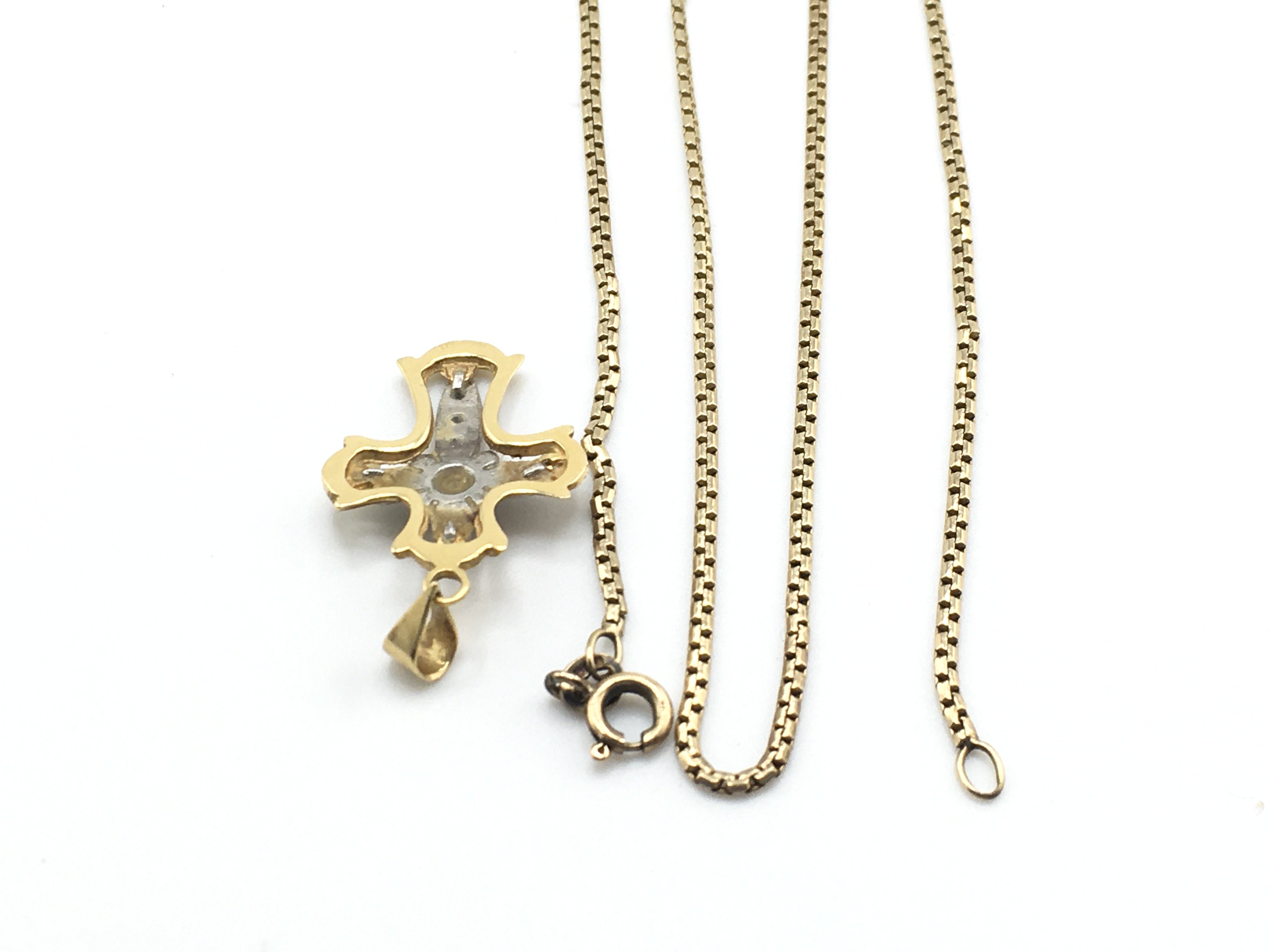 An 18ct gold cross set with diamonds 3g and a 9ct gold chain 5g. Postage A