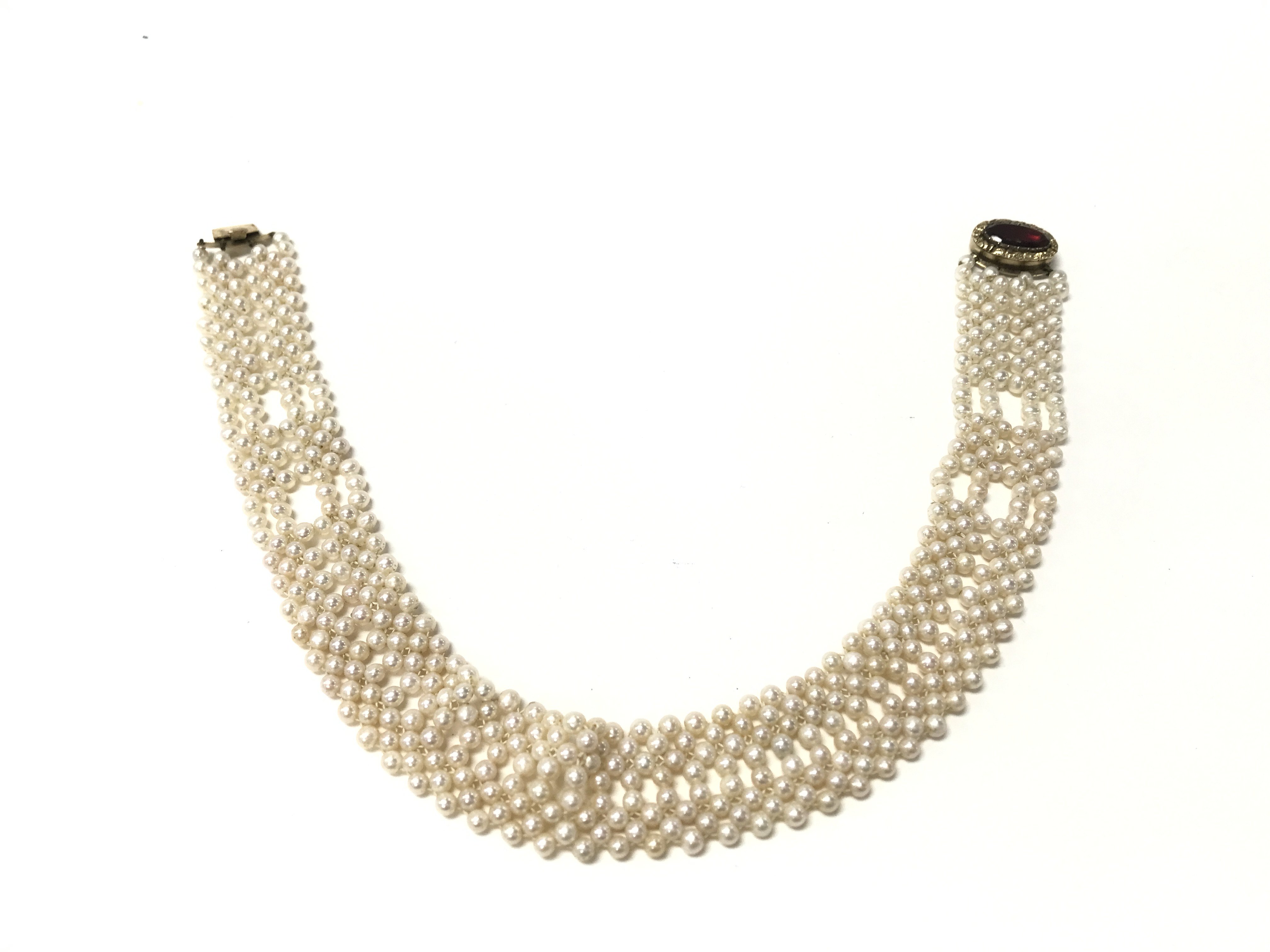 A cultured Pearl necklace with gold and garnet clasp. 39cm long. Postage A
