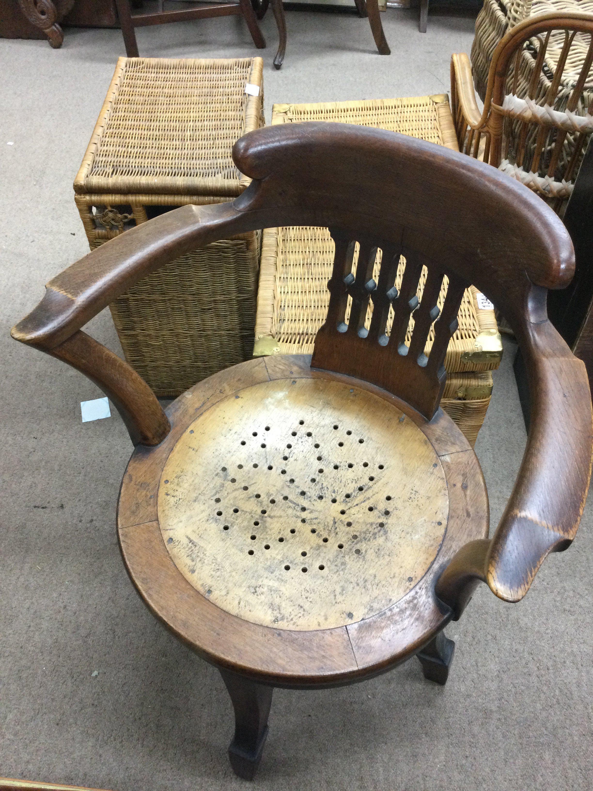 An oak early 20th century open arm chair , 83cm tall, 63cm wide