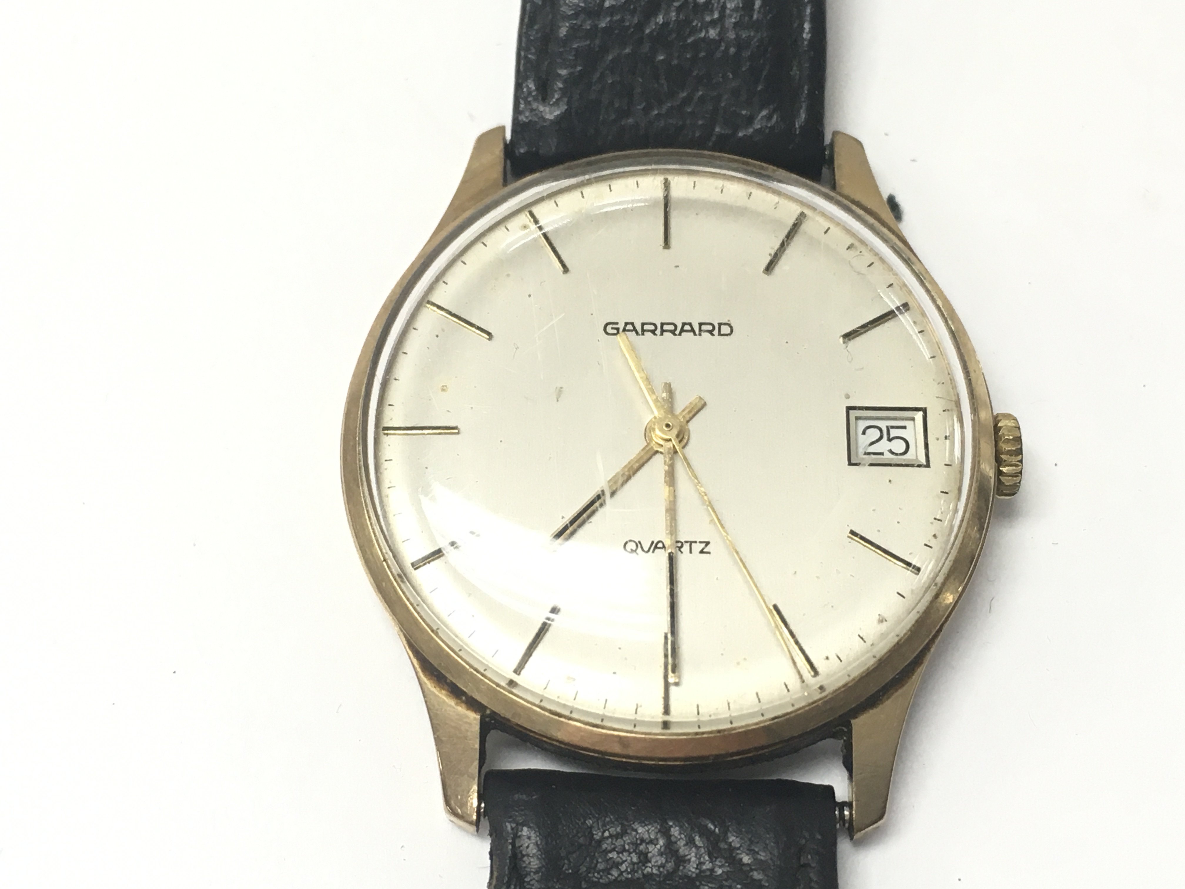 A vintage gents 9ct Garrard wrist watch with leather strap. Not seen running.