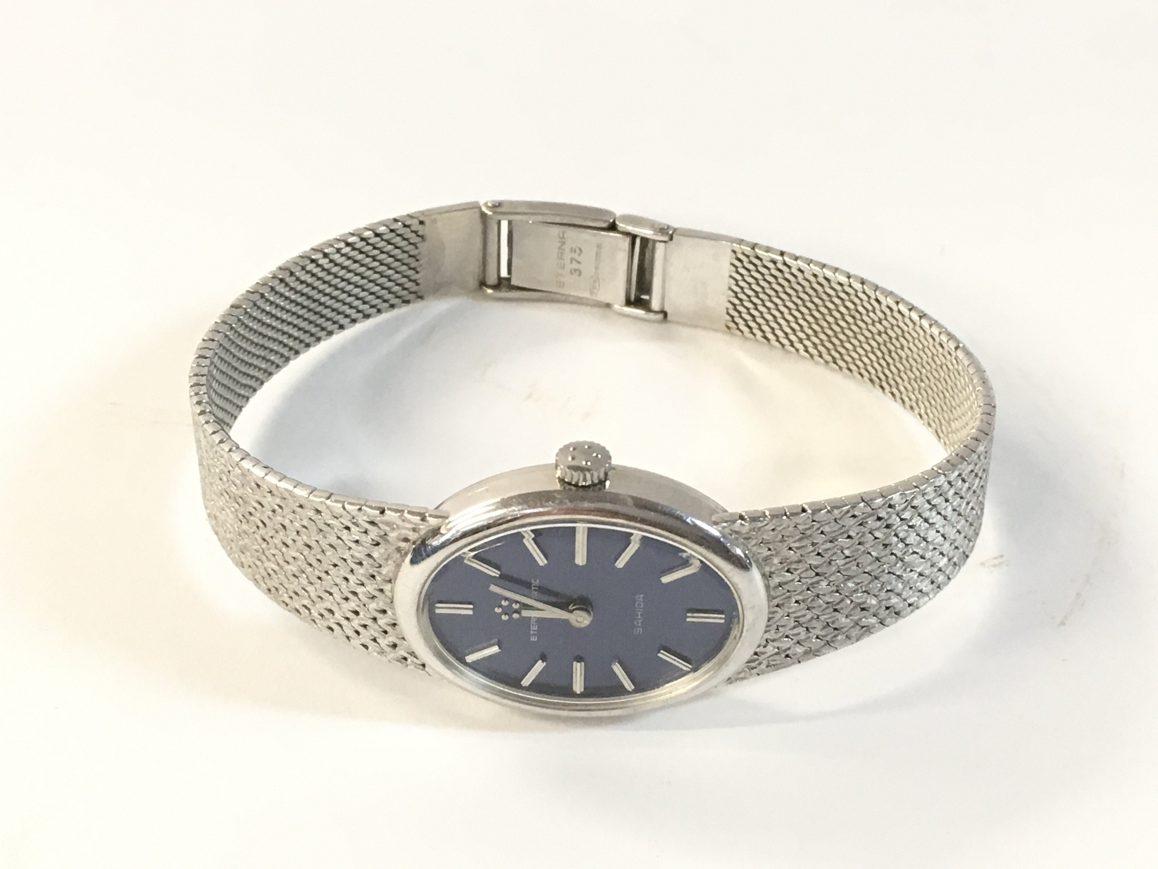 A ladies 9ct white gold cased eterna matic watch on a 9ct white gold strap.