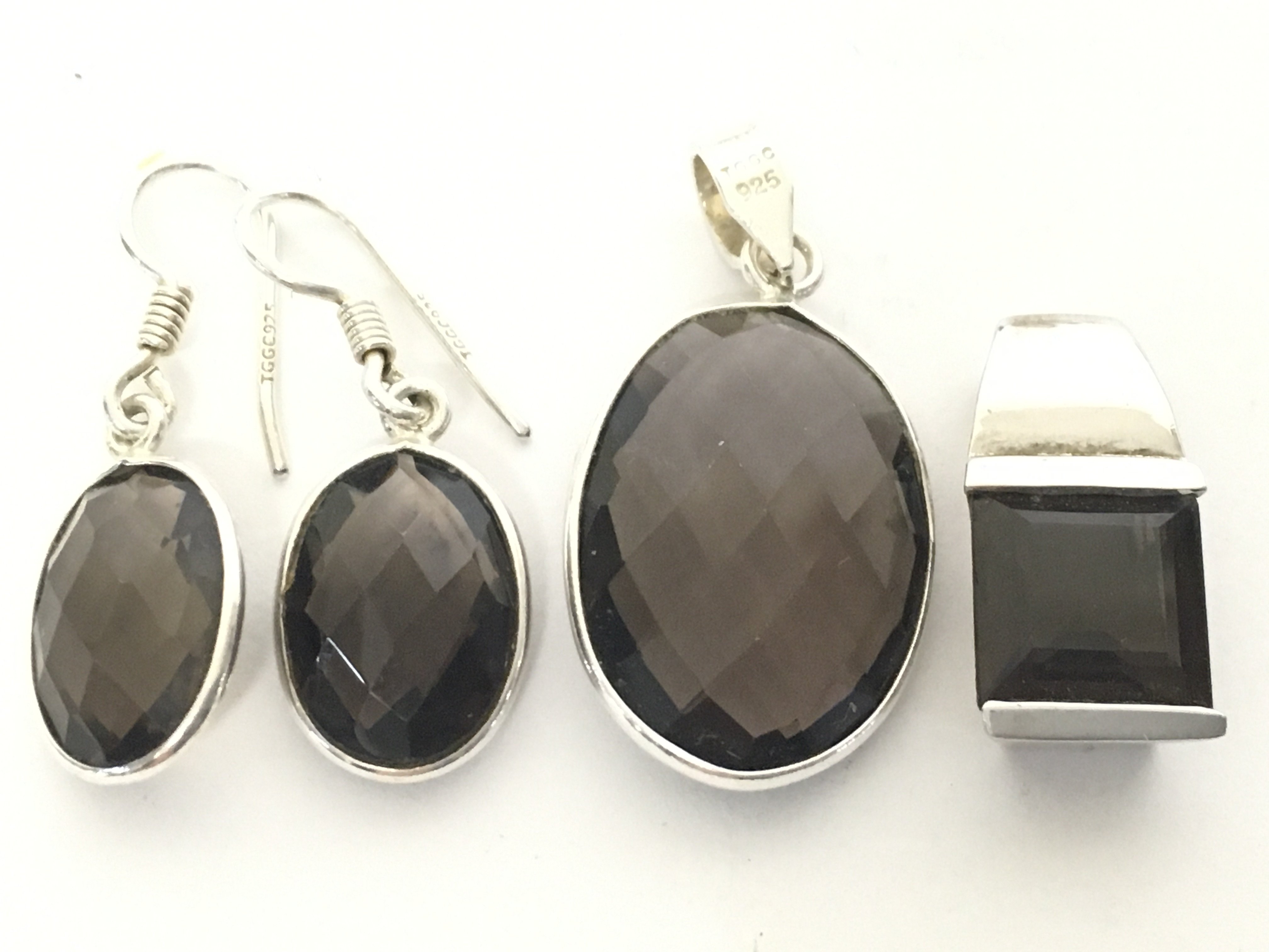 Silver Smokey Quartz pendants and earrings. Postage category A. NO RESERVE