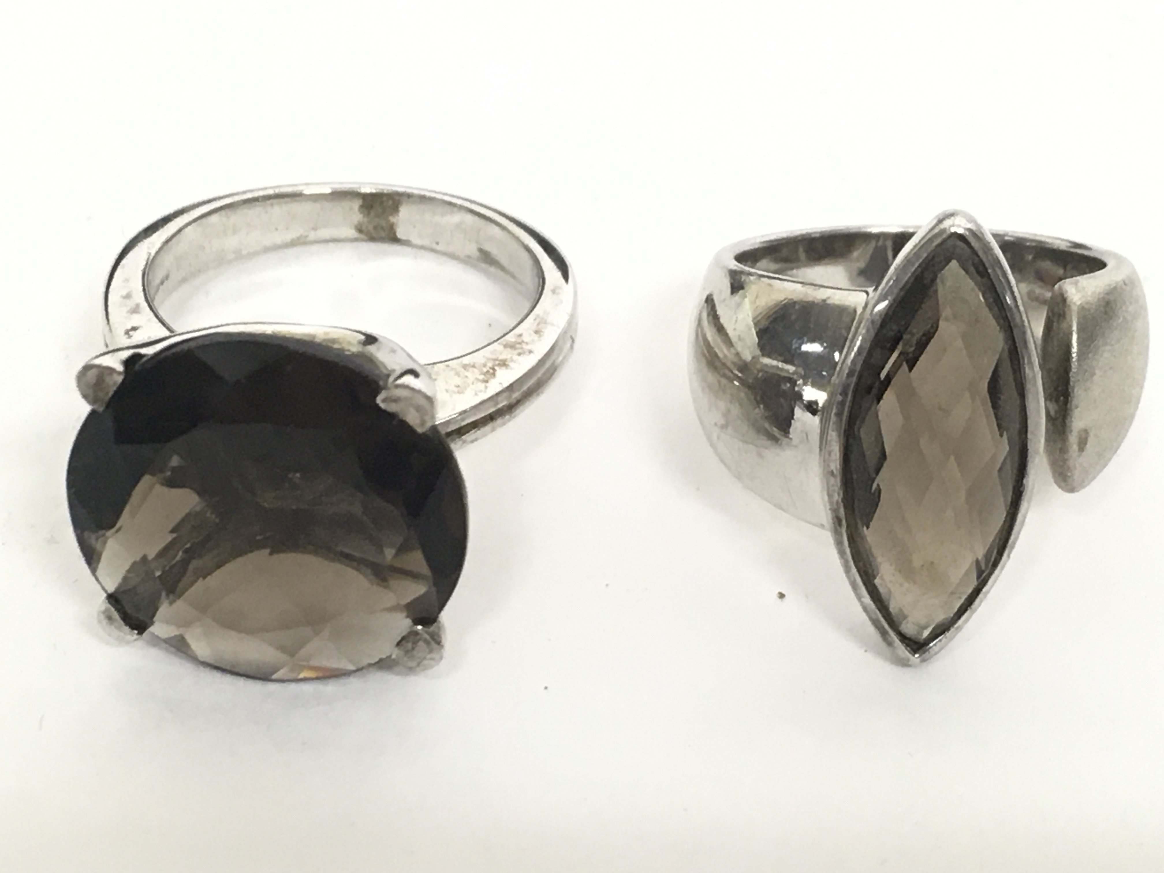 Two silver smokey quartz rings, sizes S & N. postage category A
