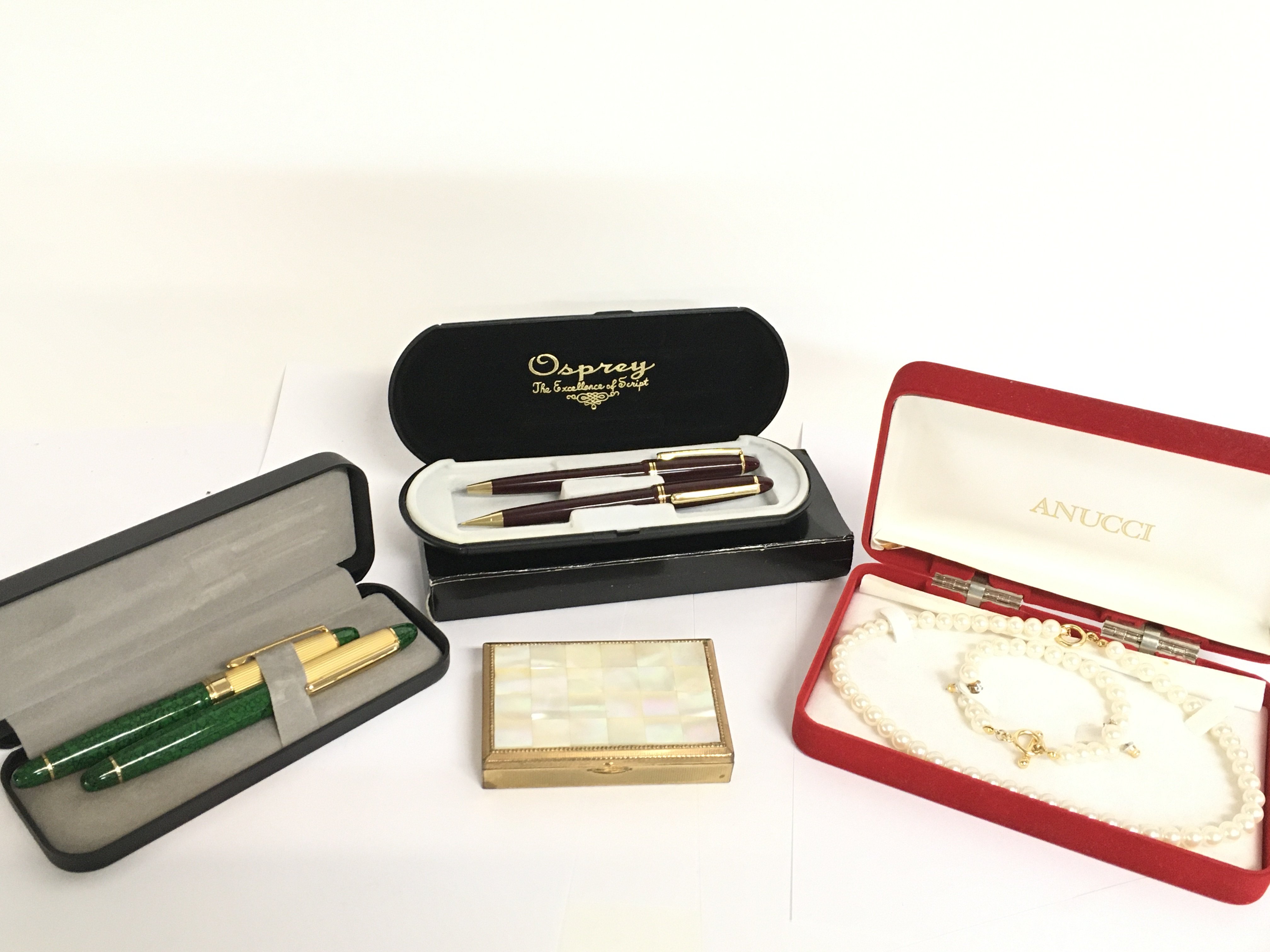 A collection of cased pens, a compact mirror and a simulated pearl necklace. Postage category C. NO RESERVE