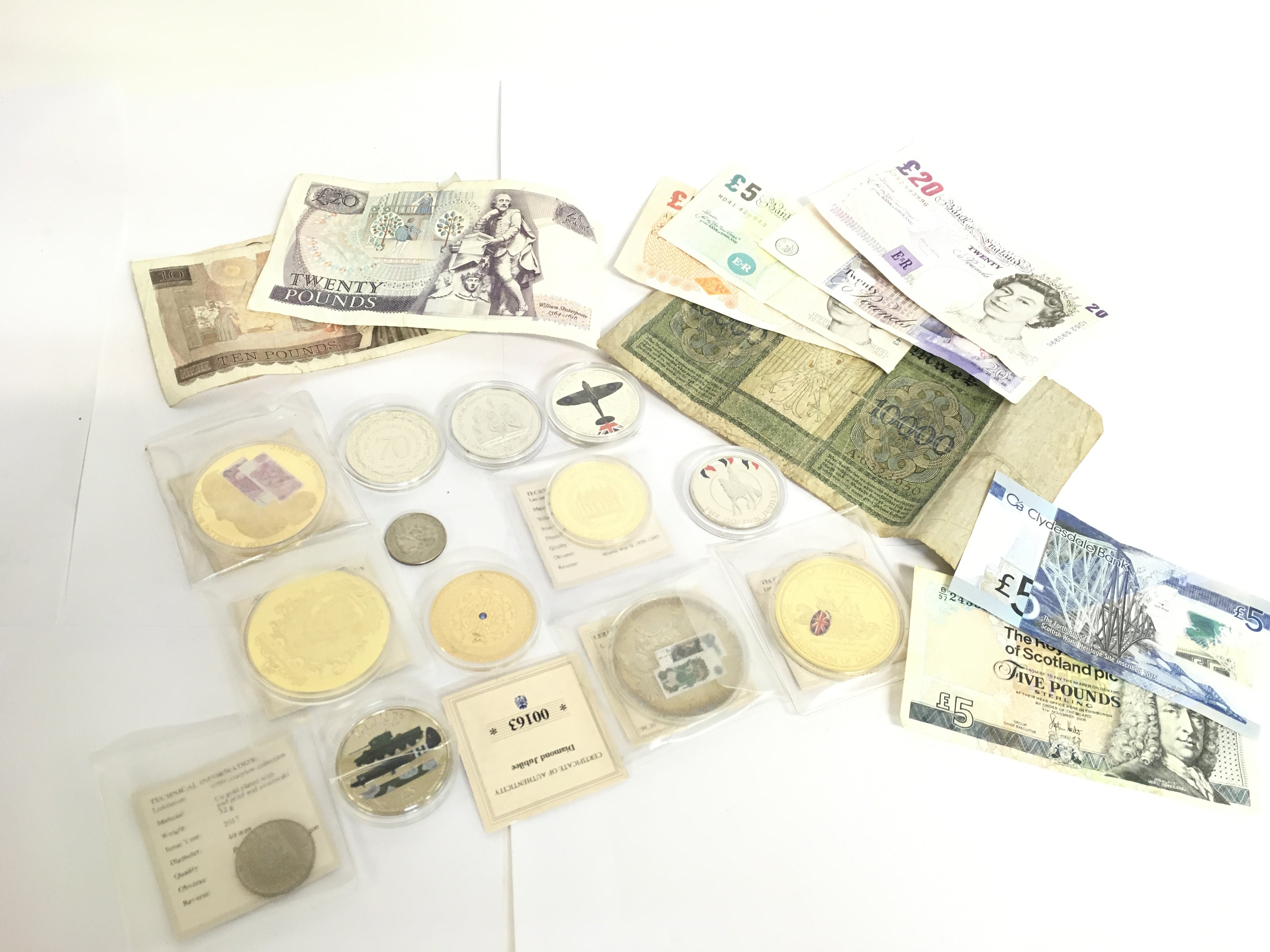 A collection of bank notes including a German 1922 Reichsbanknote, british notes and coins including a 2017 gold plated Rule Britannia coin, VE day 2019 gold plated coin. Postage category B