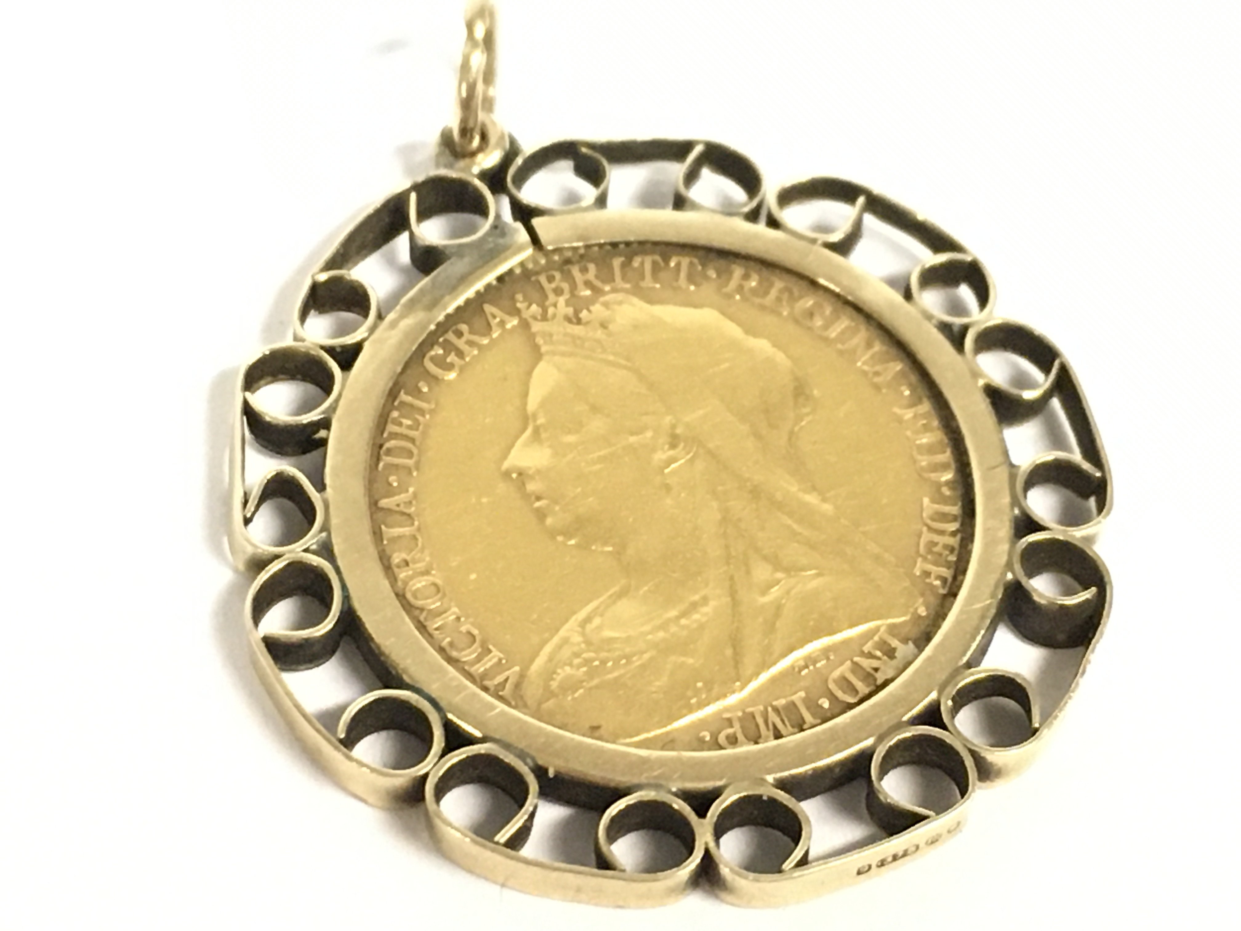 A 1899 half Sovereign in a mount, 5.7g. Postage category a