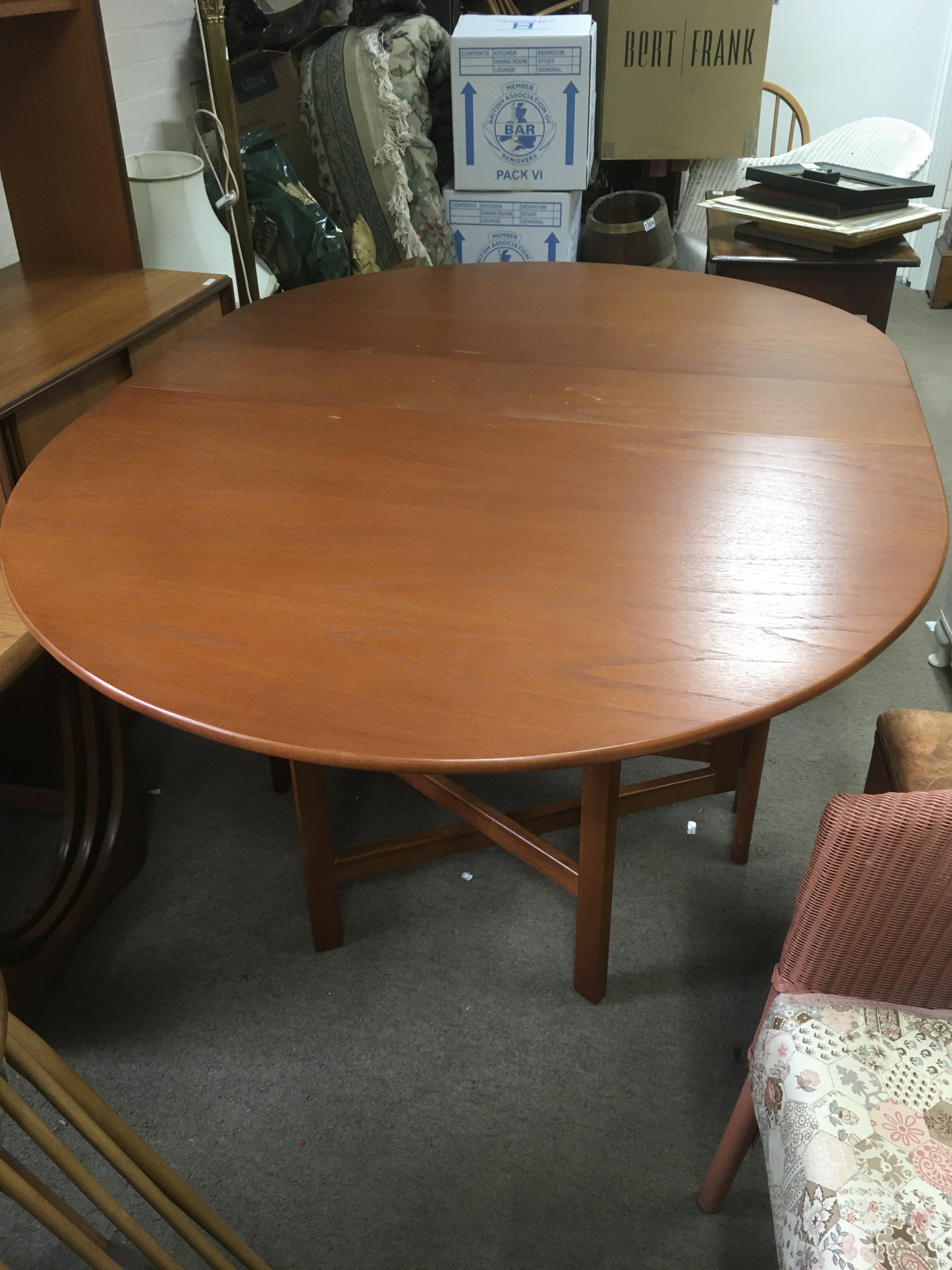 A drop leaf teak table, 74cm tall, 154cm wide.