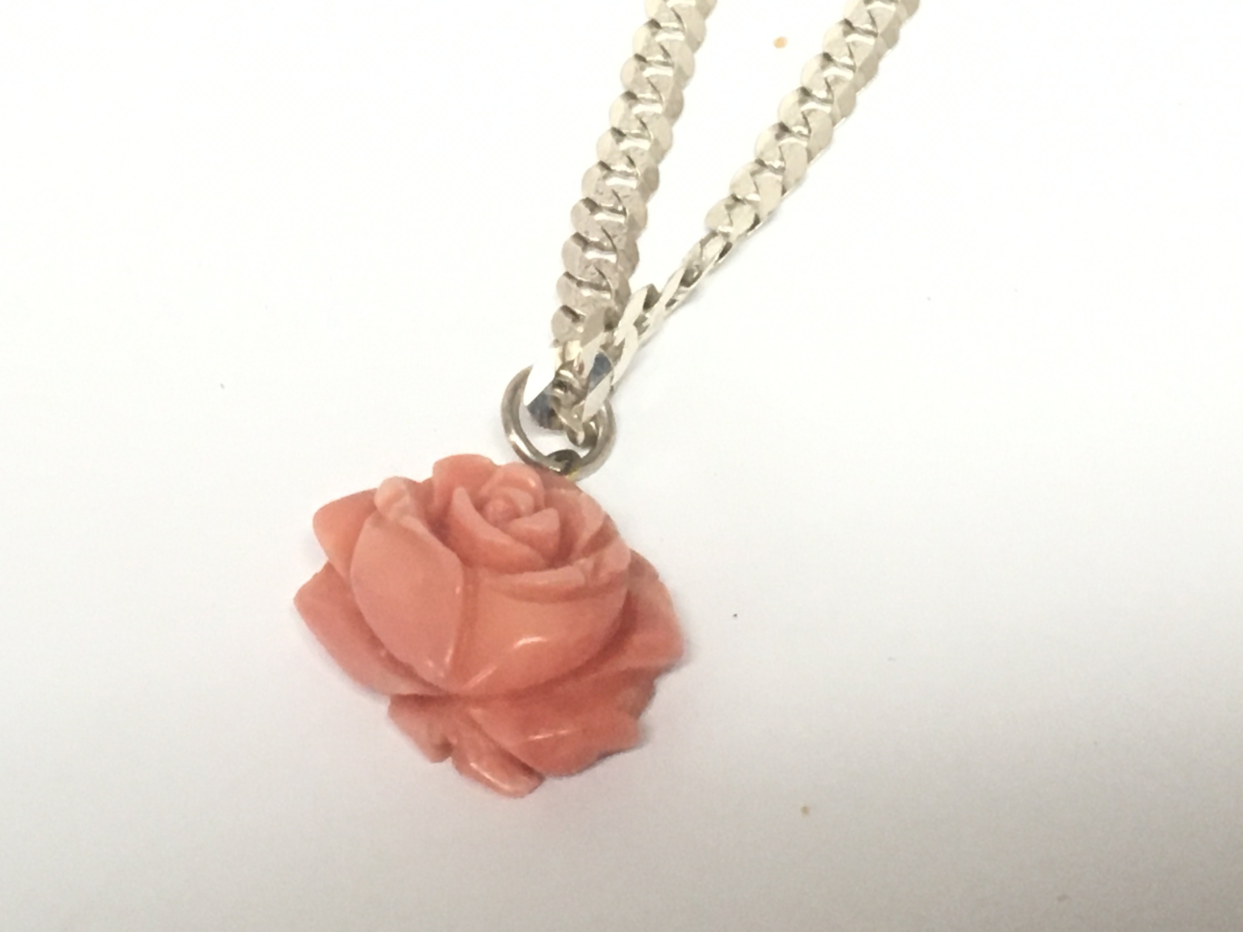 A silver necklace with carved coral pendant. Weight 22g. NO RESERVE