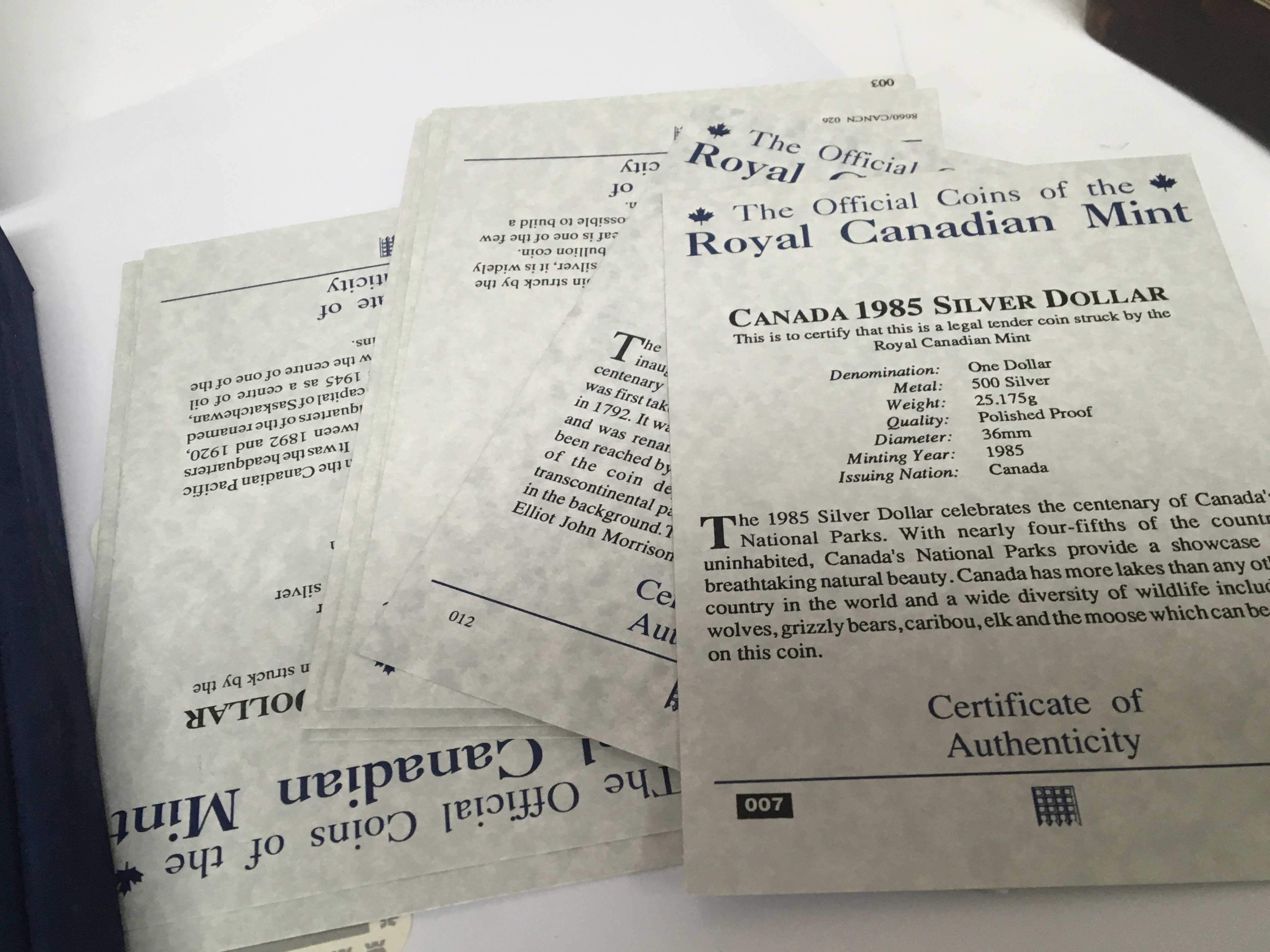 A Royal Canadian Mint silver dollar collection of coins (500) silver sixteen coins total with certificates in a fitted box.