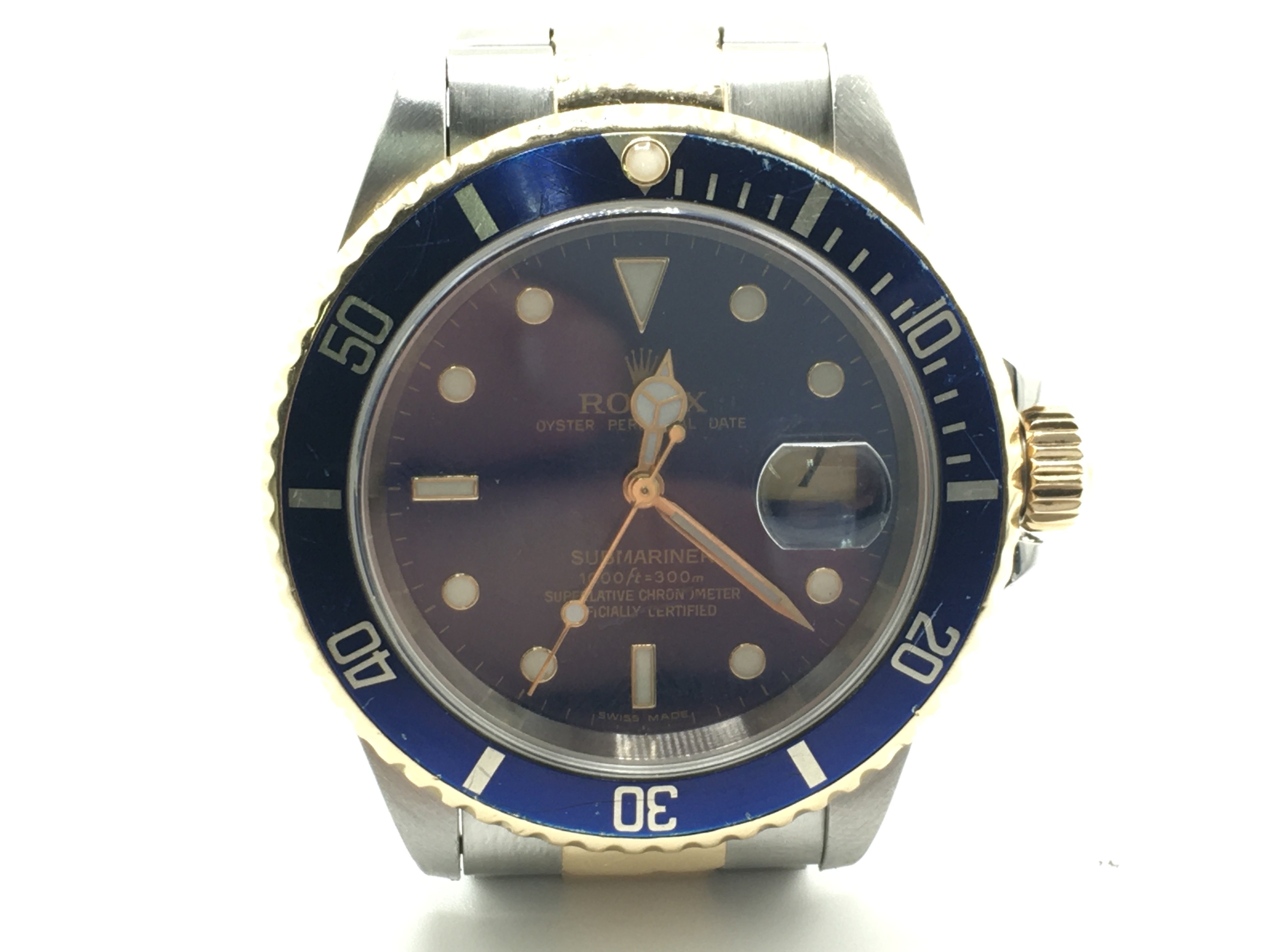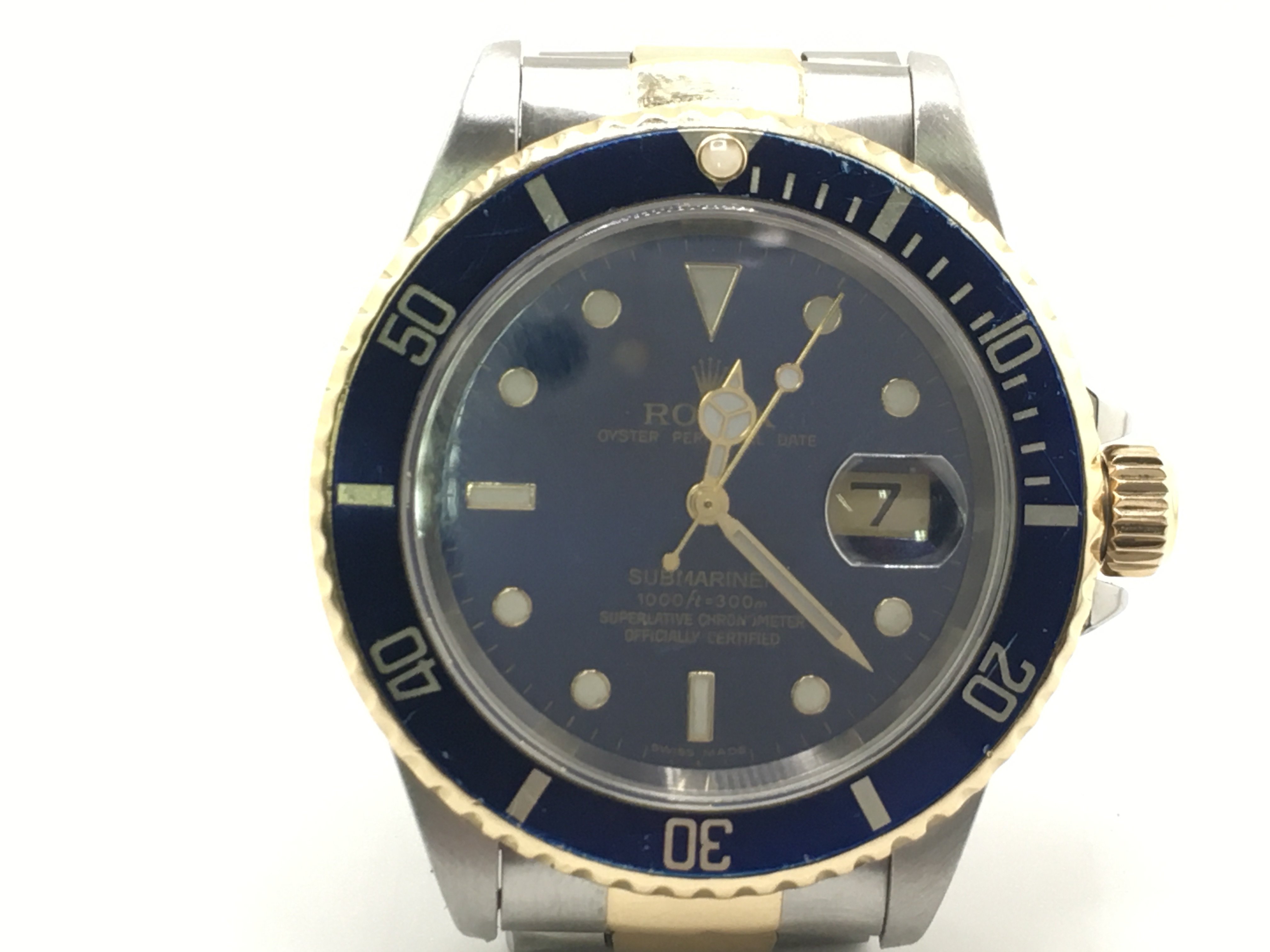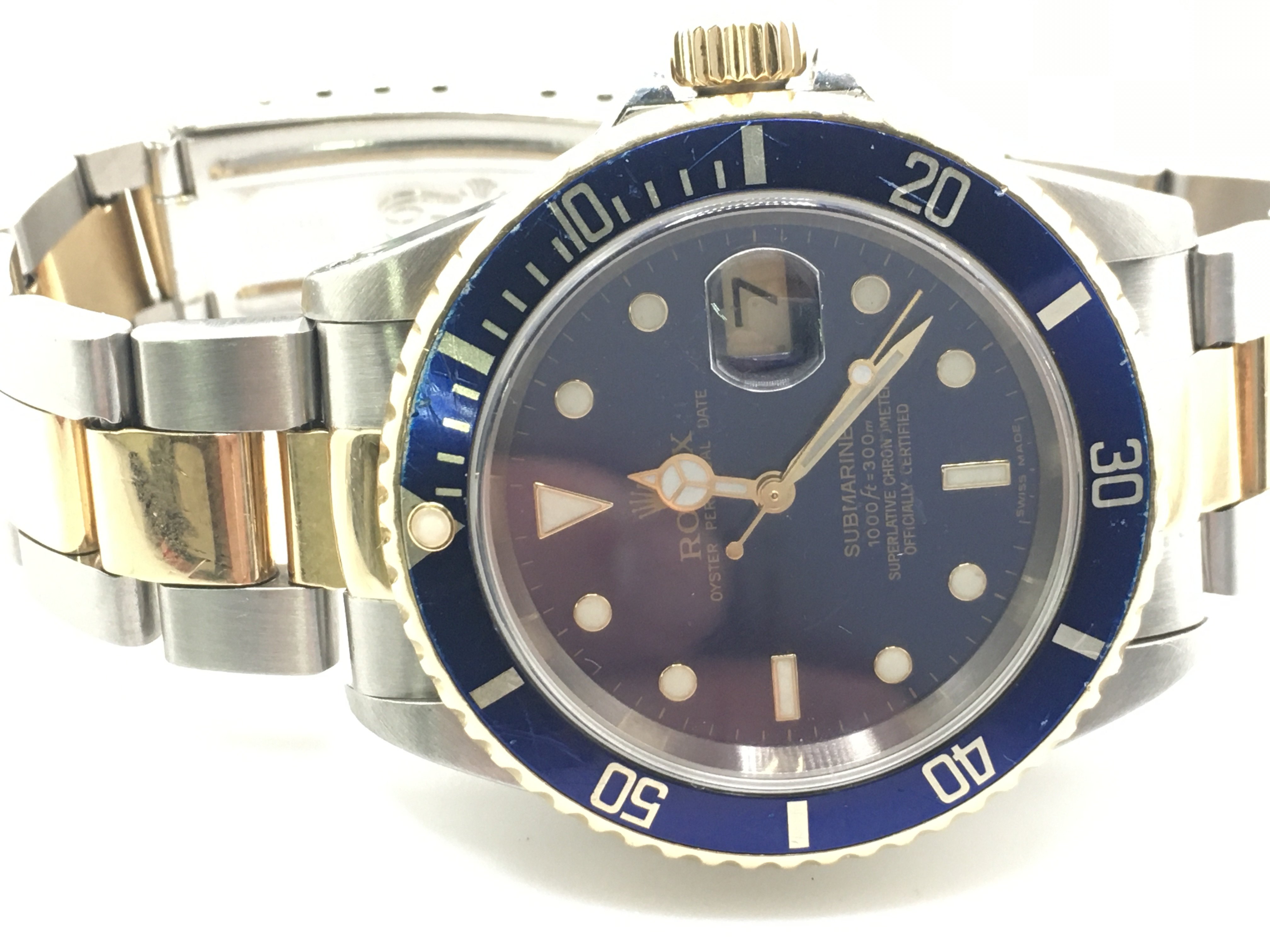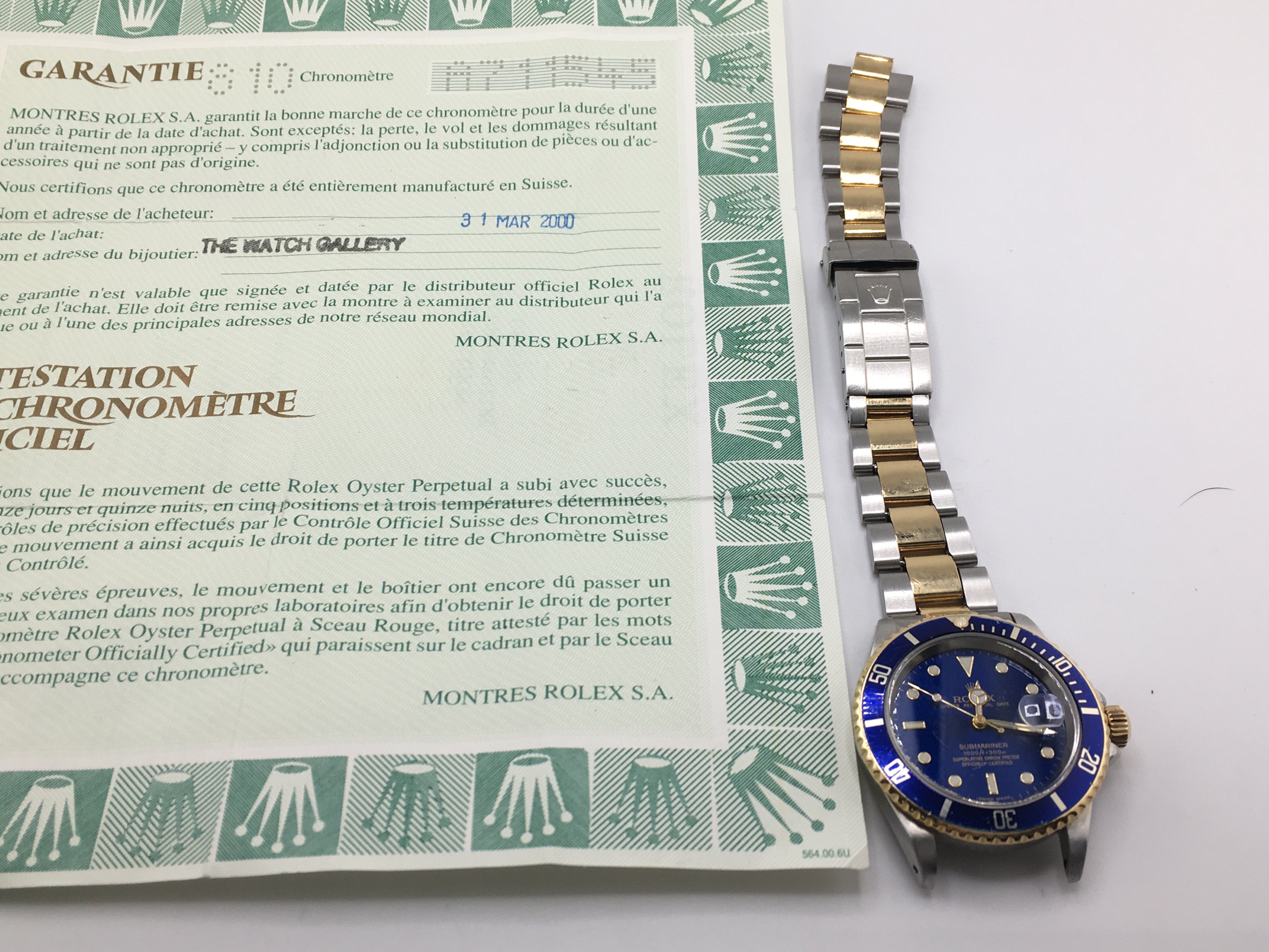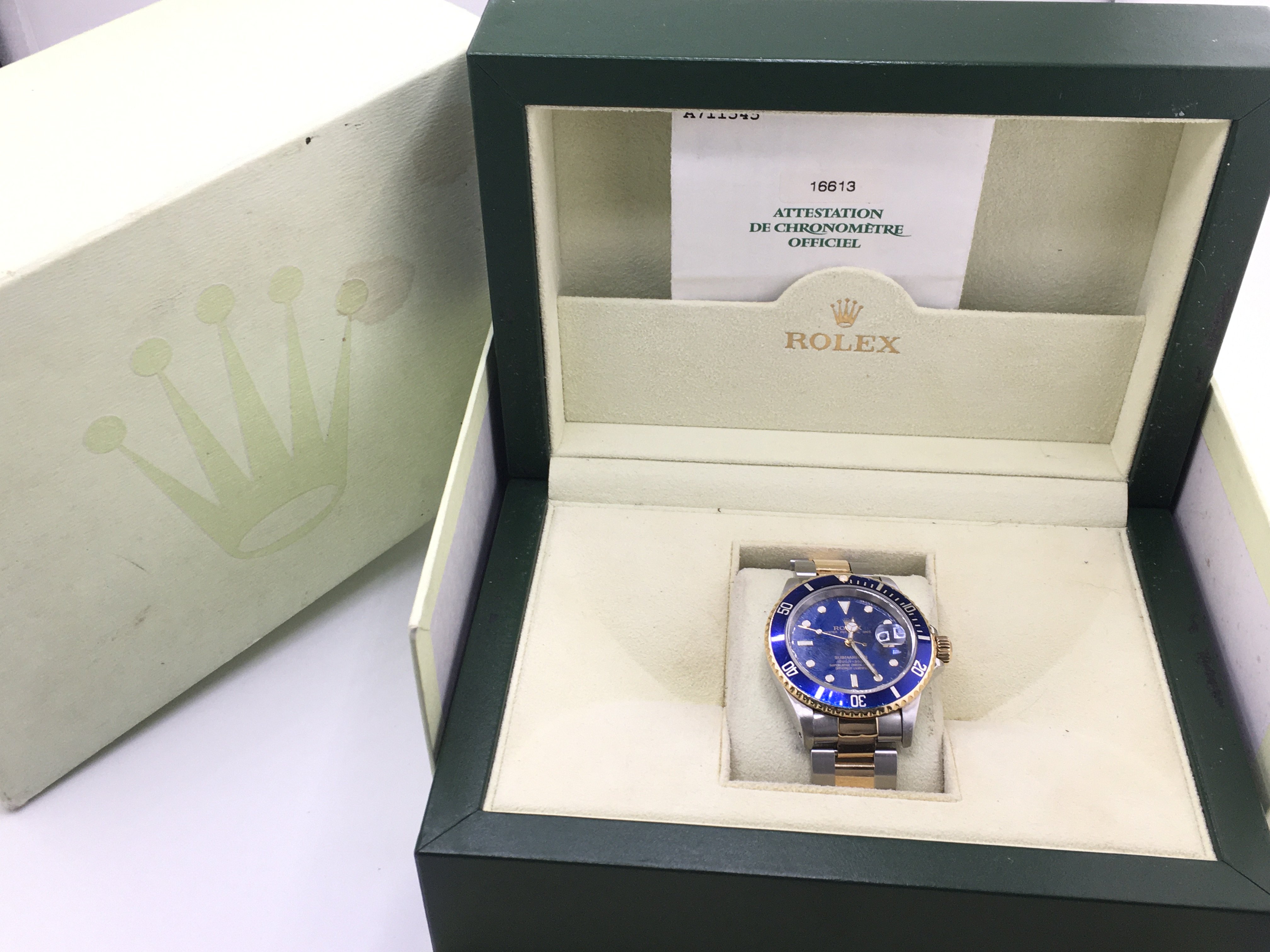 A rolex submariner ref 16613. Blue dial. 40mm gold and steel case. Seen running. Box and papers. The watch has signs of wear. Gold and steel bracelet with fold clasp.