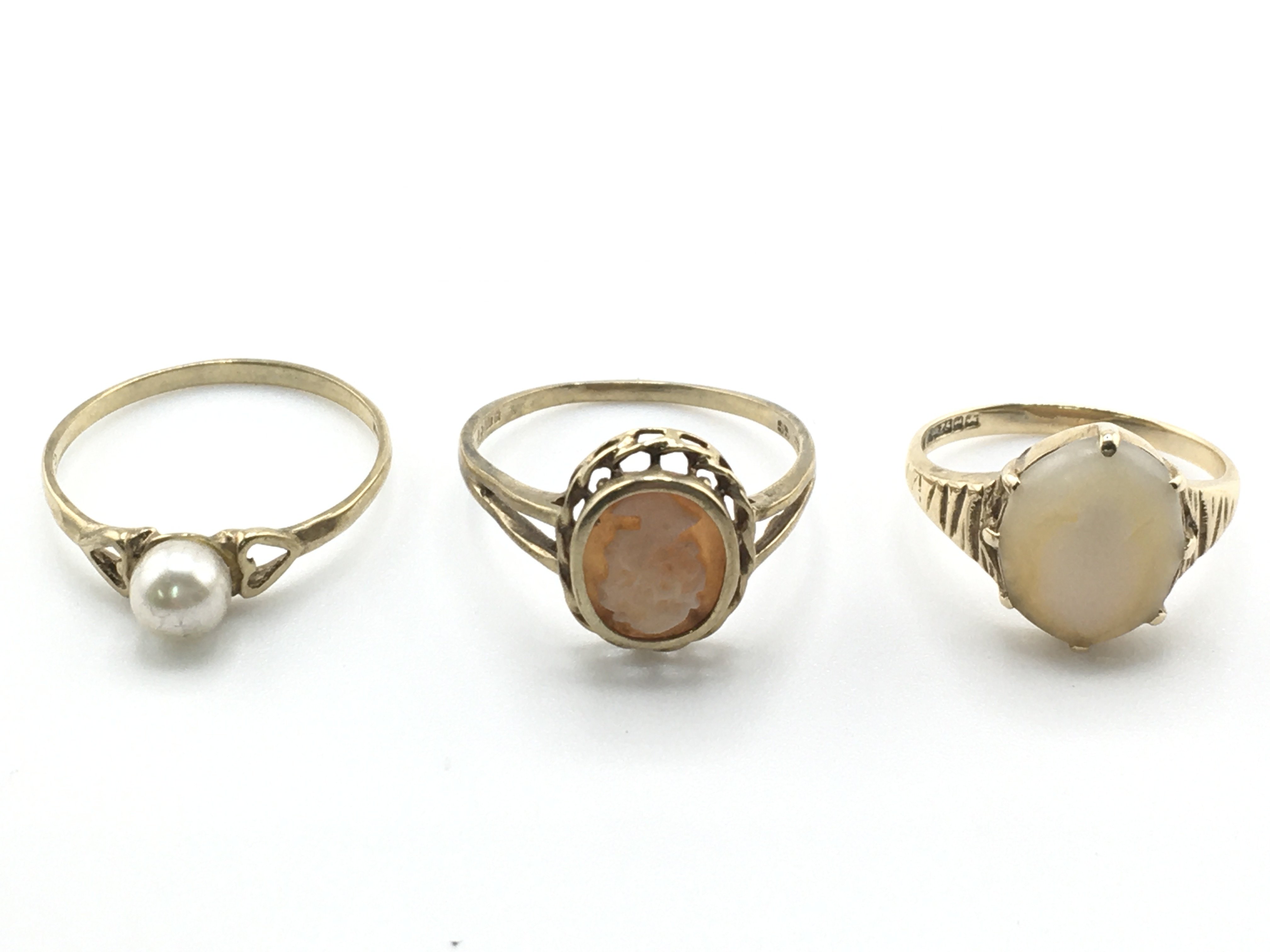 Three 9ct gold rings two set with cameos. 4.5g total. Postage A