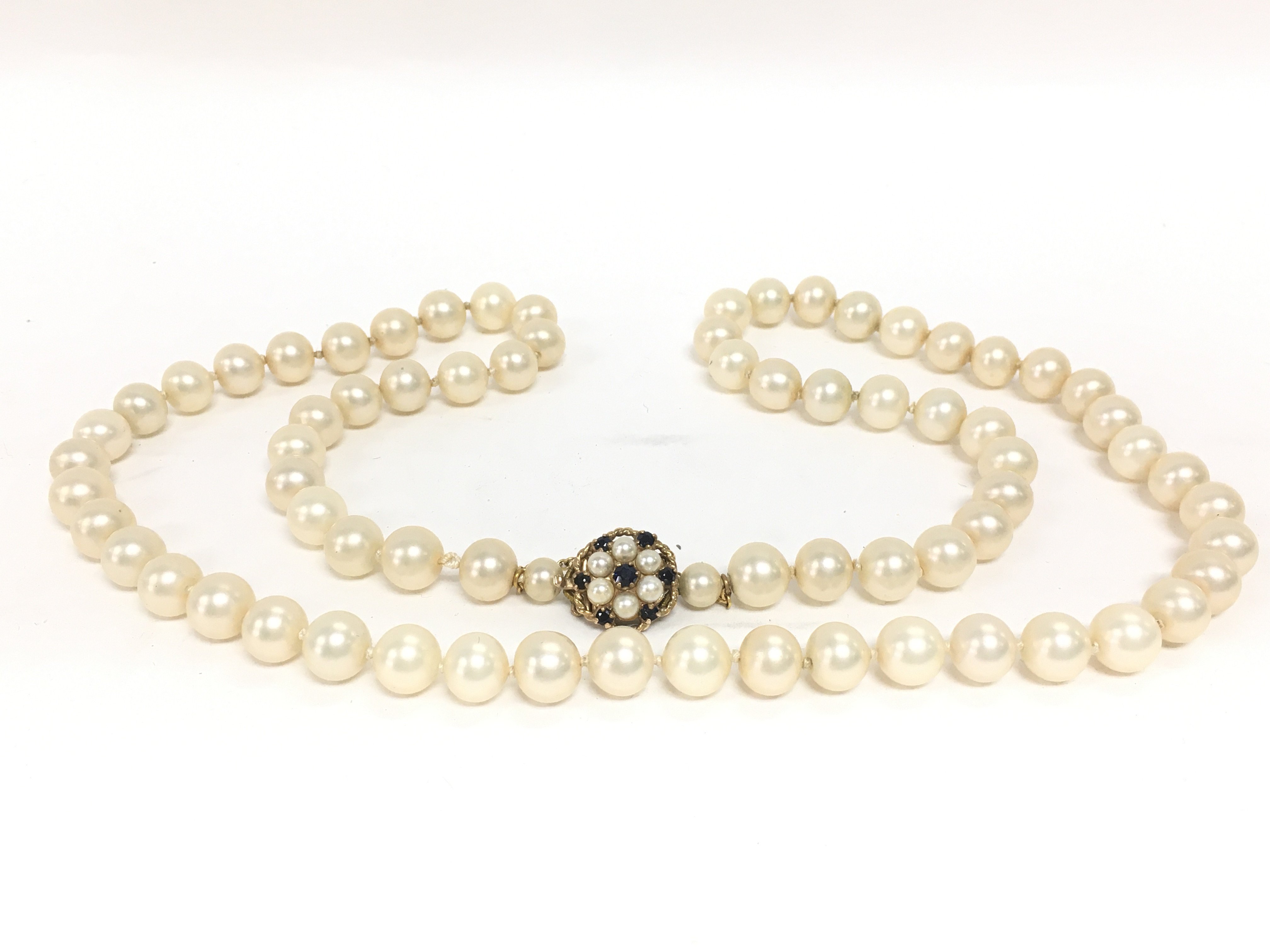 A string of simulated pearls with a 9 carat gold clasp set with blue sapphires and cultured pearls