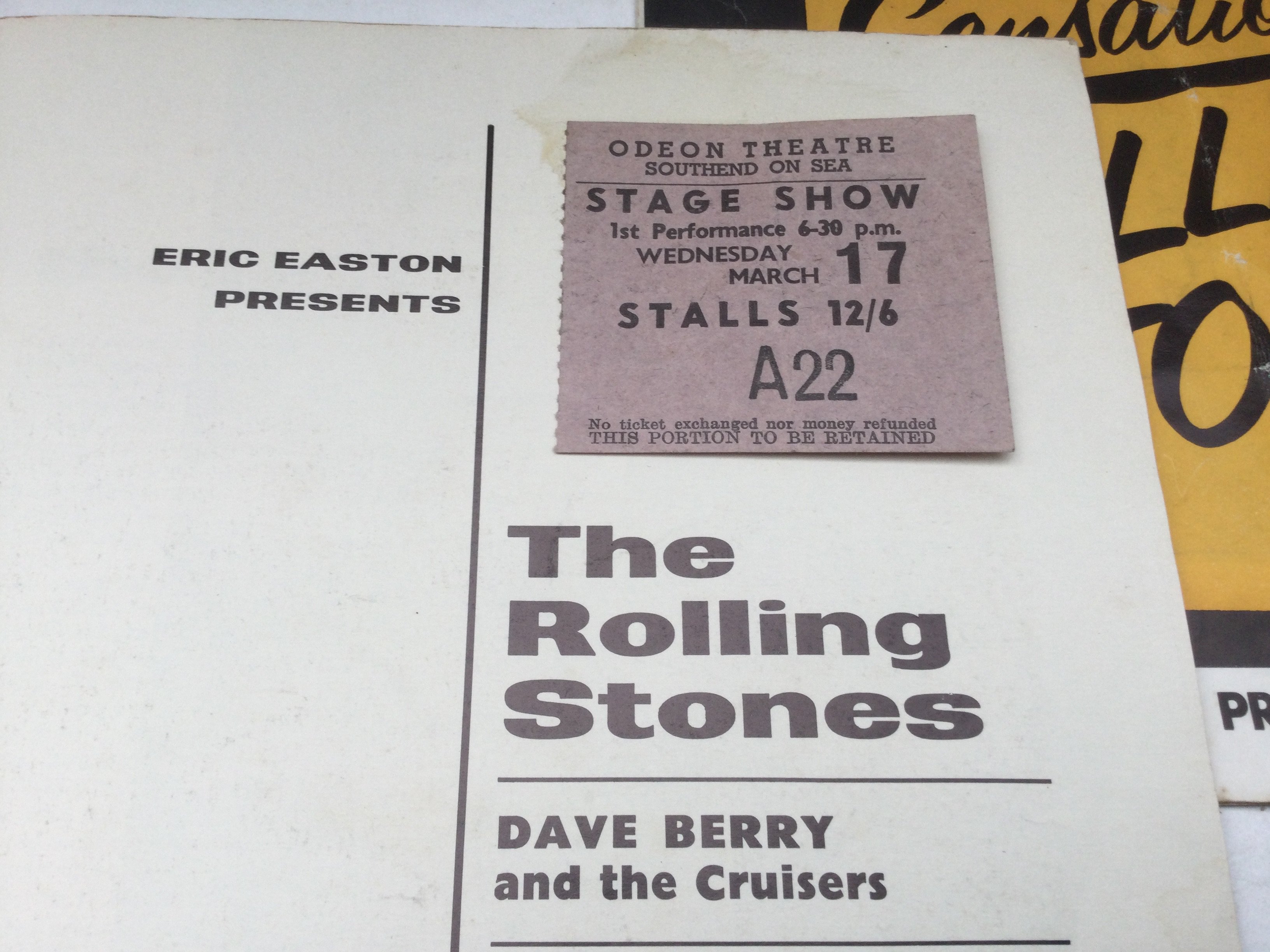 Two 1960s tour programs for The Rolling Stones including a ticket for an appearance at The Southend Odeon on Wednesday 17th March, 1965.