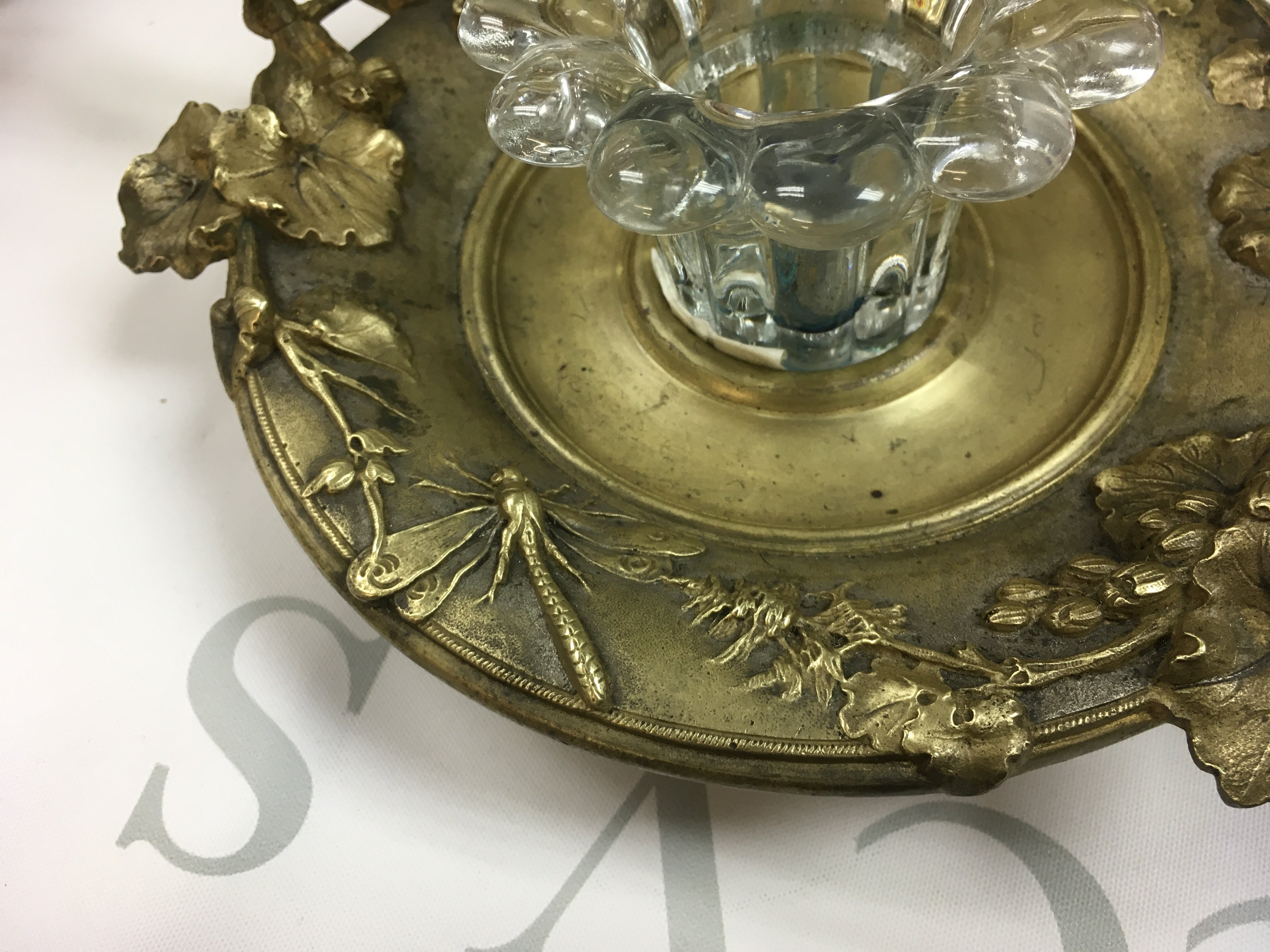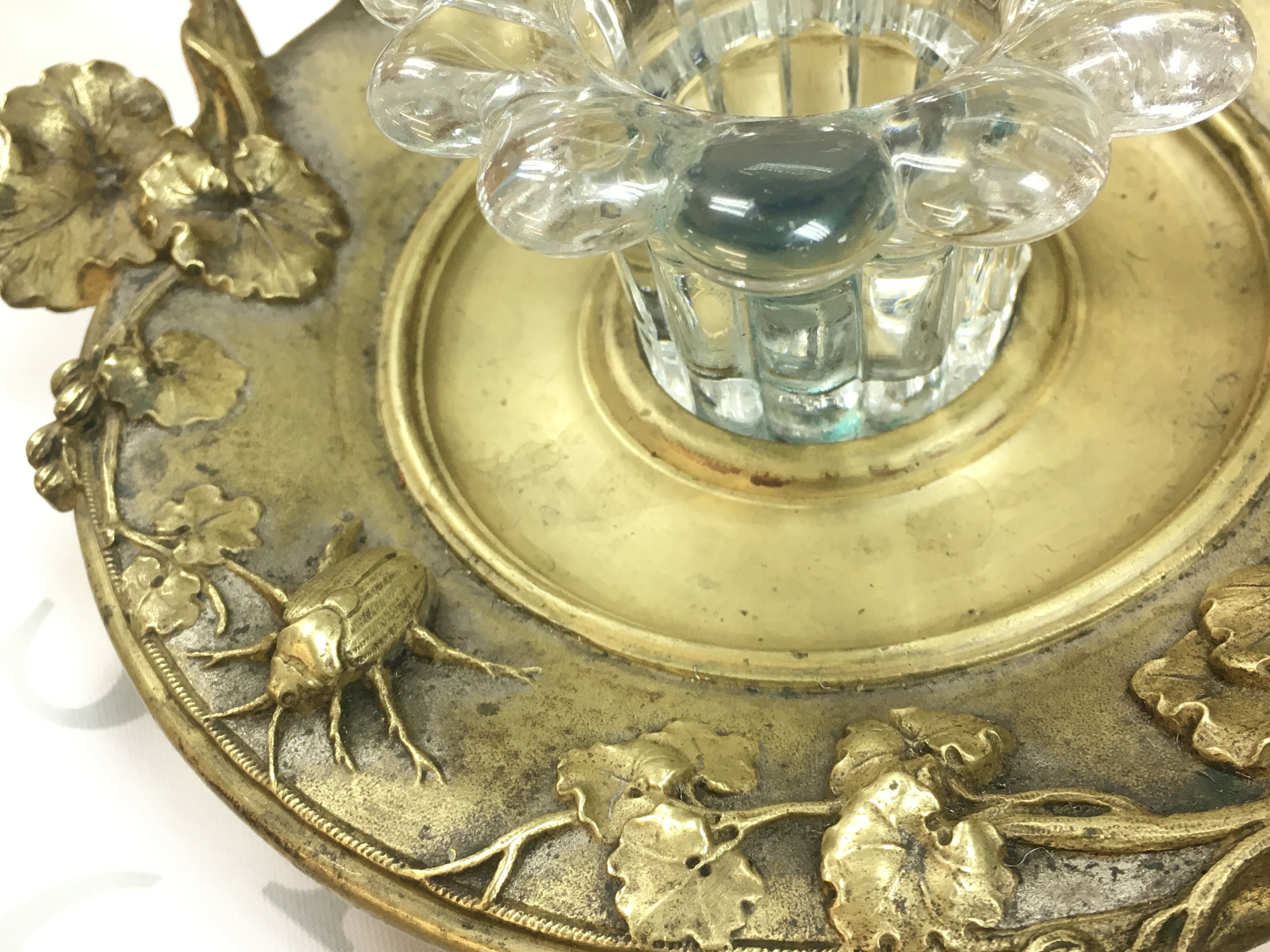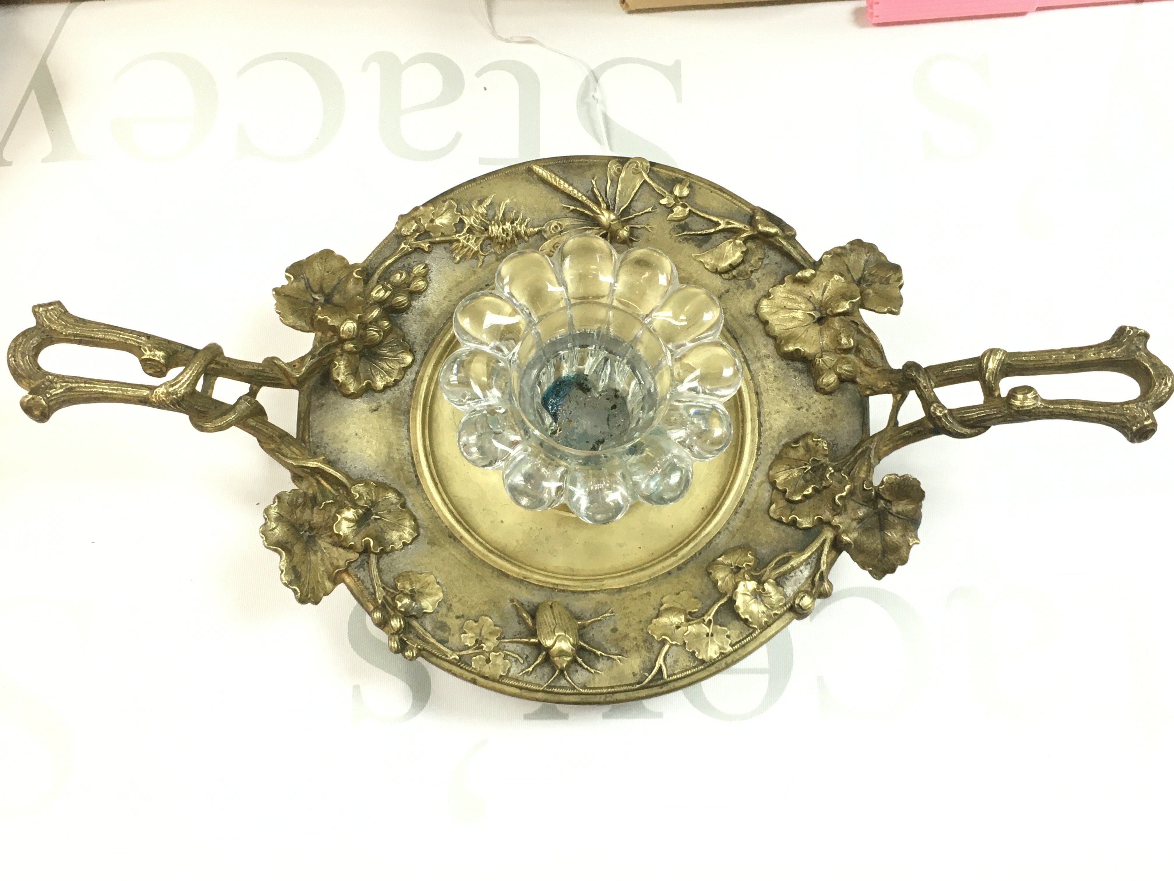 A Victorian Inkwell, heavy gilt brass base with embossed insects and leaves with two handles. This lot cannot be posted
