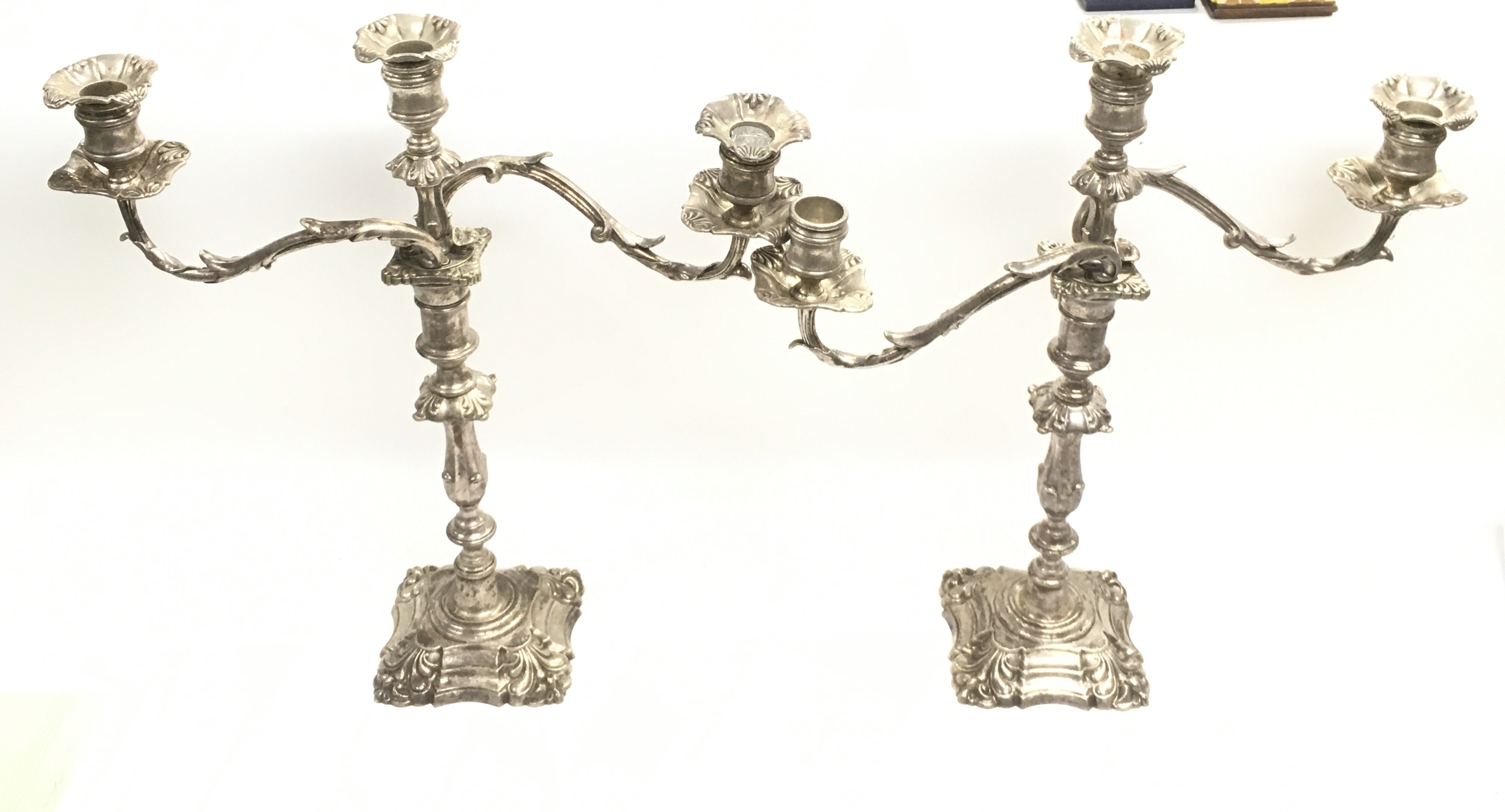 A pair of silver plated tri branch candelabras, 46.5cm tall. This lot cannot be posted