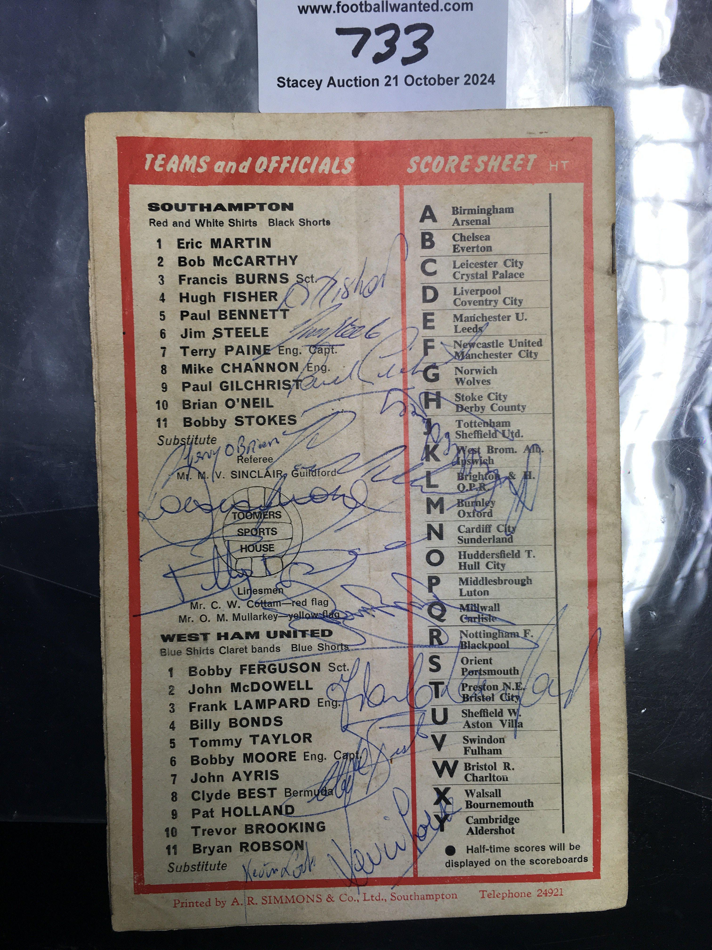 Bobby Moore Signed West Ham Football Programme: 72/73 Southampton away programme signed to rear team page by some of both teams. West Ham players include Moore Lock Lampard Bonds and Brooking.