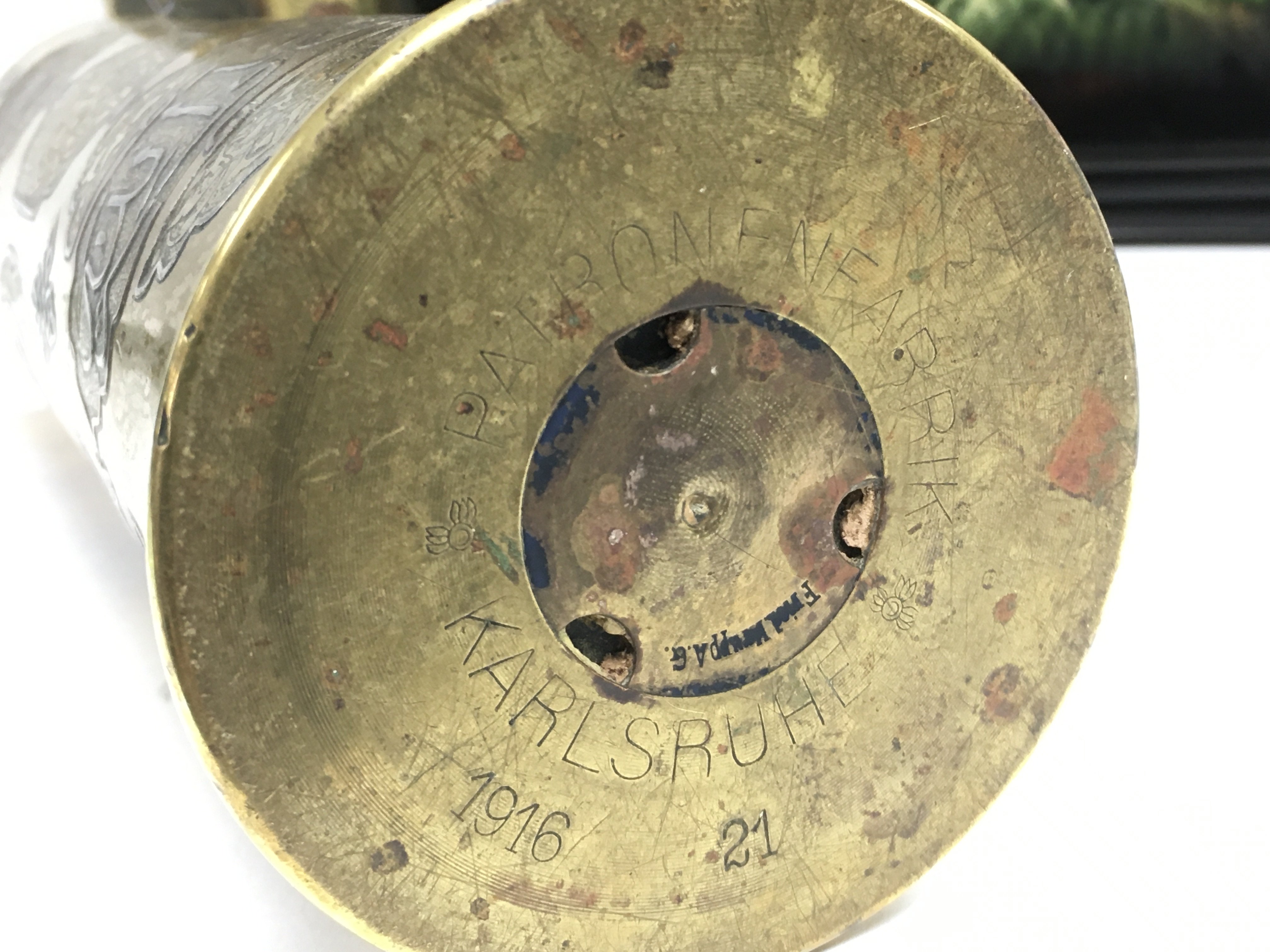 A pair of WW1 German trench art shell cases decorated with Arabic lettering and designs and a set of Oriental trays. Postage category C