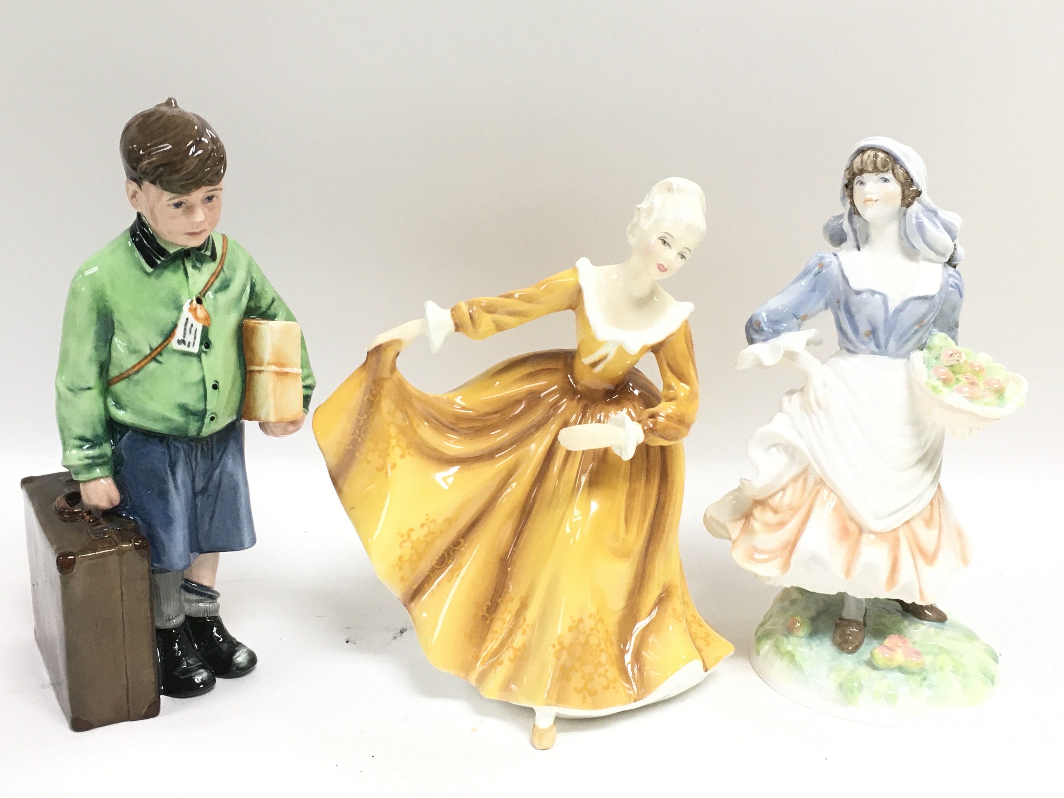 Porcelain figures including Royal Doulton The Boy Evacuee HN3202 and Kristy HN2381, a Royal Worcester Old Country Ways figure. This lot cannot be posted