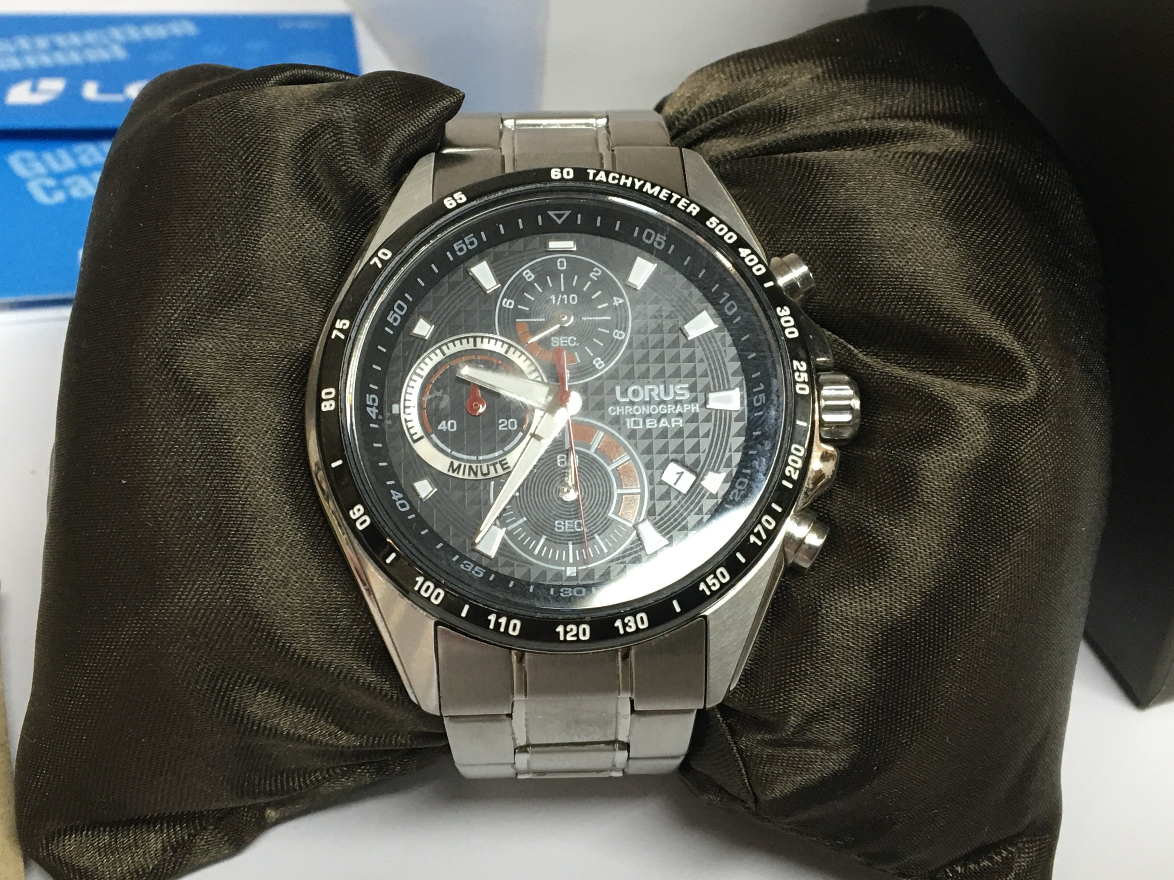 A Lorus 10 Bar Chronograph watch as new seen working with box paperwork and extra links.