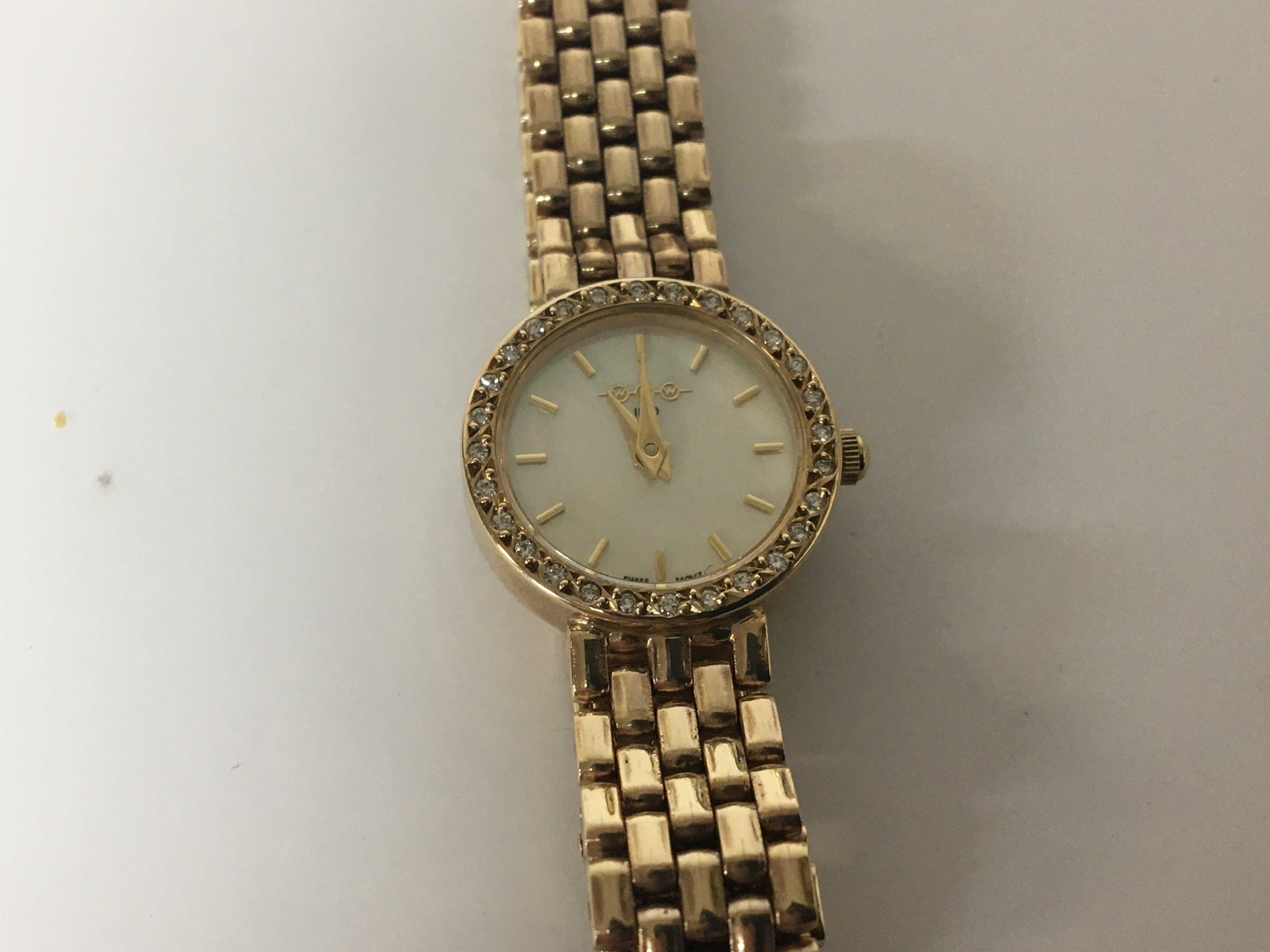 A 9carat gold ladies watch maker WHW with mother of pear effect dial and diamond set bezel 9carat gold strap weight 27g. Not seen working quartz will need a new battery.