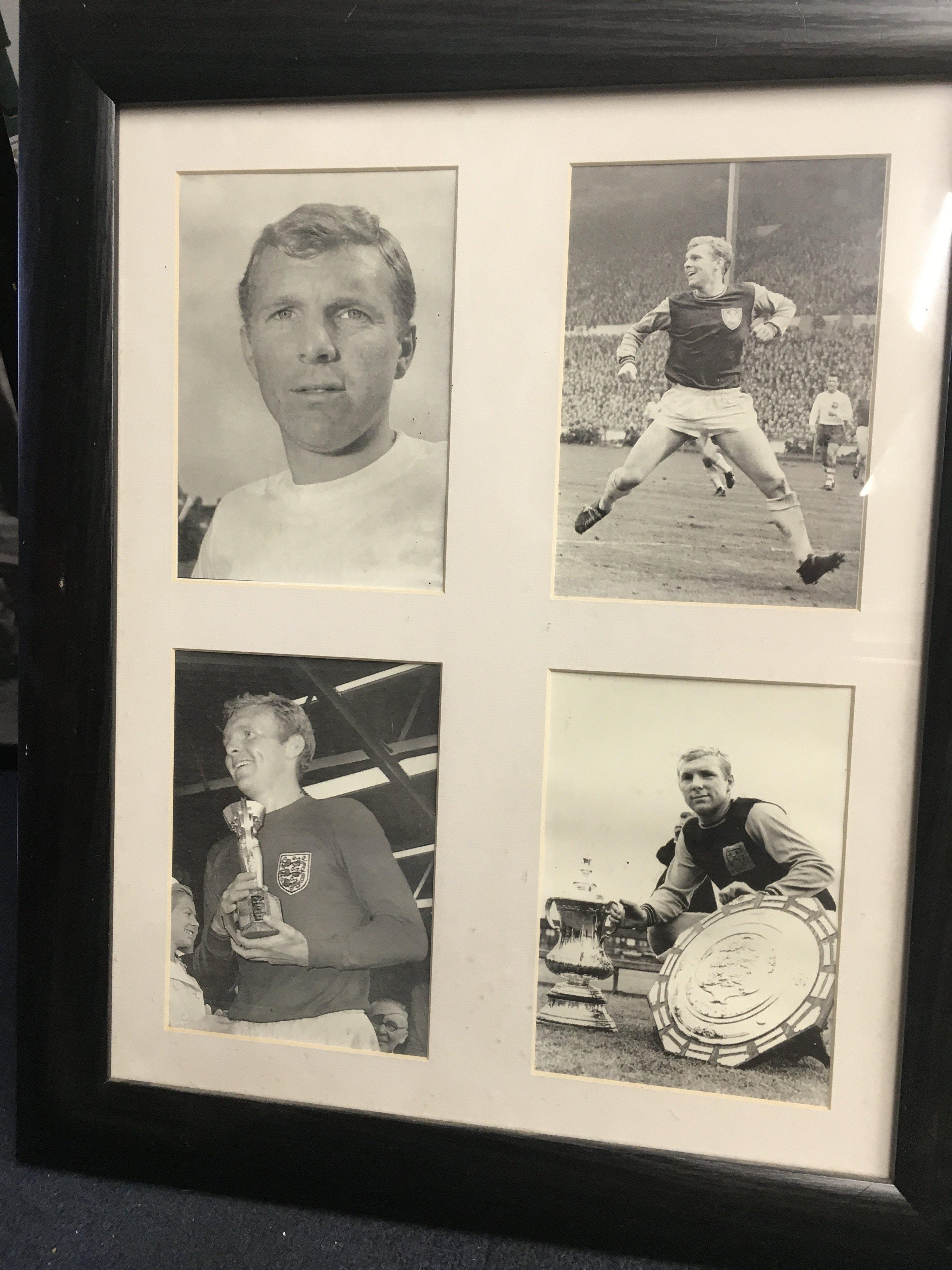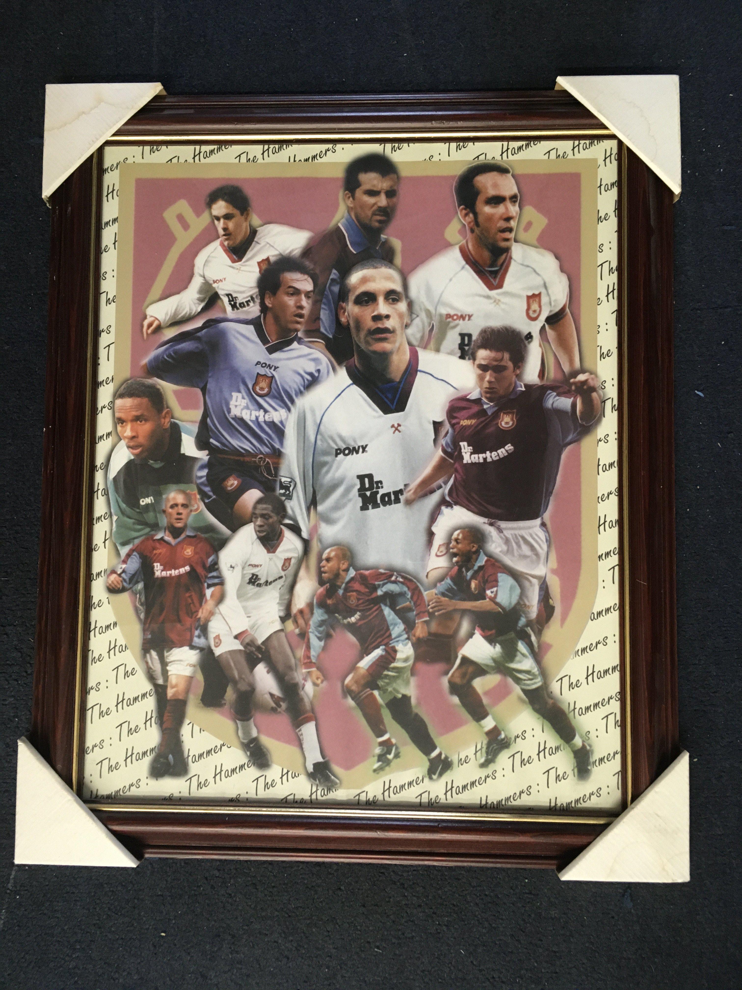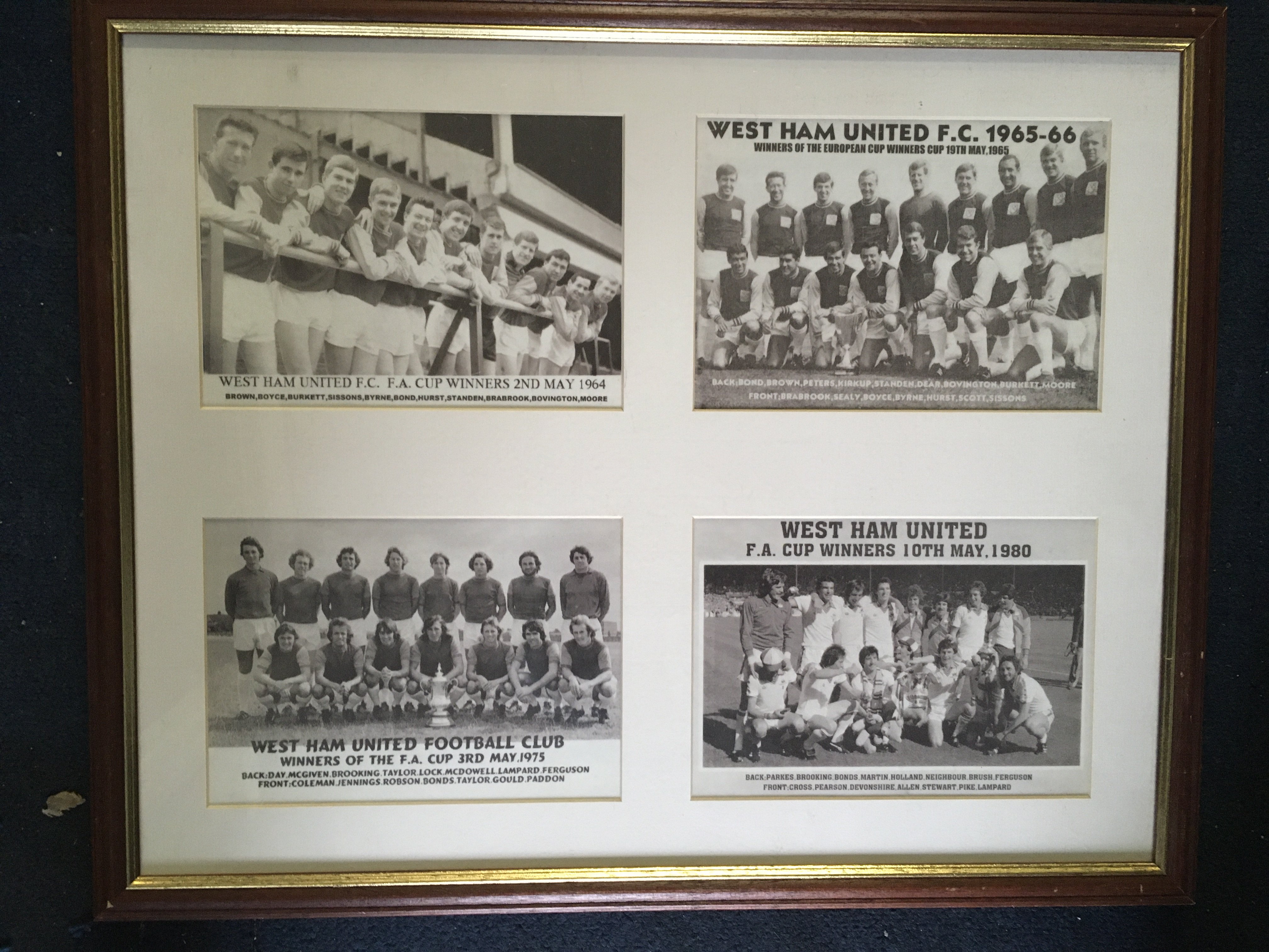 West Ham Framed Football Displays: Subjects are cup winning teams, Bobby Moore and a montage of players from around 2000. 3 items with instructions to sell. Not for posting.