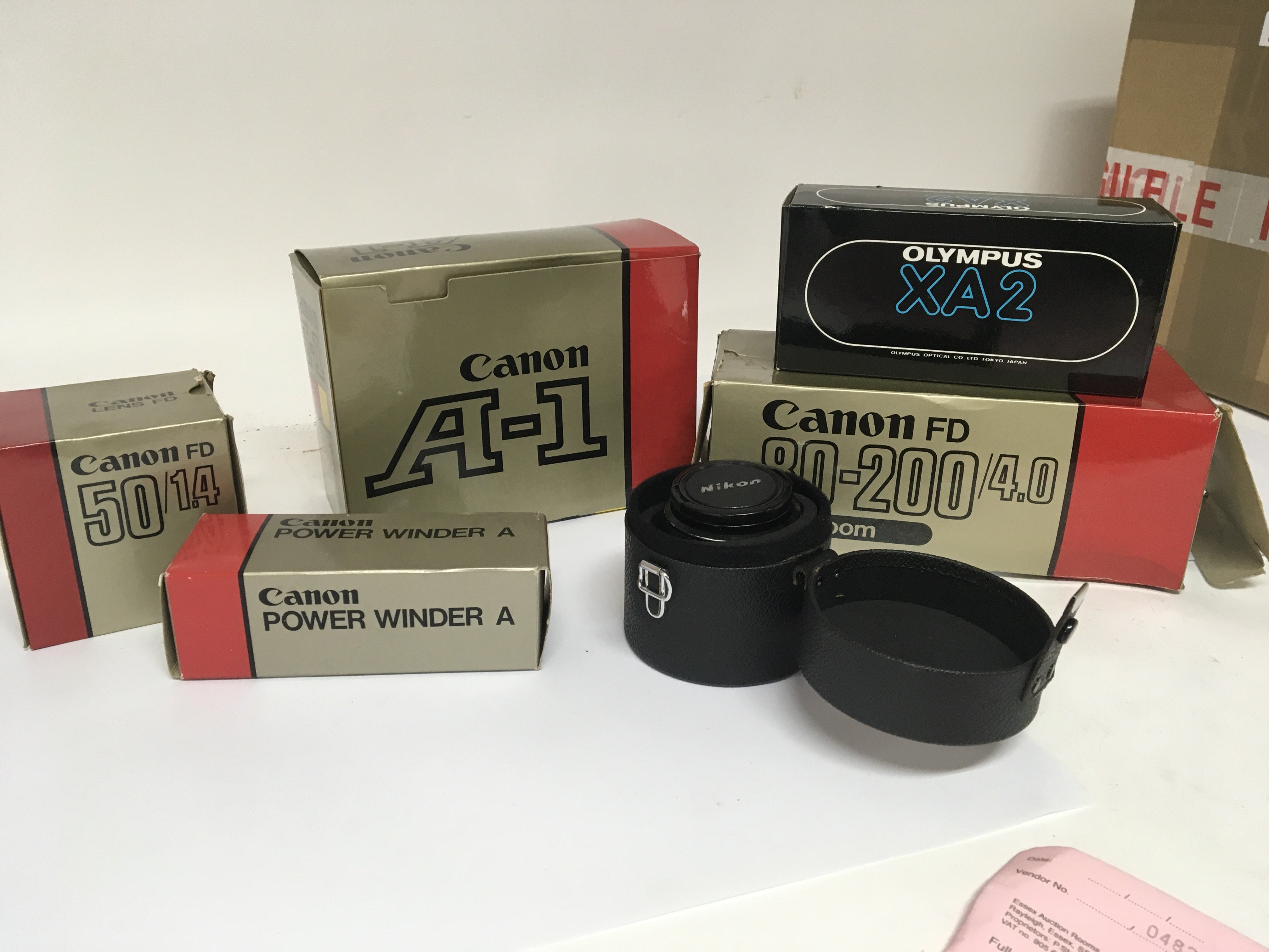 A boxed as new Canon A1 Camera with two boxed Canon Lens 80-200 Zoom and 50/1.4 a canon winder A a boxed Olympus XA2 and a Nikon 24mm 1:2.8.