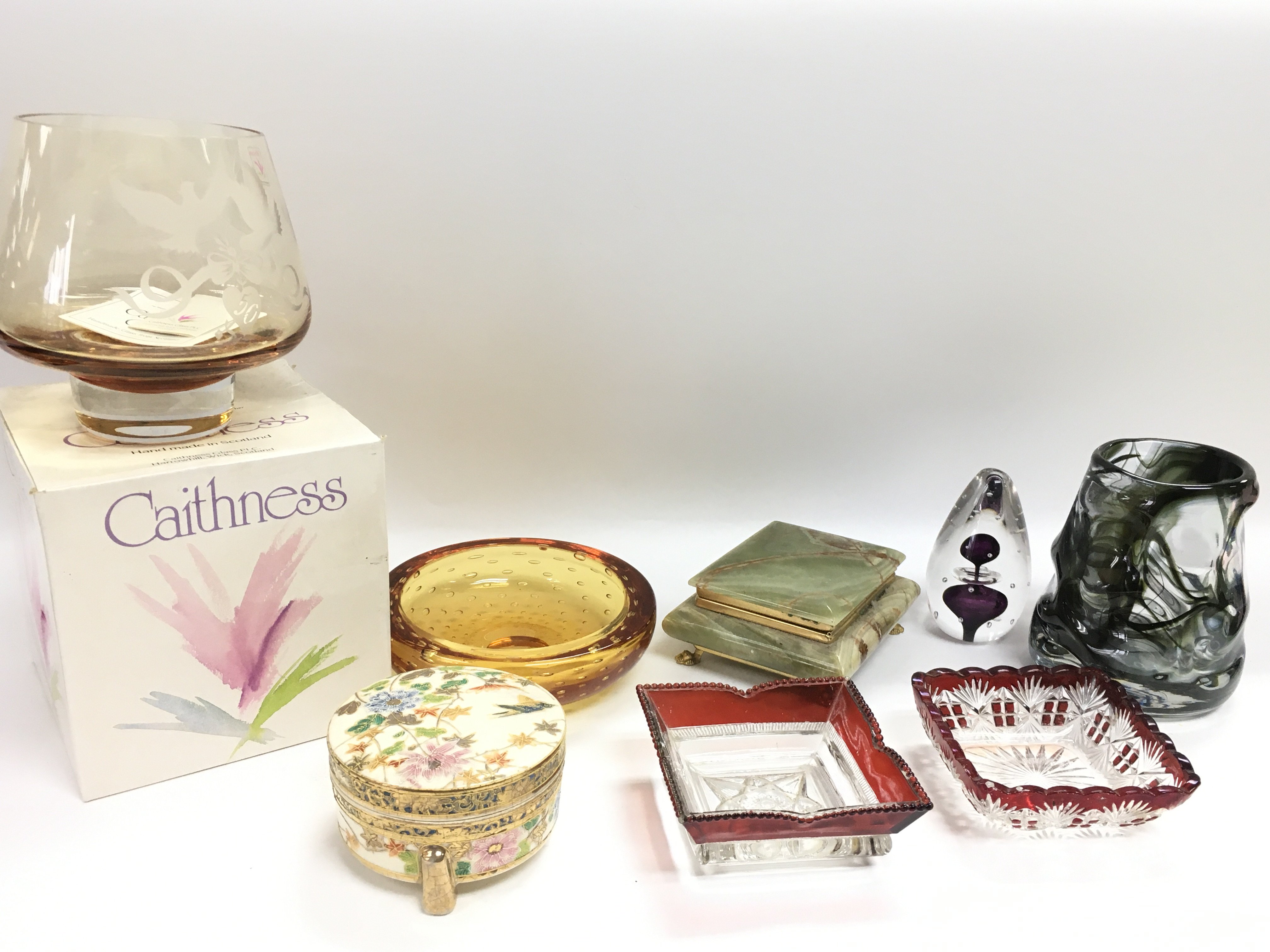 A collection of art glass including a Whitefriars vase, A Boxed Caithness vase, various paperweights Etc. This lot cannot be posted