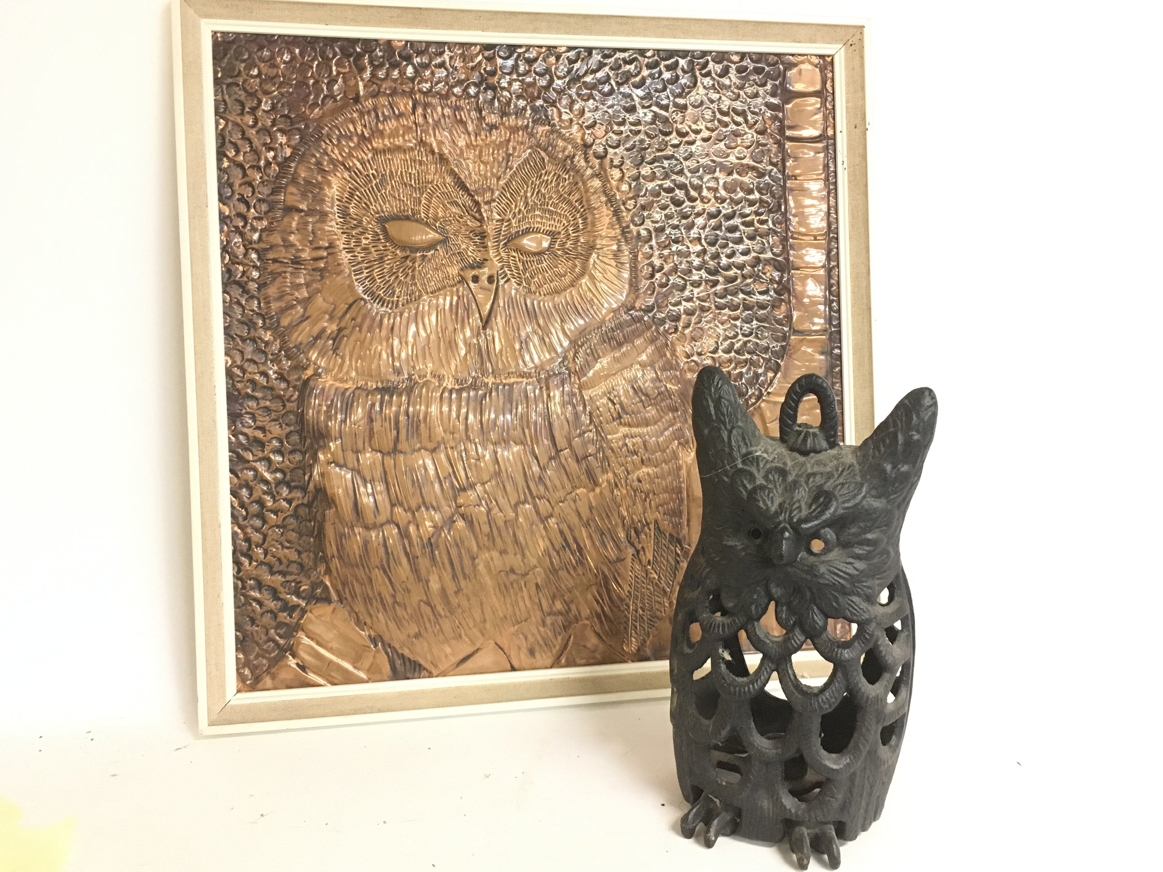 A copper panel of an owl Dimensions (47x47cm) and a cast iron owl lantern. This lot cannot be posted- NO RESERVE
