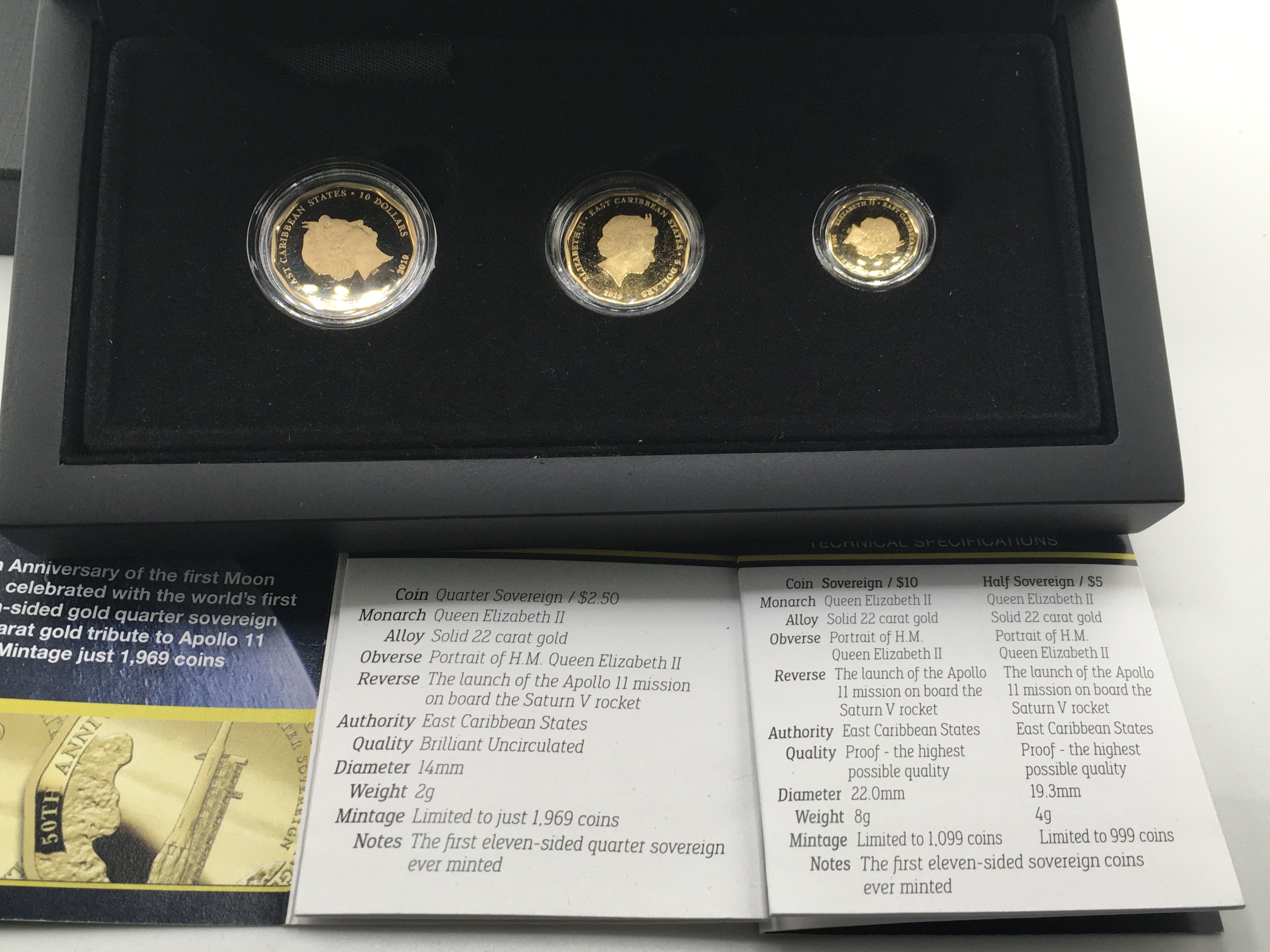 50th anniversary of moon landing three coin gold proof set including full half and quarter sovereign. Postage B