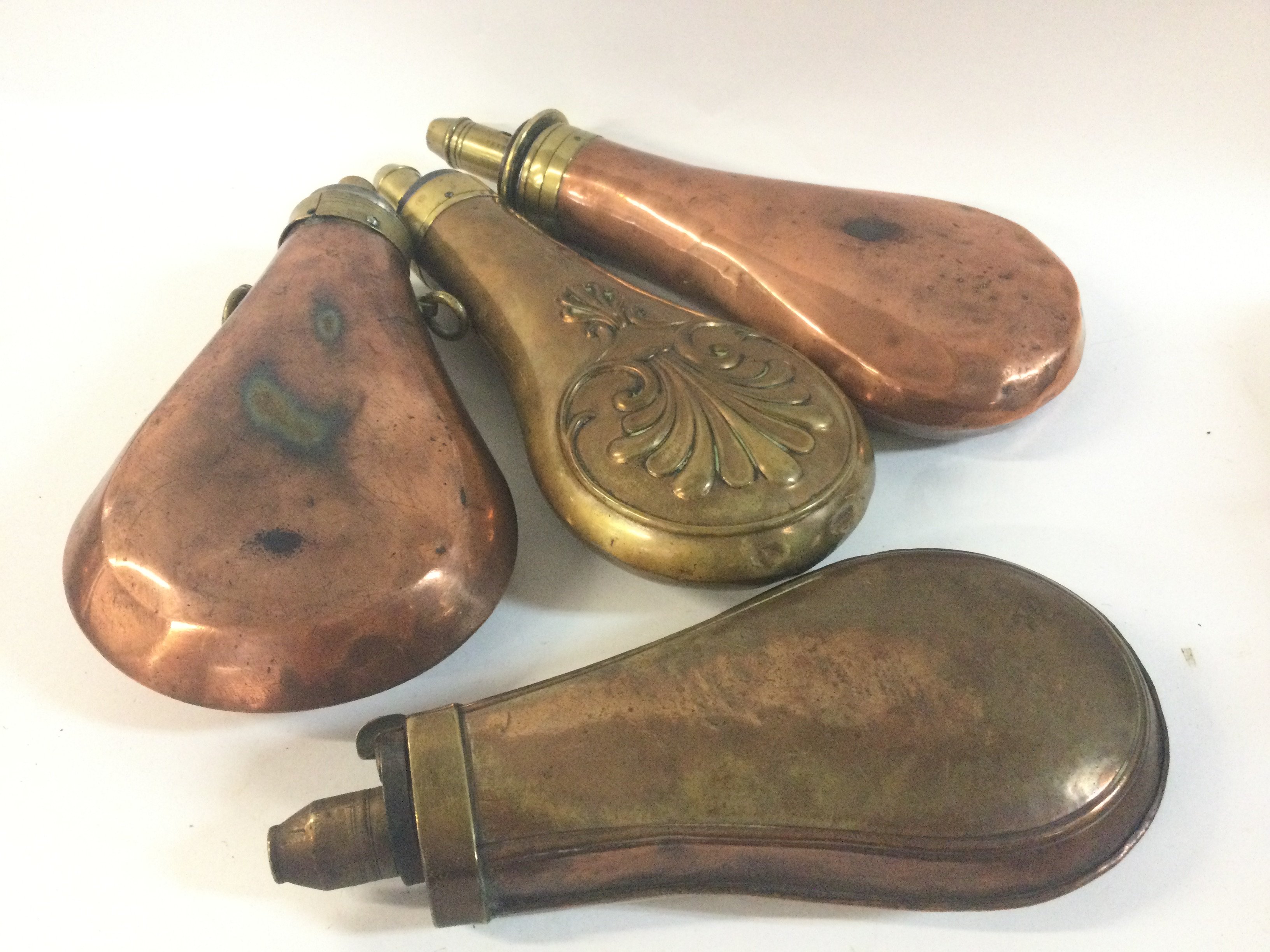 Four 19th century brass and copper gun powder flasks. NO RESERVE