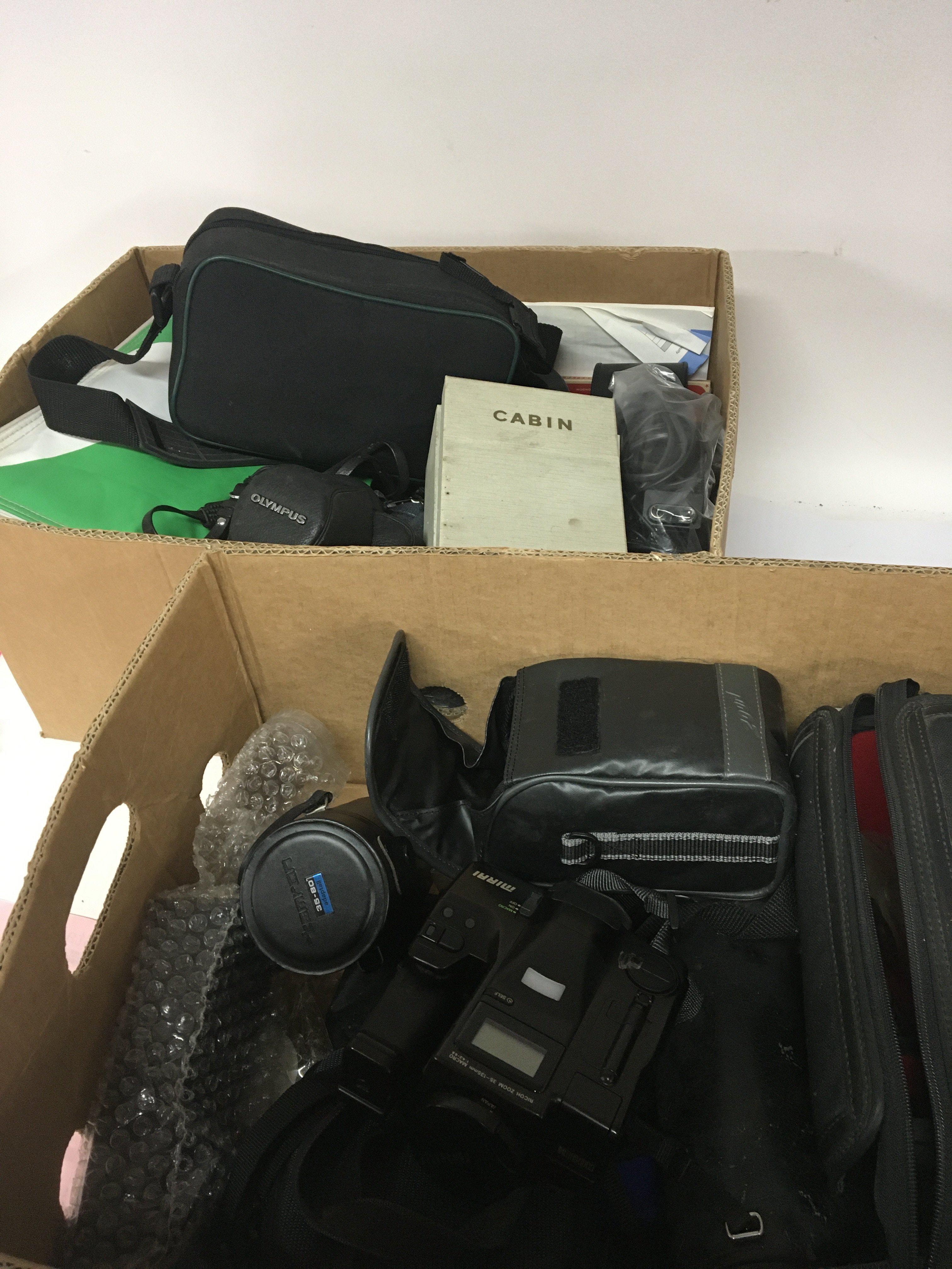 Two boxes containing cameras and equipment an Olympus Camera an unusual 35mm digital camera maker Mirri Japan. and other accessories.