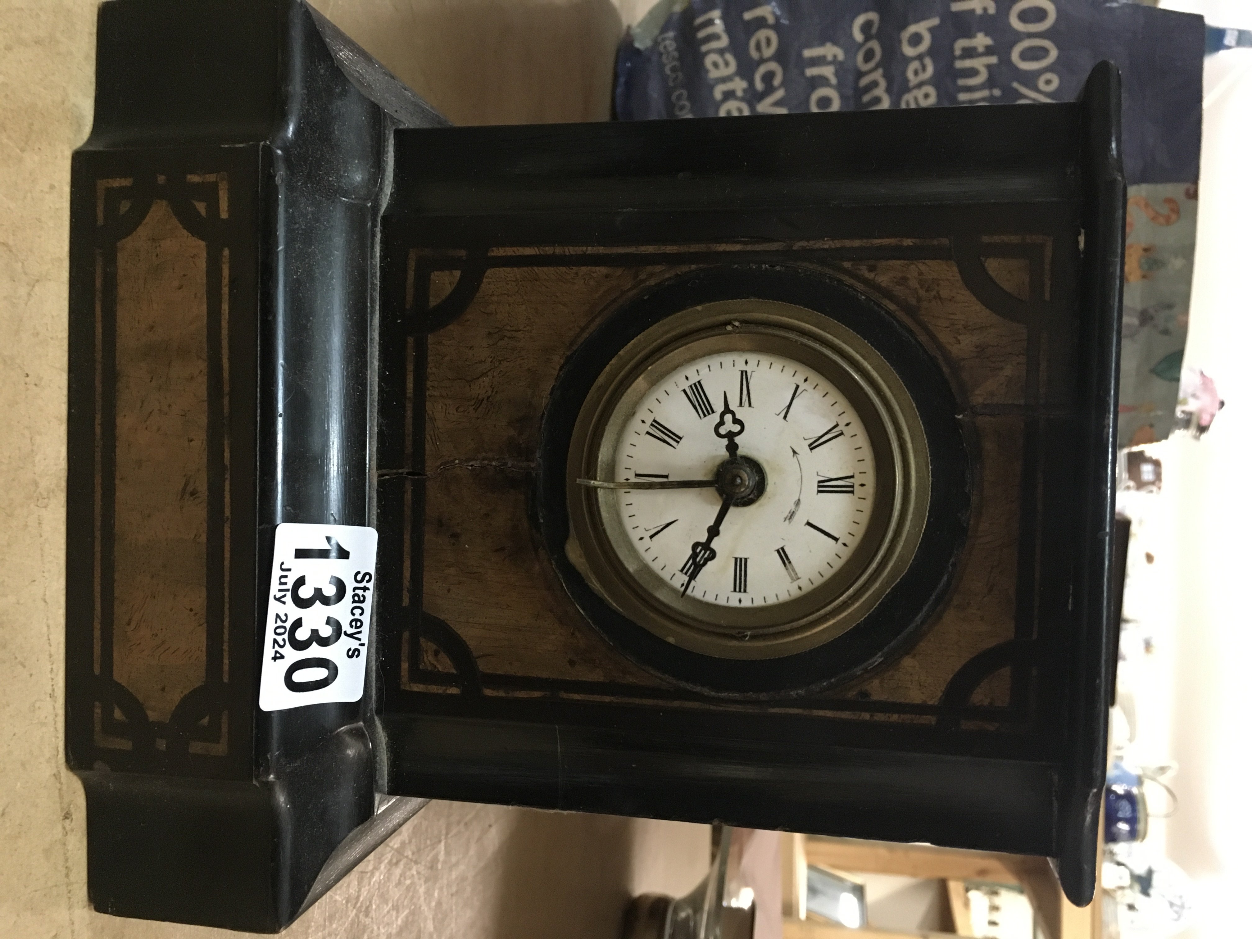 A black wooden mantle clock, the circular dial having Roman Numerals NO RESREVE