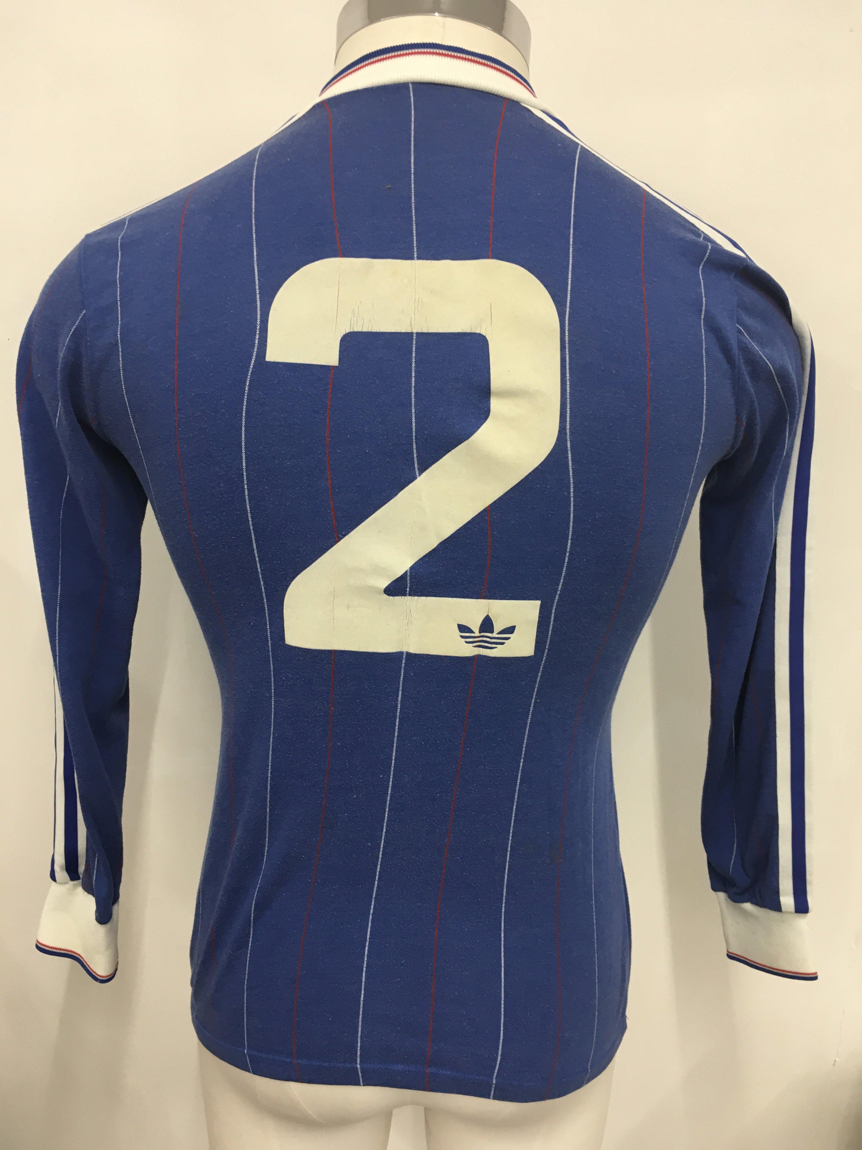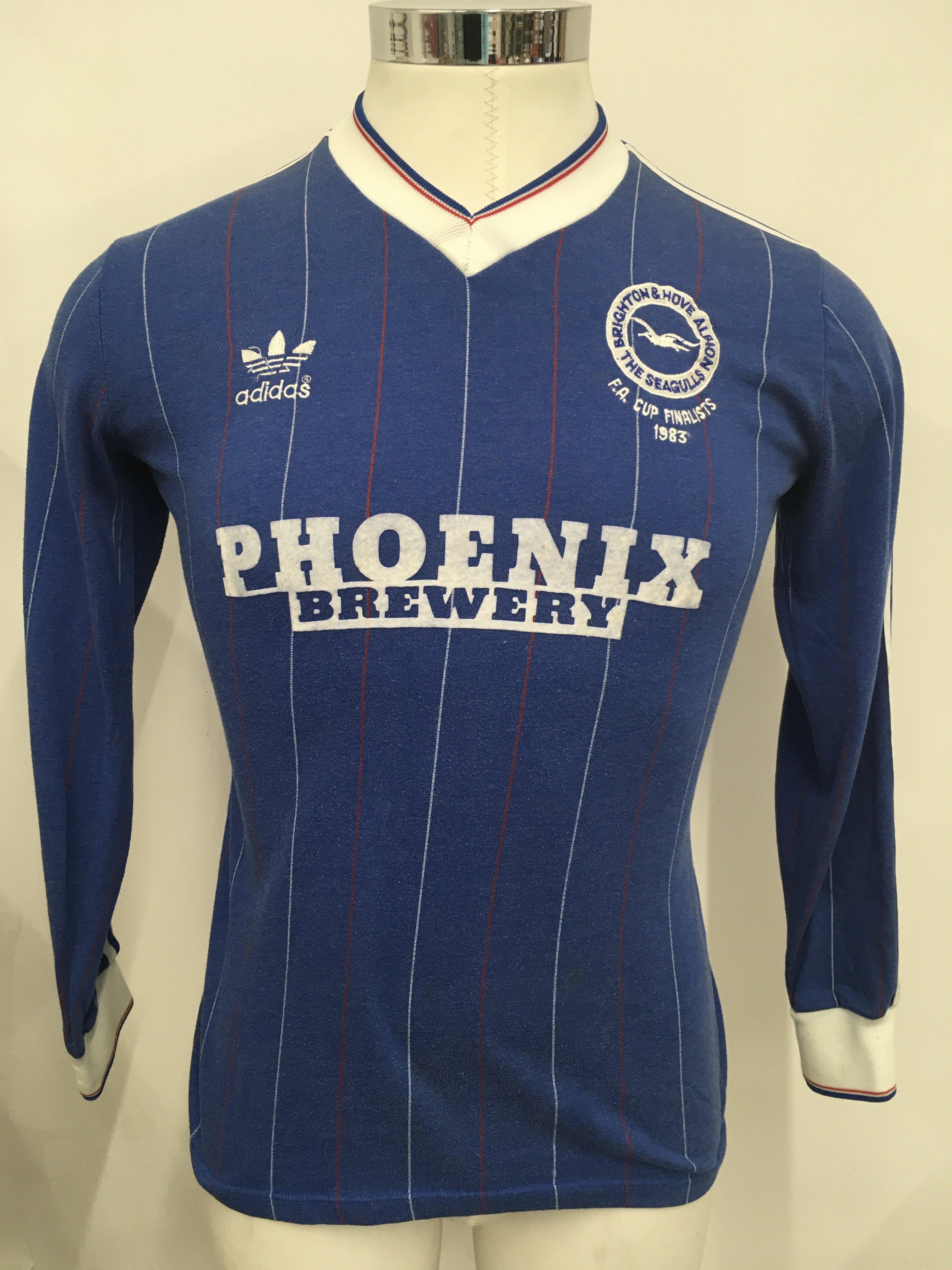 Brighton 83/84 Match Worn Home Football Shirt: Number 2 long sleeve pinstriped blue Adidas shirt. Under the Brighton breast badge are the words FA Cup Finalists 1983. Excellent condition rare shirt worn by Chris Hutchins who joined in this season and eventually played 153 times for Brighton.