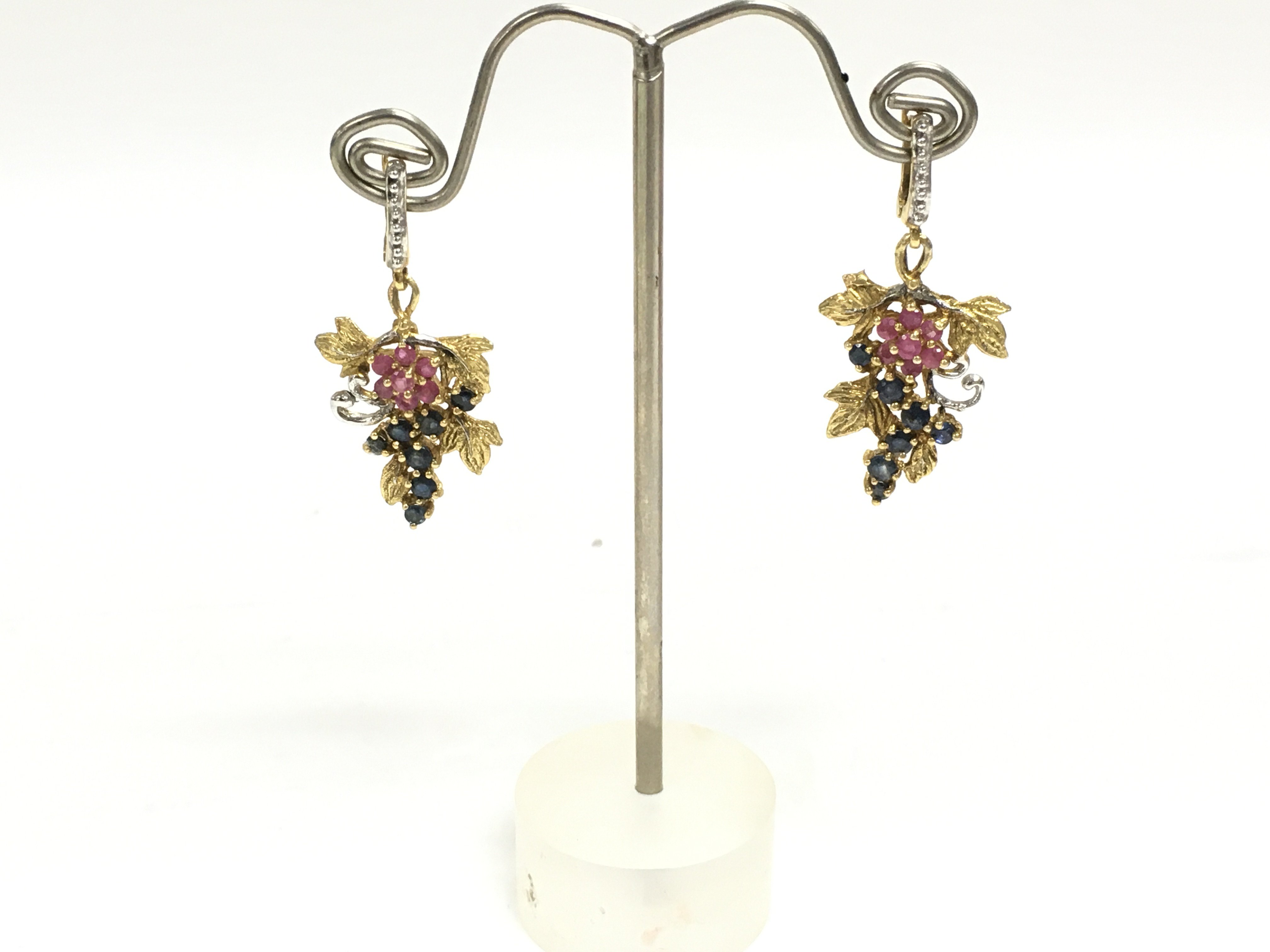 Silver gilt ruby and sapphire set drop earrings. Postage category a