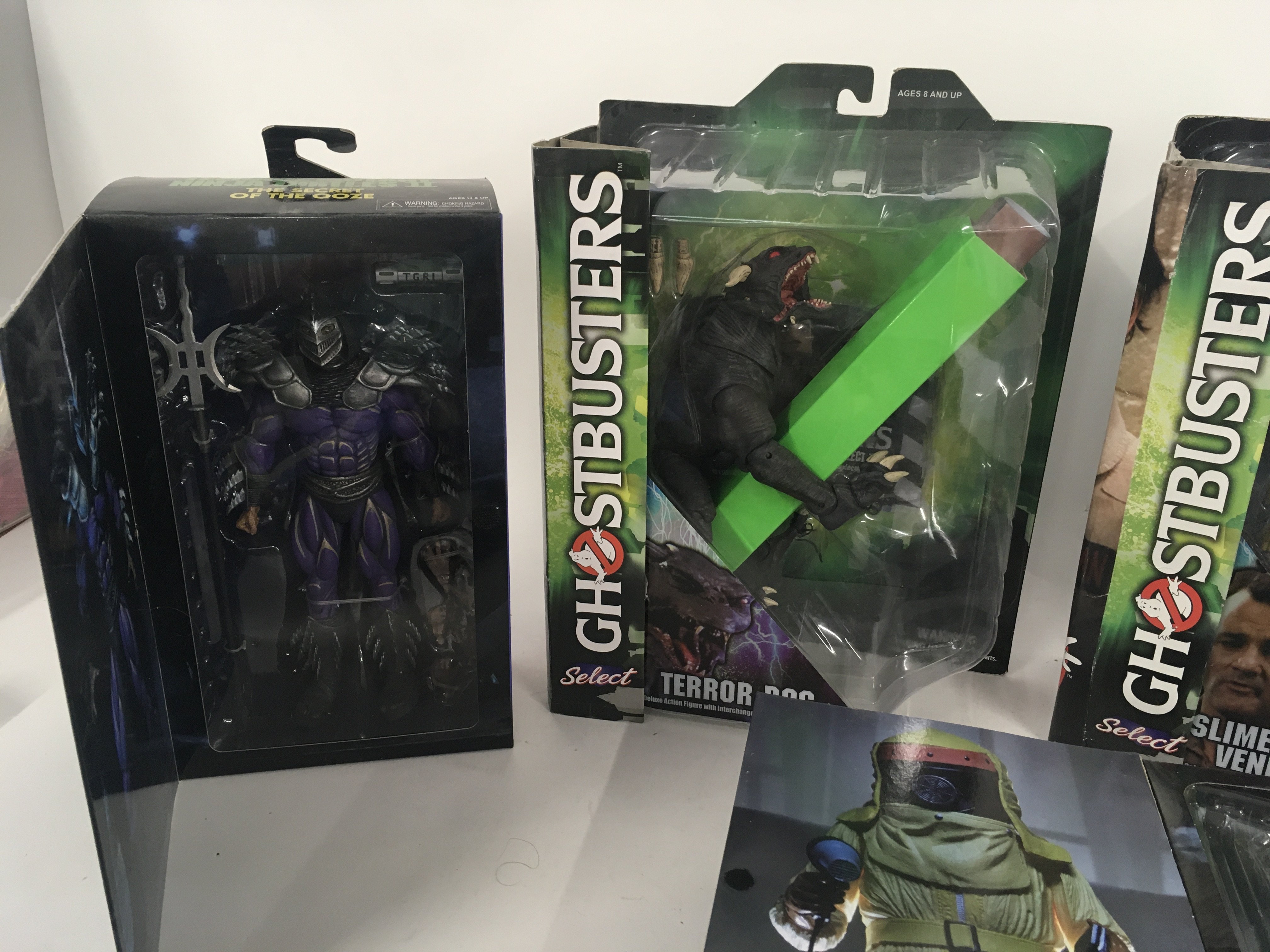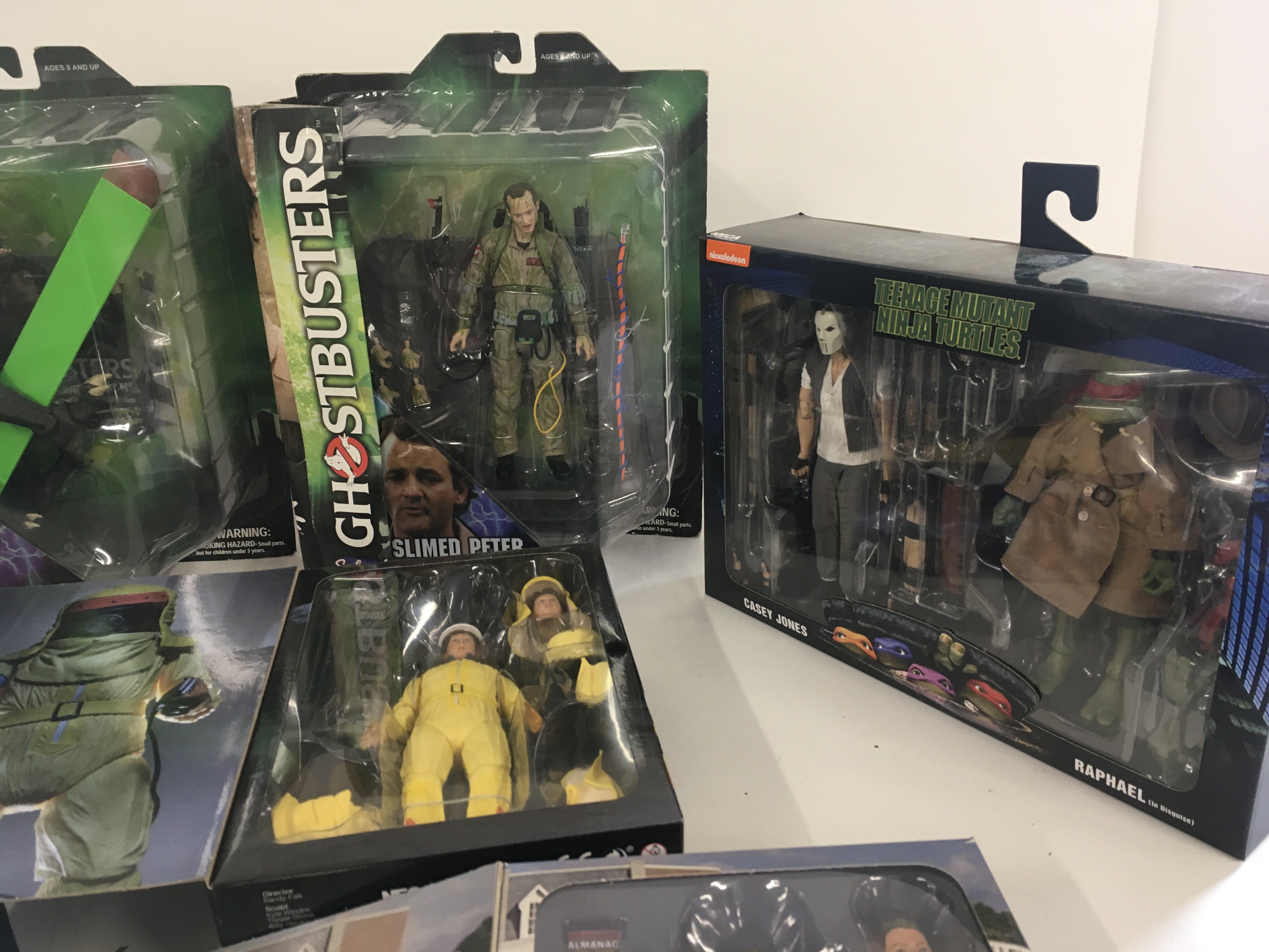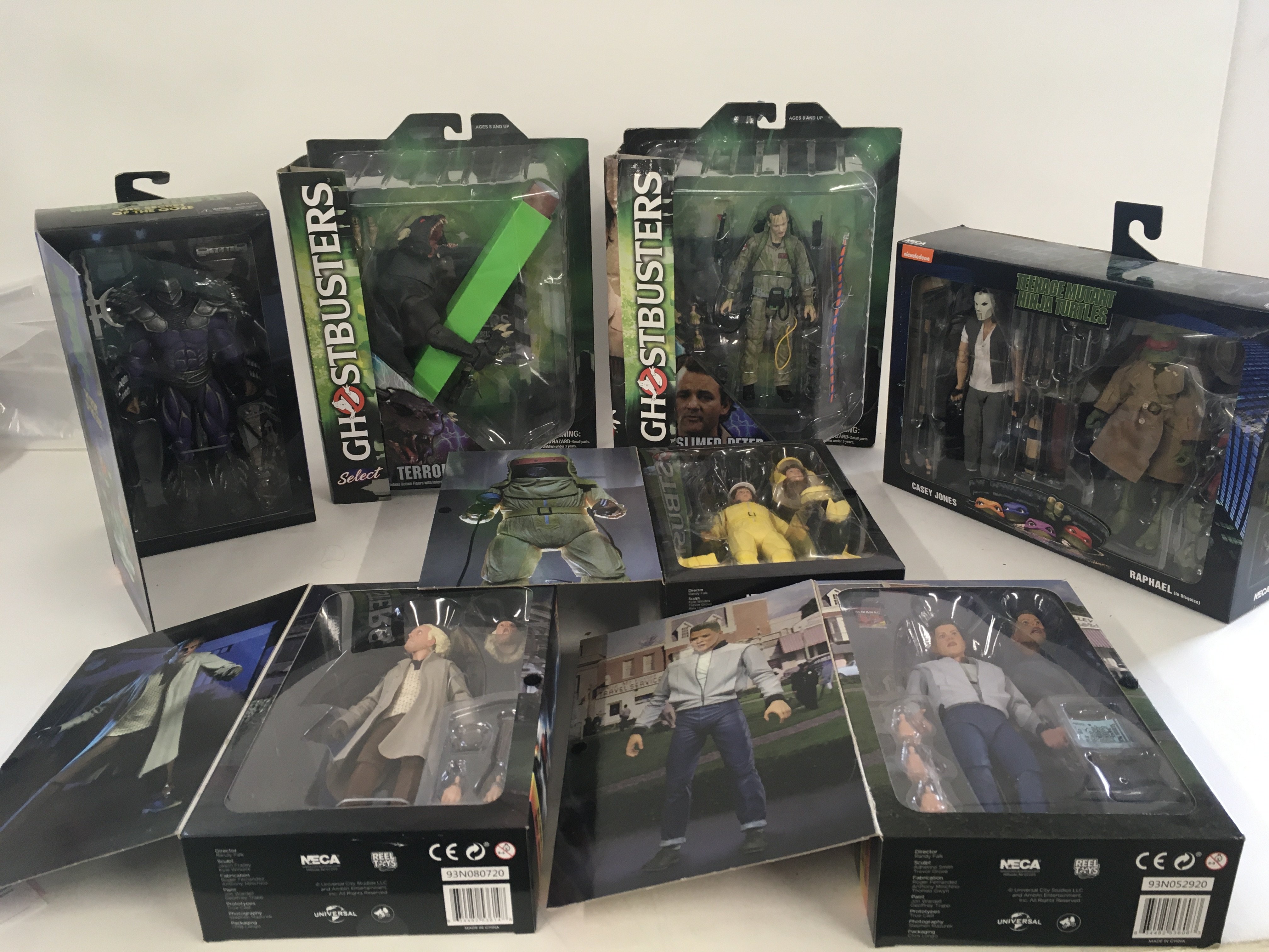 A collection of 7 boxed action figures from the 1980s including Back to the Future ..Ghostbusters and Teenage Mutant Ninja Turtles.